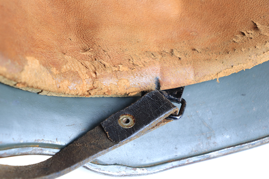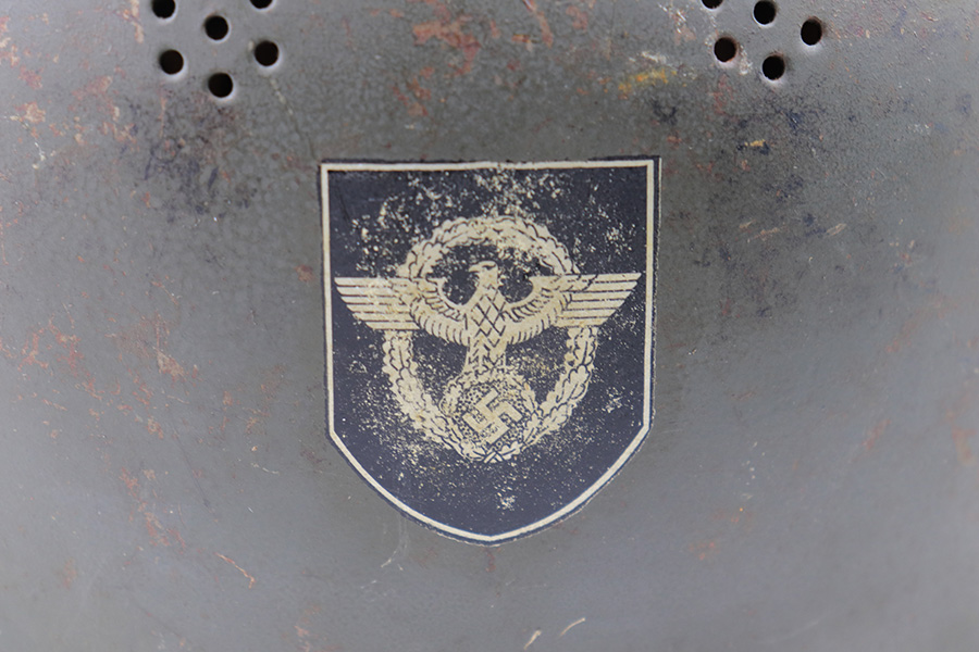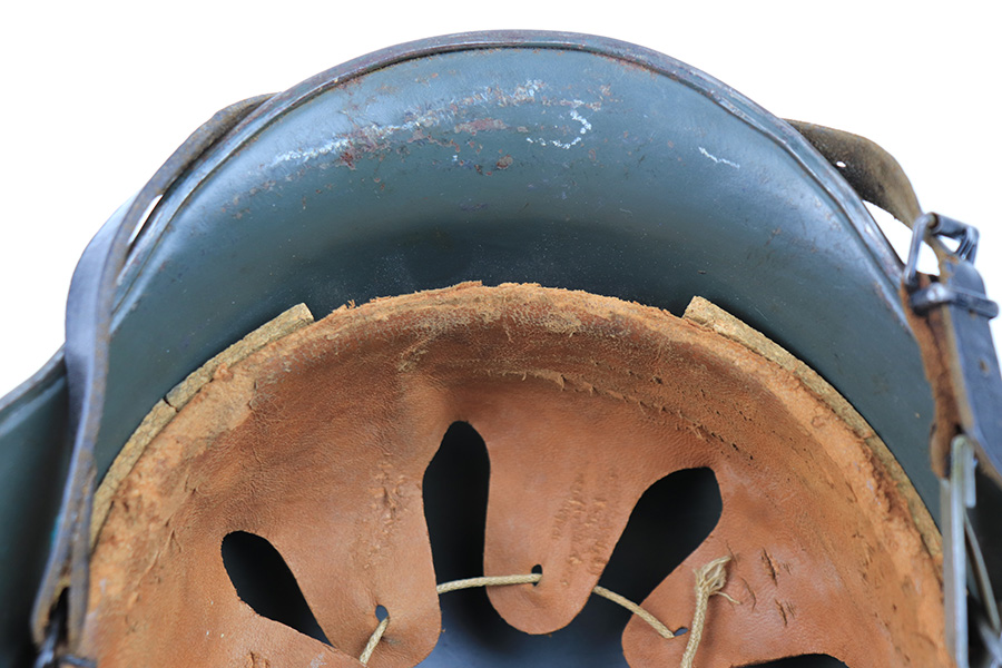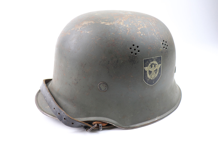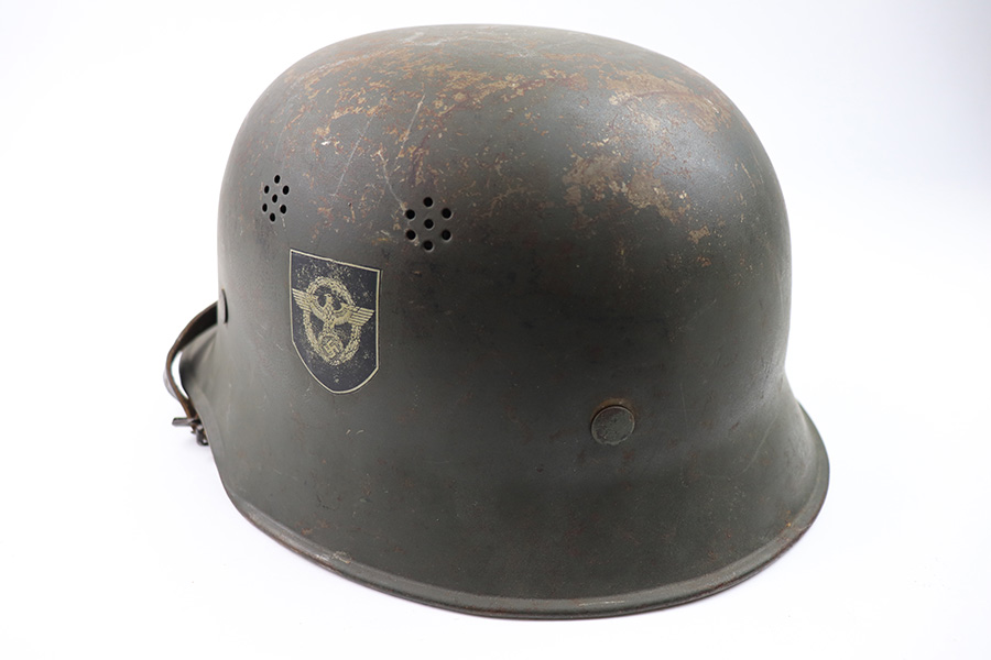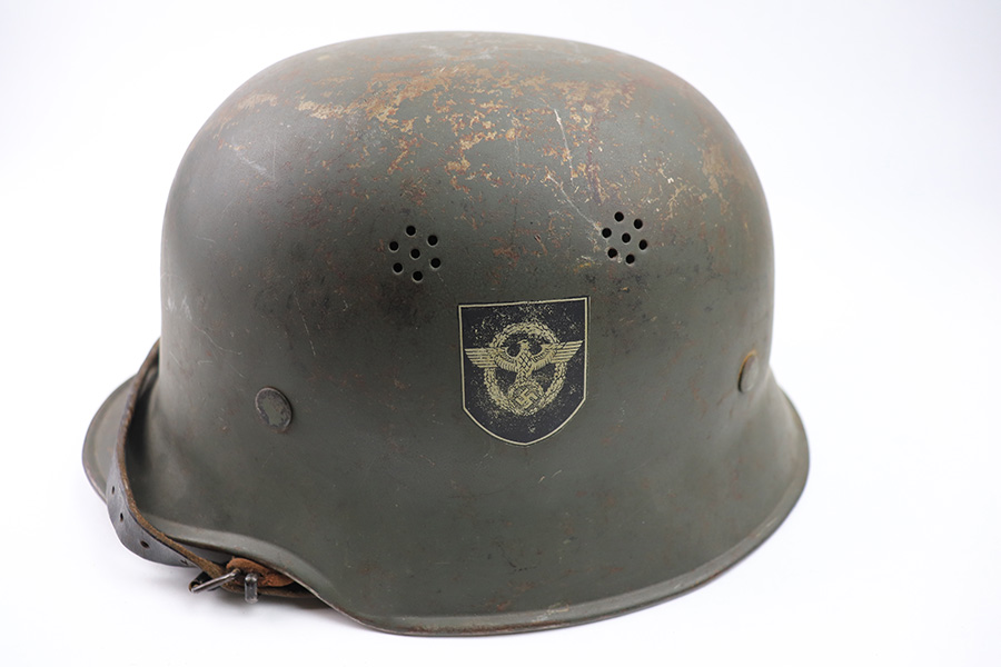 1/6/23 – This is an original double-decal M34 Police helmet, issued for field or combat use. These are fairly rare variation police helmets. The helmet has olive green exterior paint that’s in great overall condition with some mild paint loss and surface patina, mostly near the rounded areas towards the crown of the shell. The decals are both in great condition as well with about 85-90% of each decal intact. There are no dents or notable flaws on the shell. The interior leather liner has some mild tattering but is in great overall condition. Comes with an original leather chin strap as well.