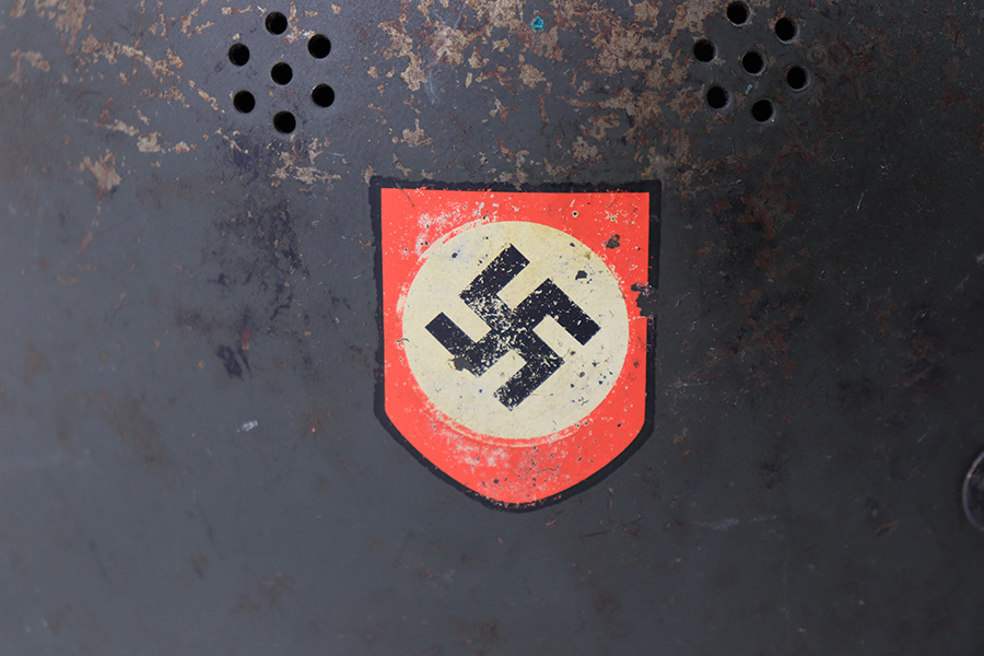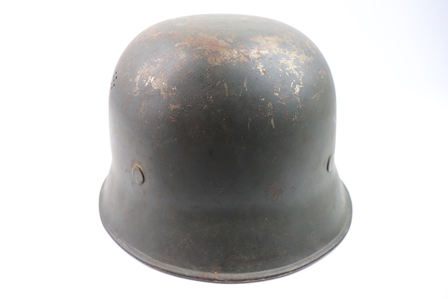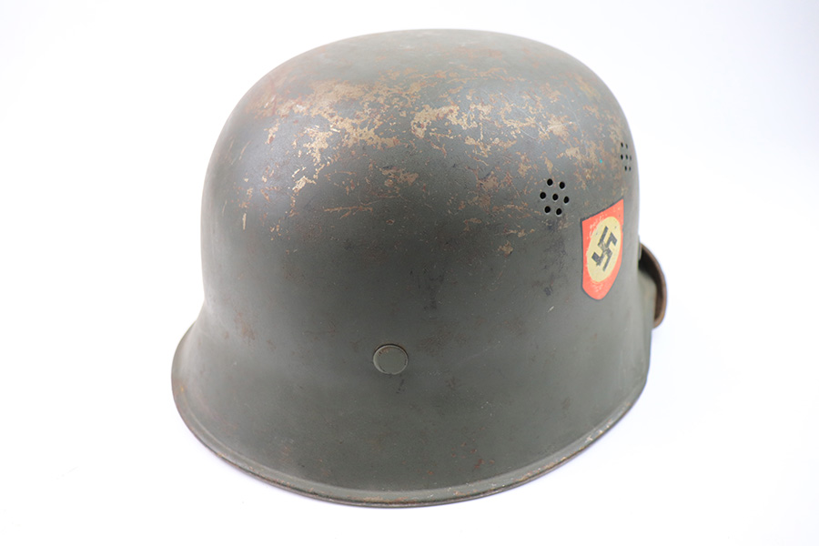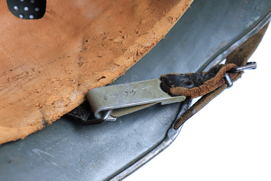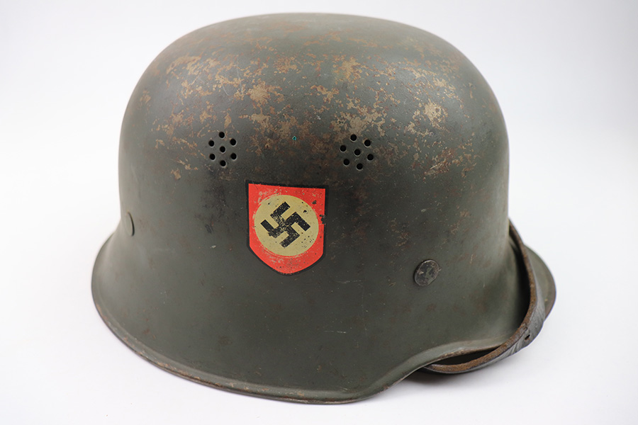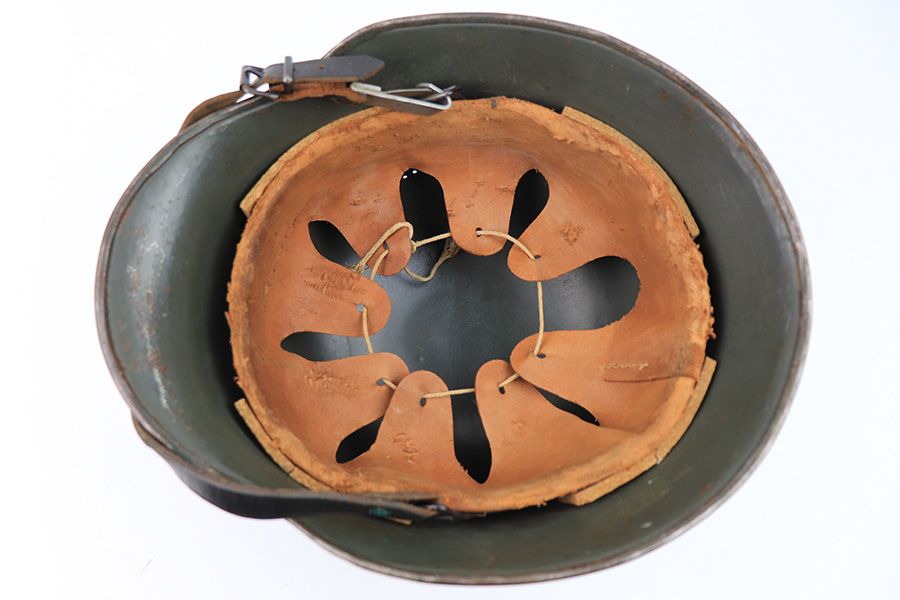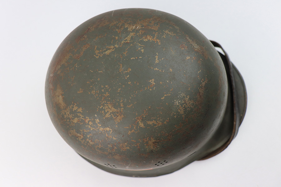 1/6/23 – This is an original double-decal M34 Police helmet, issued for field or combat use. These are fairly rare variation police helmets. The helmet has olive green exterior paint that’s in great overall condition with some mild paint loss and surface patina, mostly near the rounded areas towards the crown of the shell. The decals are both in great condition as well with about 85-90% of each decal intact. There are no dents or notable flaws on the shell. The interior leather liner has some mild tattering but is in great overall condition. Comes with an original leather chin strap as well.