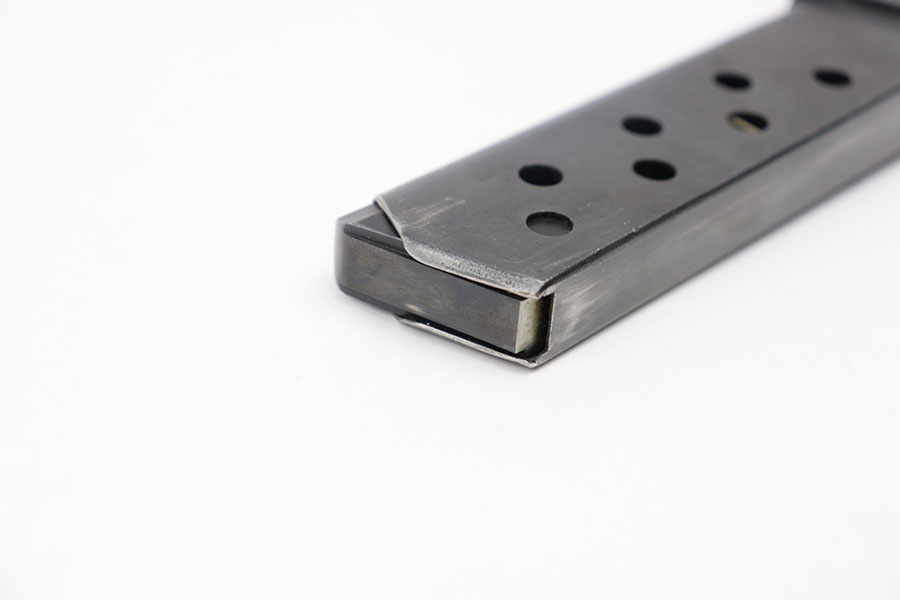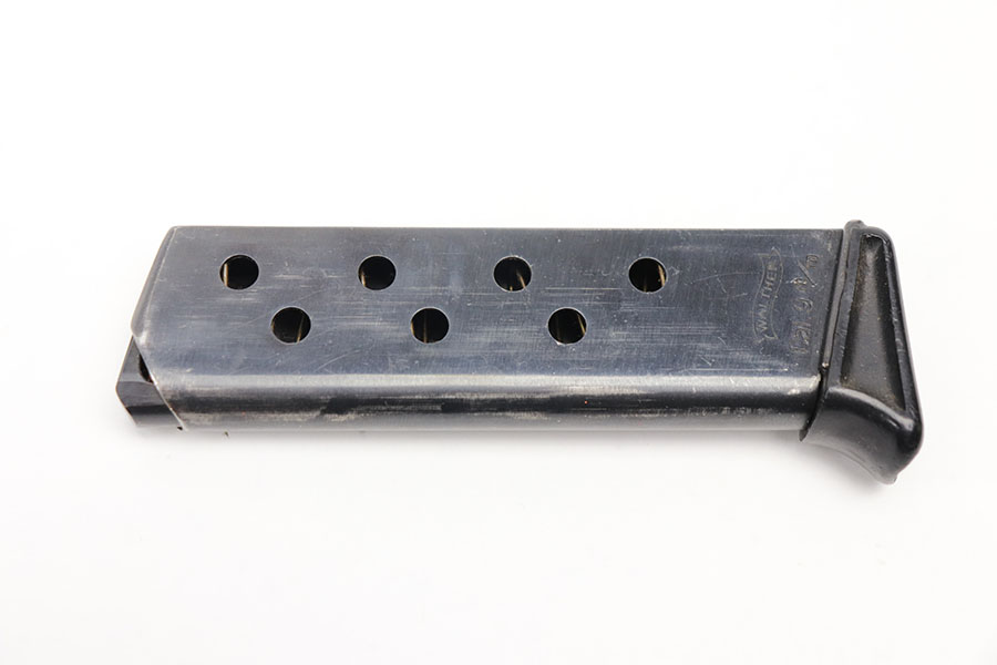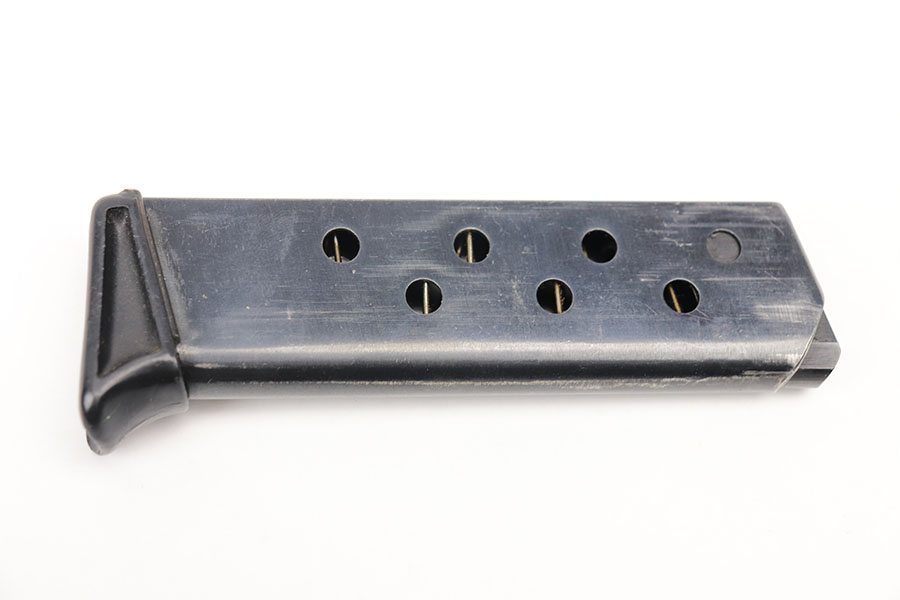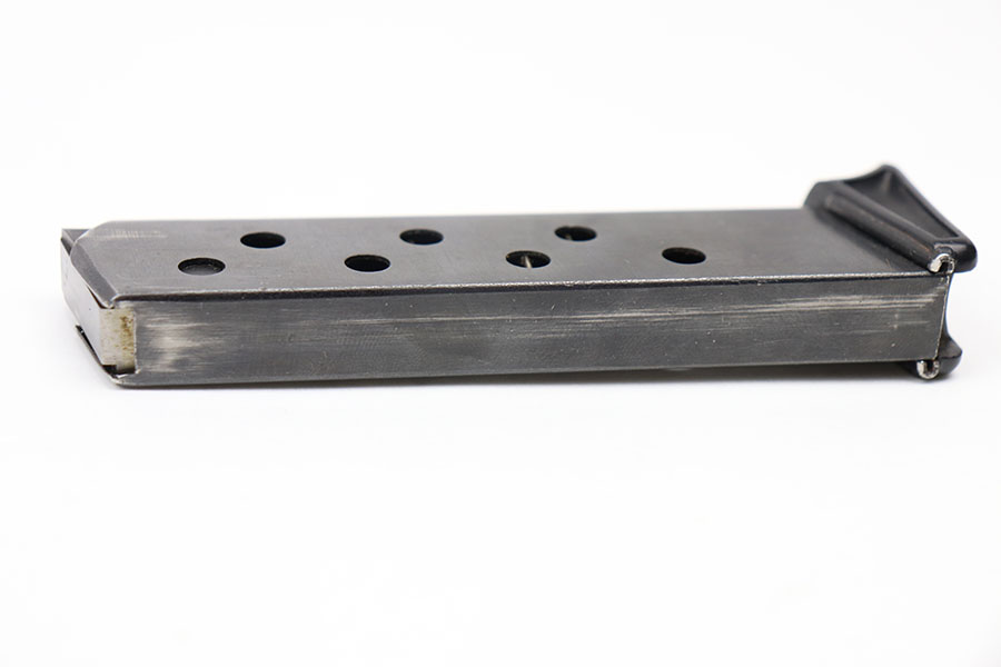 4/5/21 – This is an excellent, fairly early / pre WW2 production finger extension 9mm (.380) magazine. The magazine has excellent high polish bluing and a thin-lipped bakelite finger extension. There are no cracks or chips. The spring is strong and fully functional.