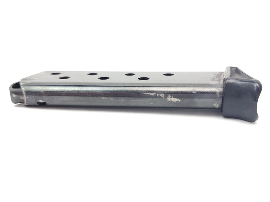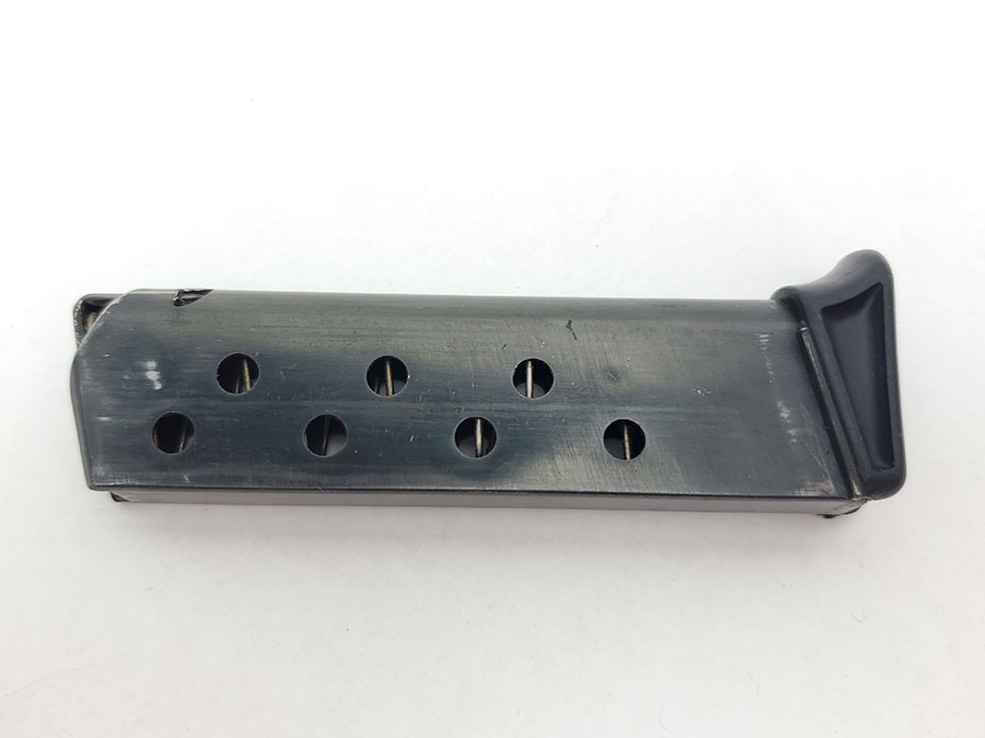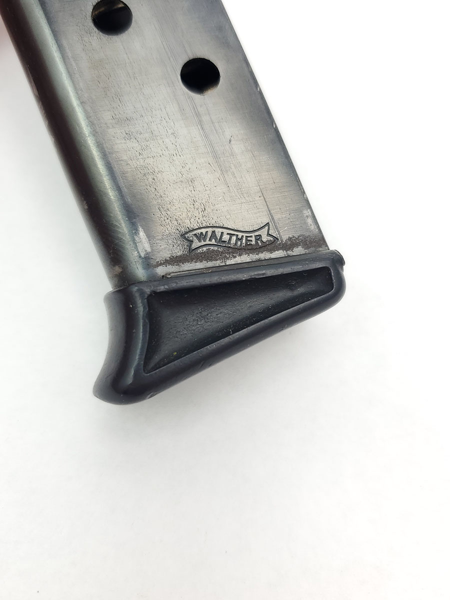 6/16/20 – This is an original Walther PP finger extension magazine. The magazine is the earlier style with a high polish finish and a thin lipped finger extension. There is a light line of discoloration under the Walther banner, and some very small areas of finish loss, but overall in great shape. No cracks or chips on the finger extension.