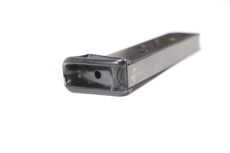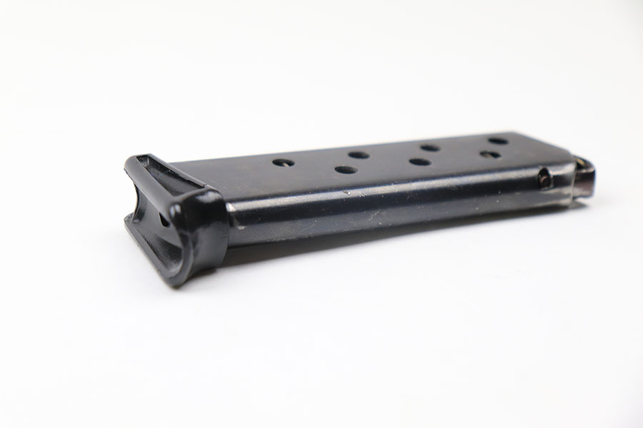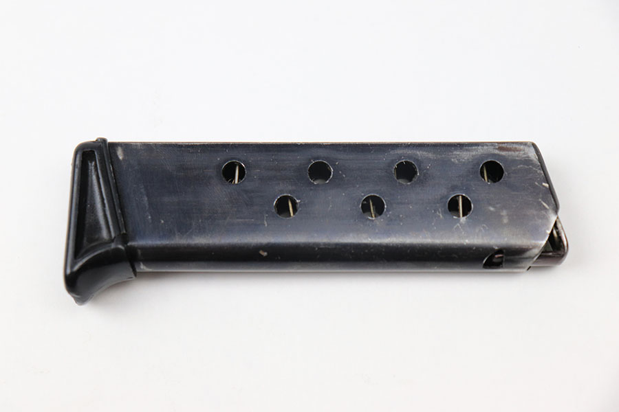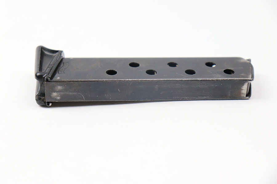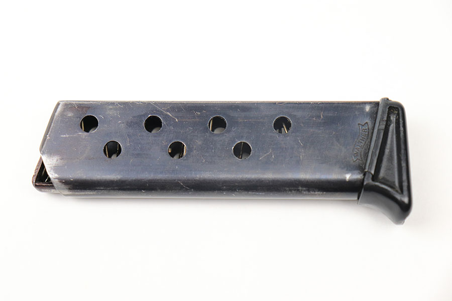 11/17/21 – This is an early variation Walther PP Finger Extension magazine. The magazine has a high polished finish and a thin-lipped bakelite finger extension. The finish is great throughout with some minor finish loss but no rust or pitting. Strong spring. The base has a few minor dings and small cracks but none that are too significant.