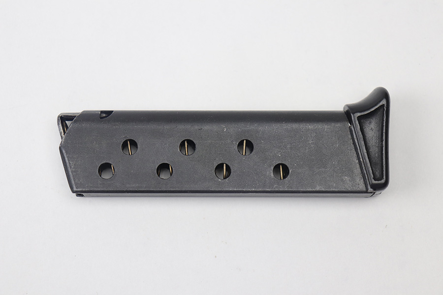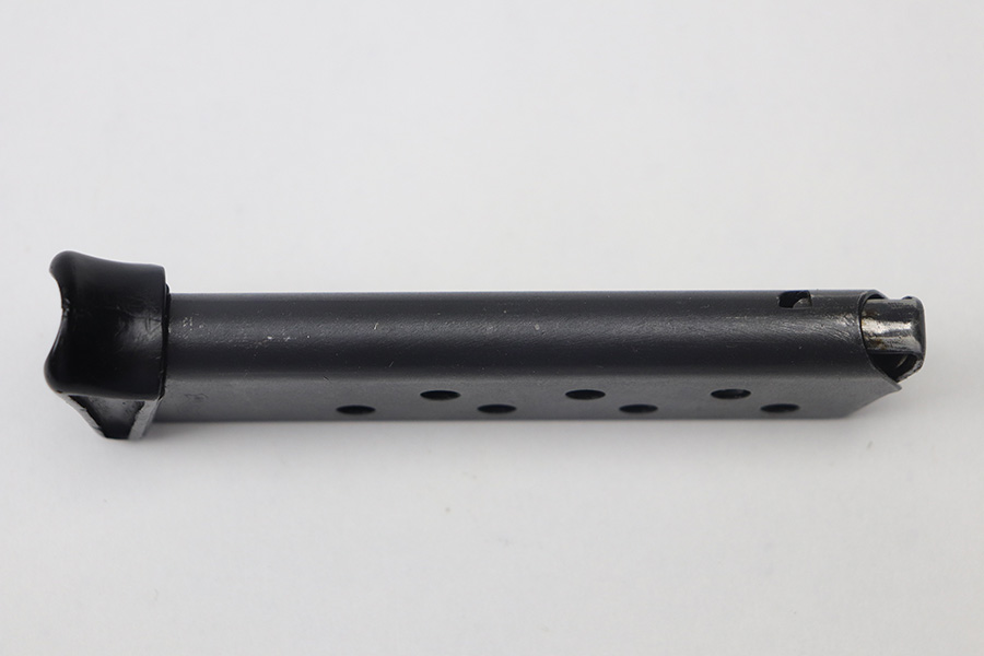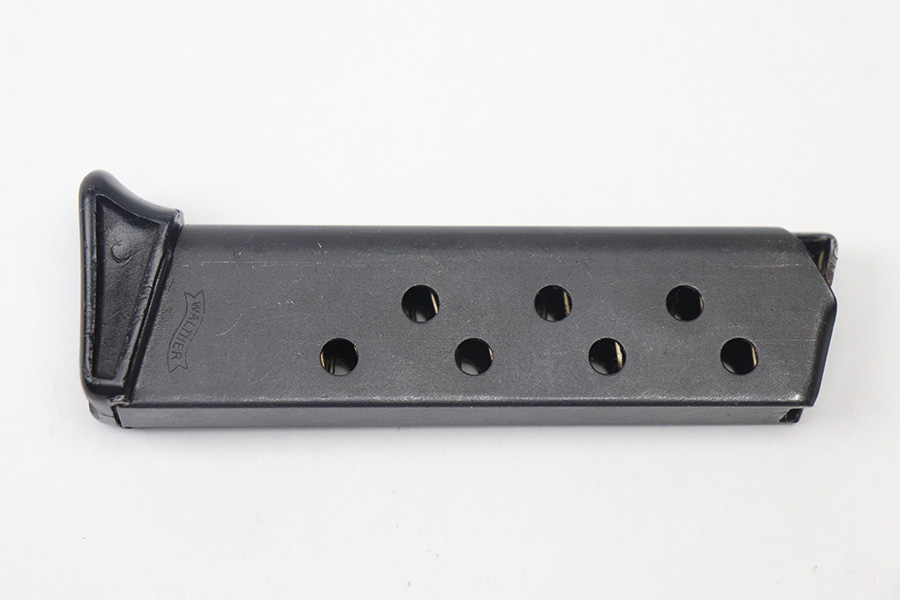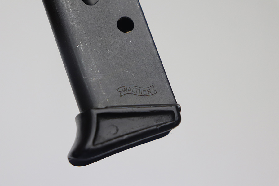 11/18/21 – This is an excellent Walther PP finger extension magazine. The magazine has very nice dull blued finish throughout with minimal finish loss. Comes with an early thin lipped bakelite finger extension. Spring is strong and fully functional.