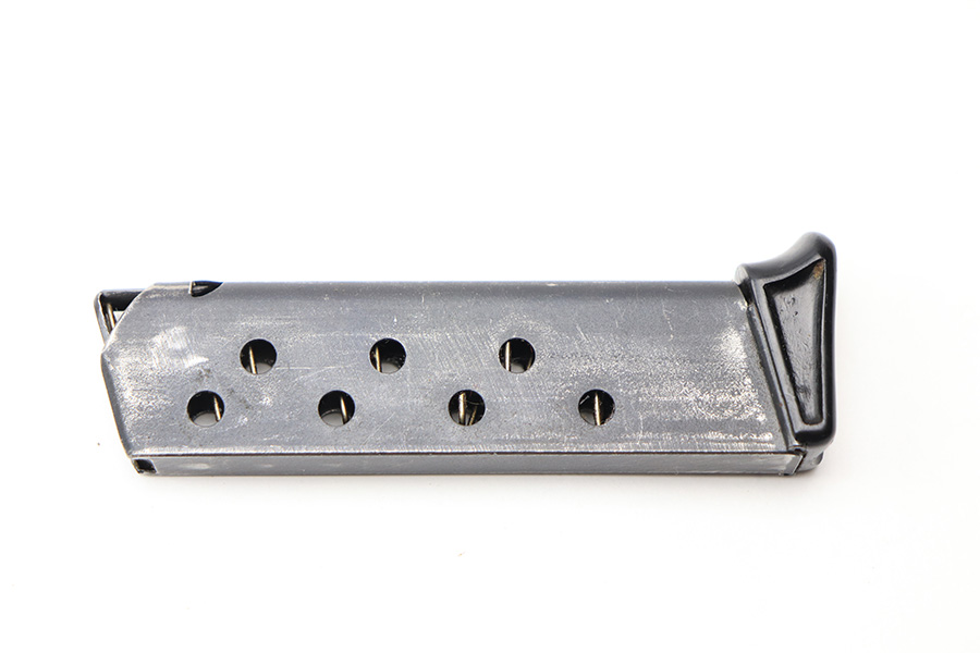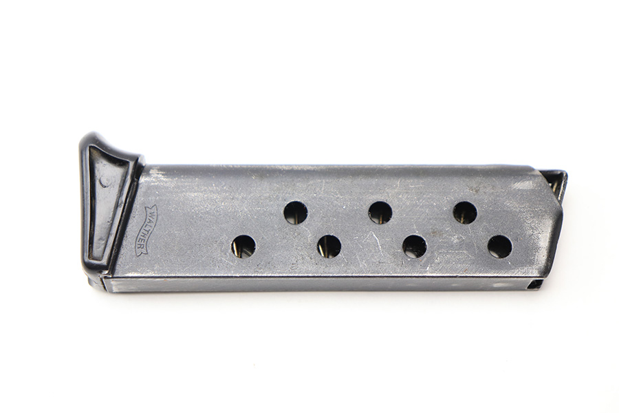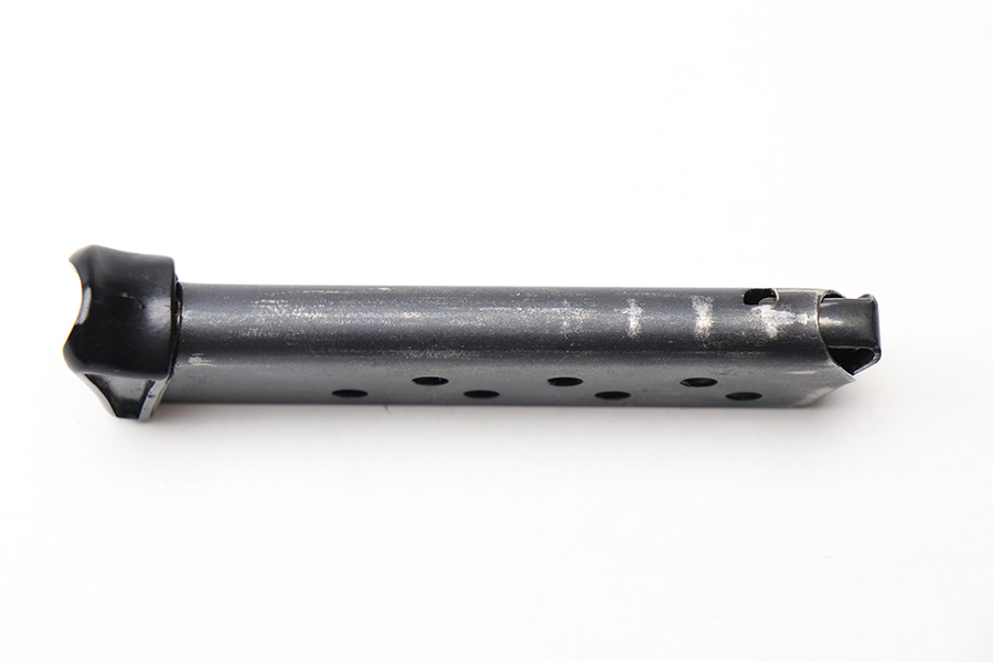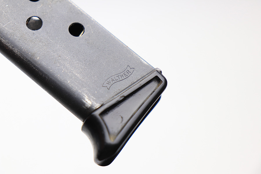 2/20/22 – This is a Walther PP magazine with a black bakelite finger extension. The magazine has a dull blued finish and early Walther banner stamp on the left side of the tube. The base is an early thin-lipped style and has no cracks. The magazine tube has some mild finish loss but no rust or pitting. The spring is functional.