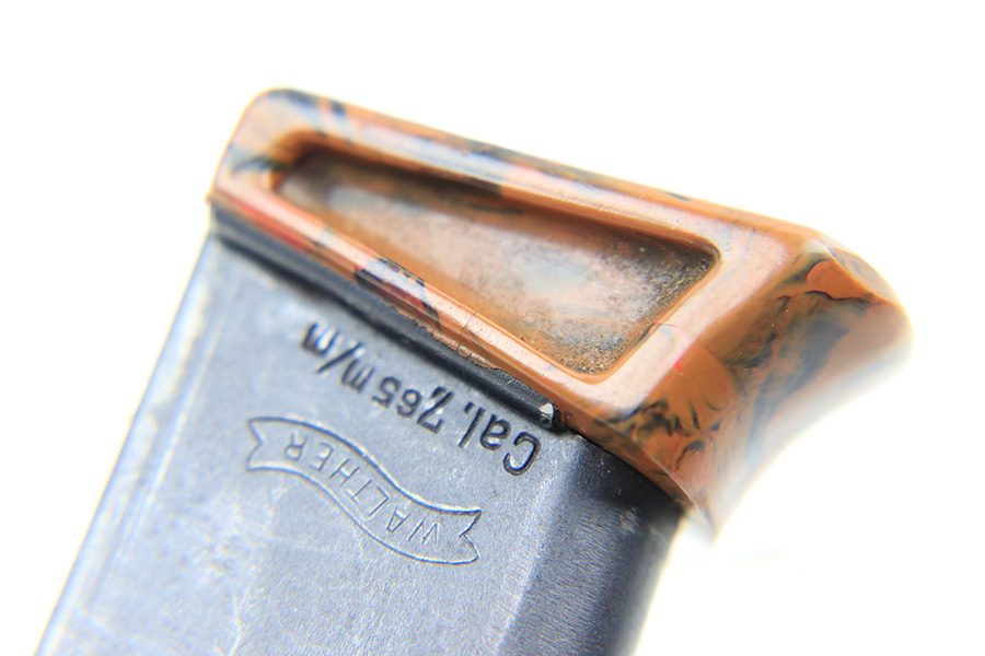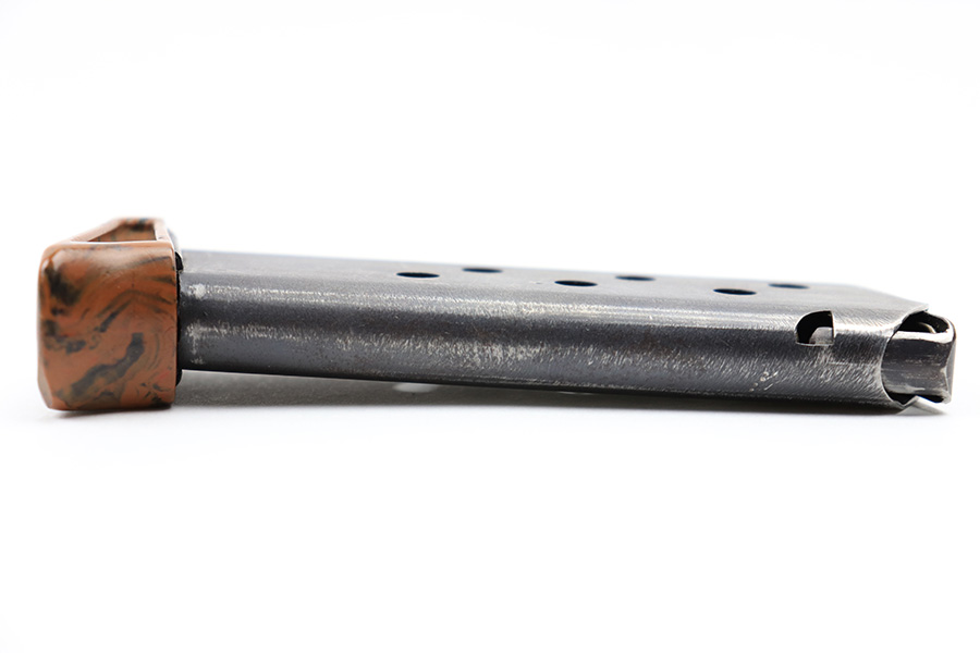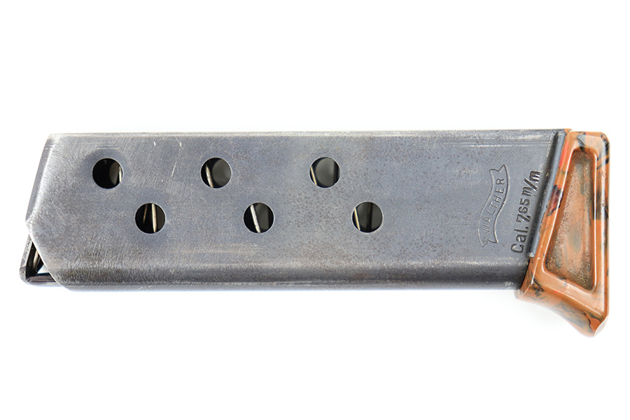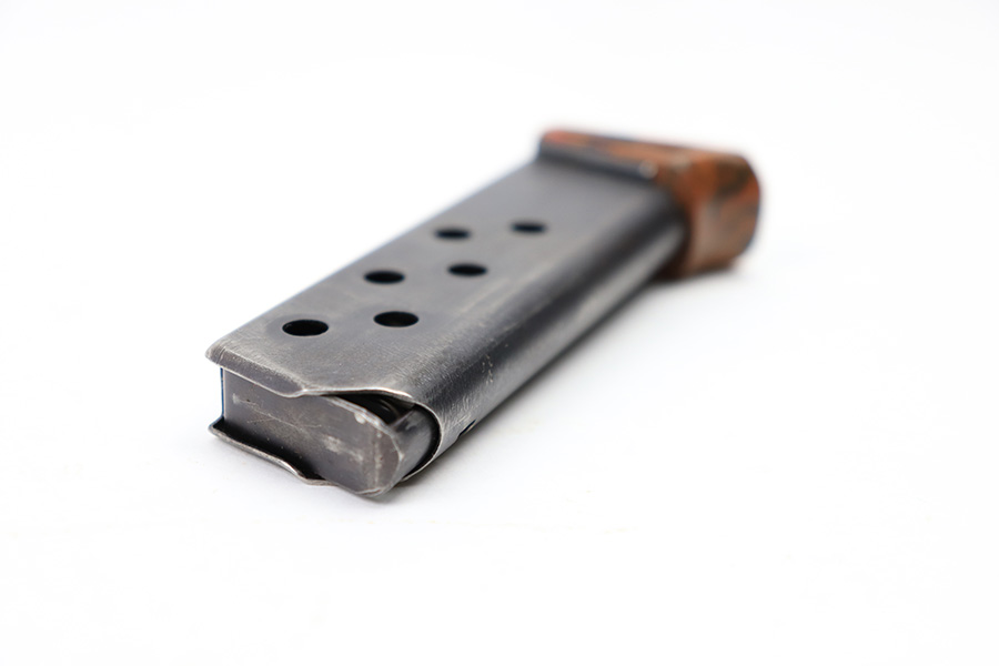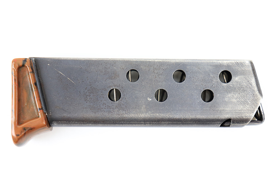 6/24/22 – This is an original Walther PPK finger extension magazine. The magazine is in great condition with a dull wartime finish that has some mild thinning but no rust or pitting. The bakelite finger extension has no significant cracks or chips. Fully functional spring.