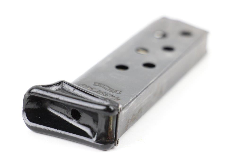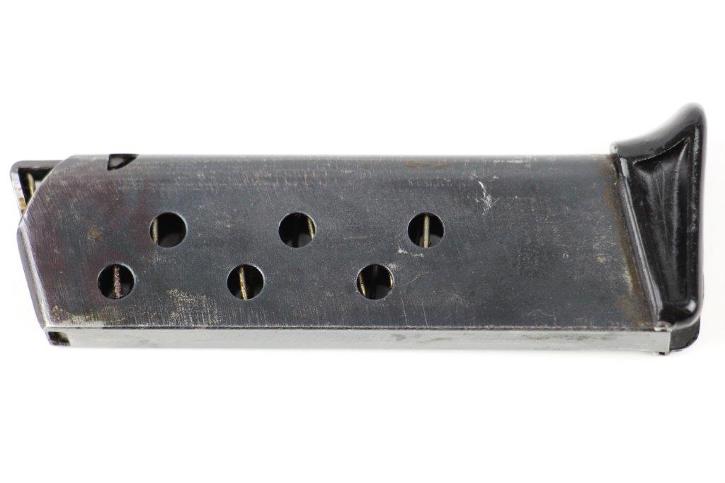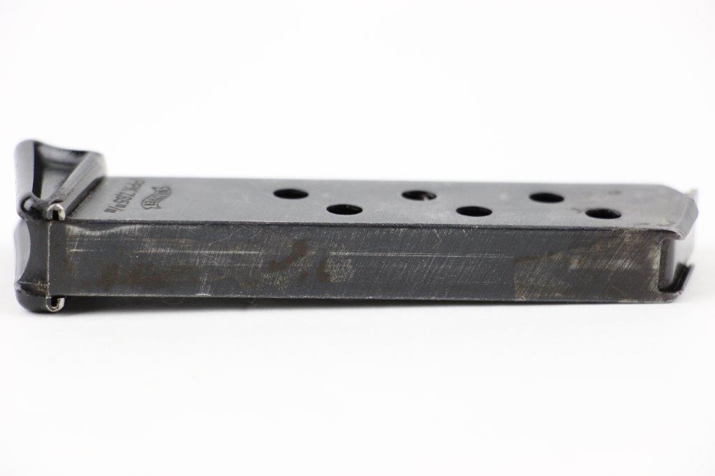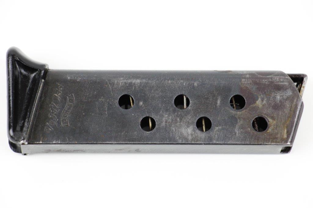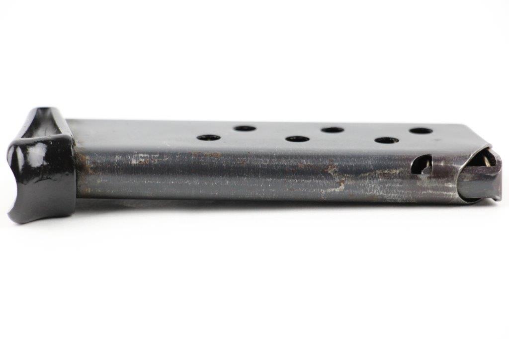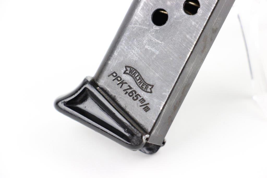3/4/24 – This is a transitional / wartime variation Walther PPK magazine with a black finger extension base. The bakelite base is in great condition with a few very minor surface blemishes, but no major issues or cracks. The base is thin-lipped which is an earlier style. The magazine tube has some light finish loss but no rust or pitting. The magazine markings and finish are wartime, which again makes this a transitional example with both earlier and later features. Fully functional spring.
