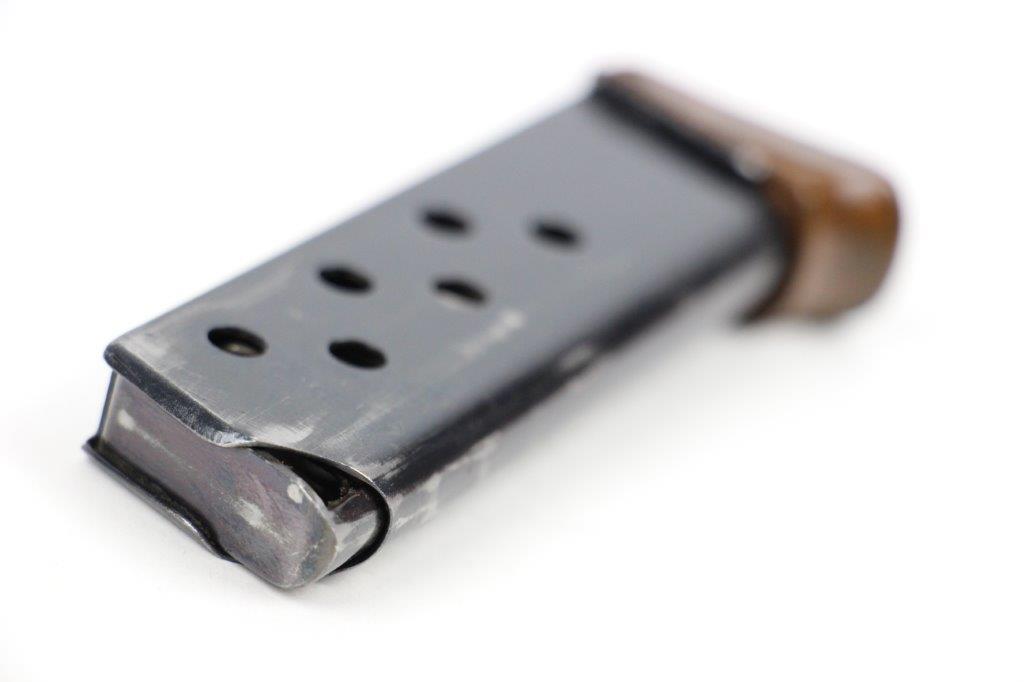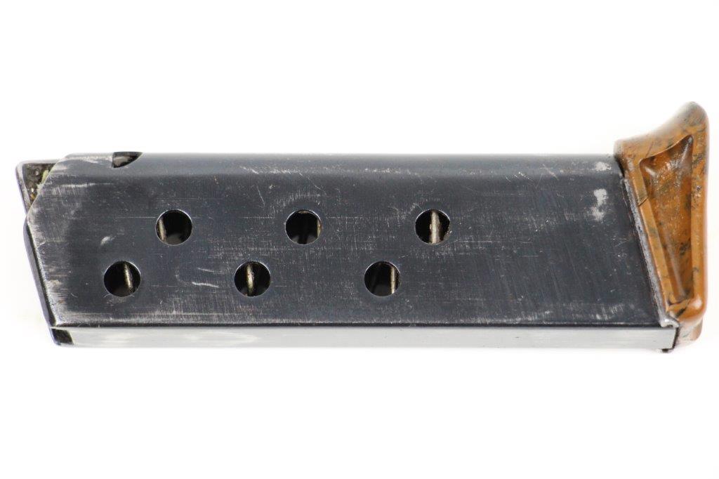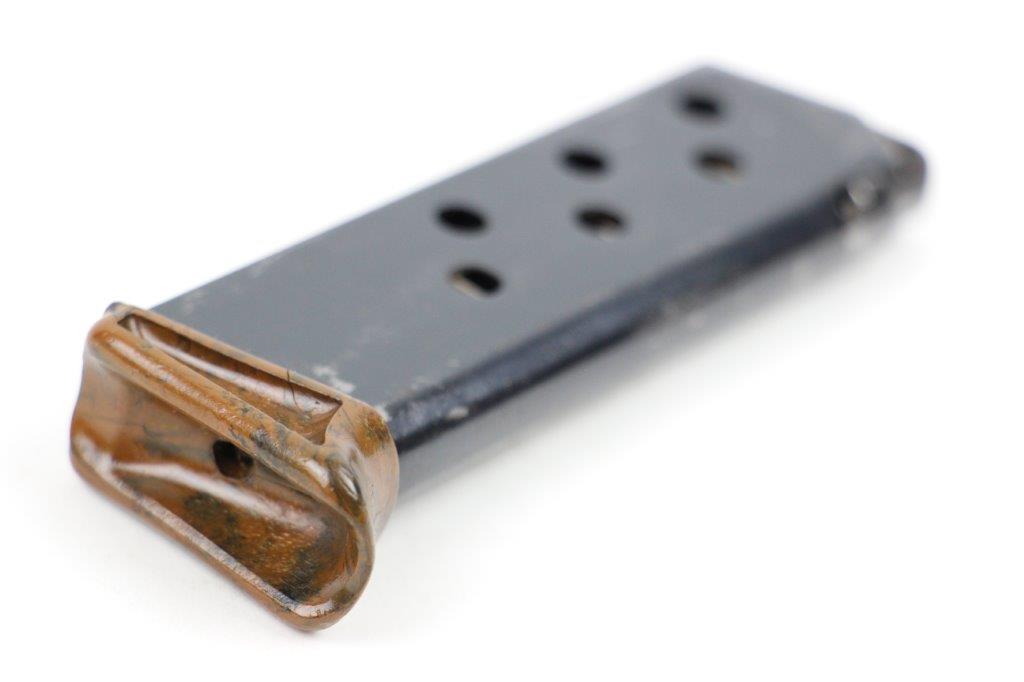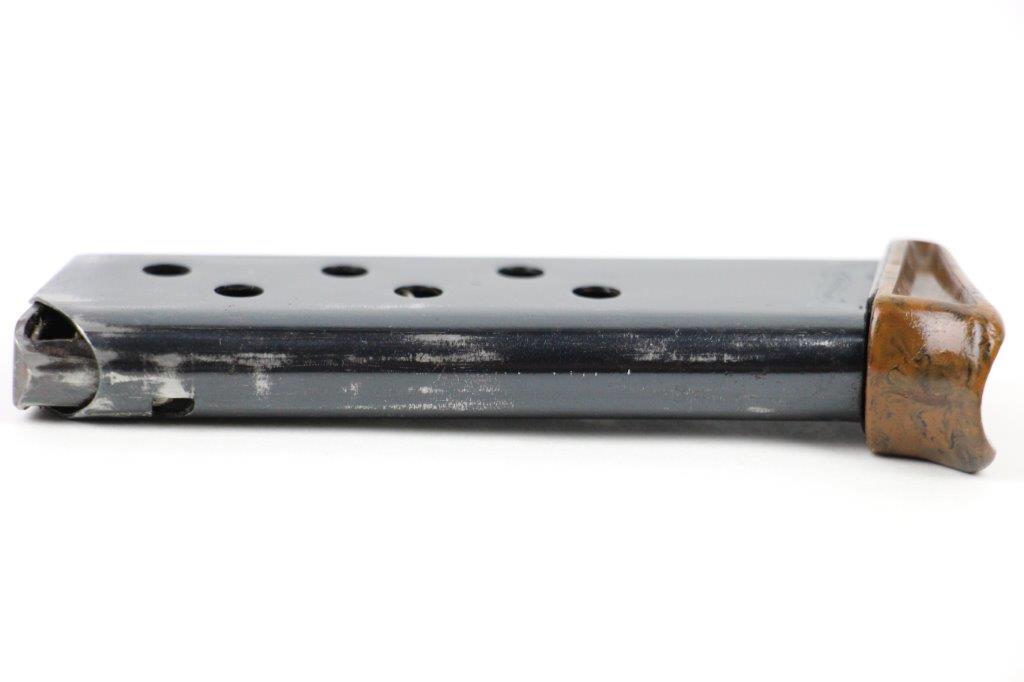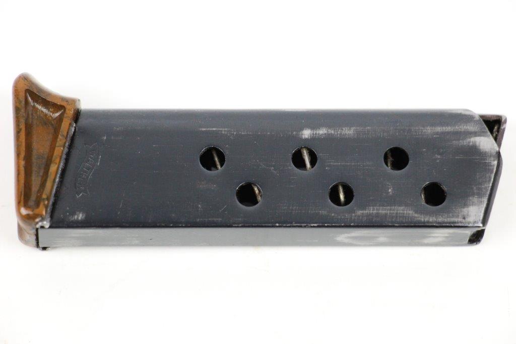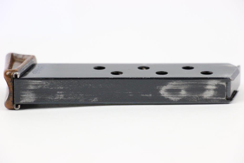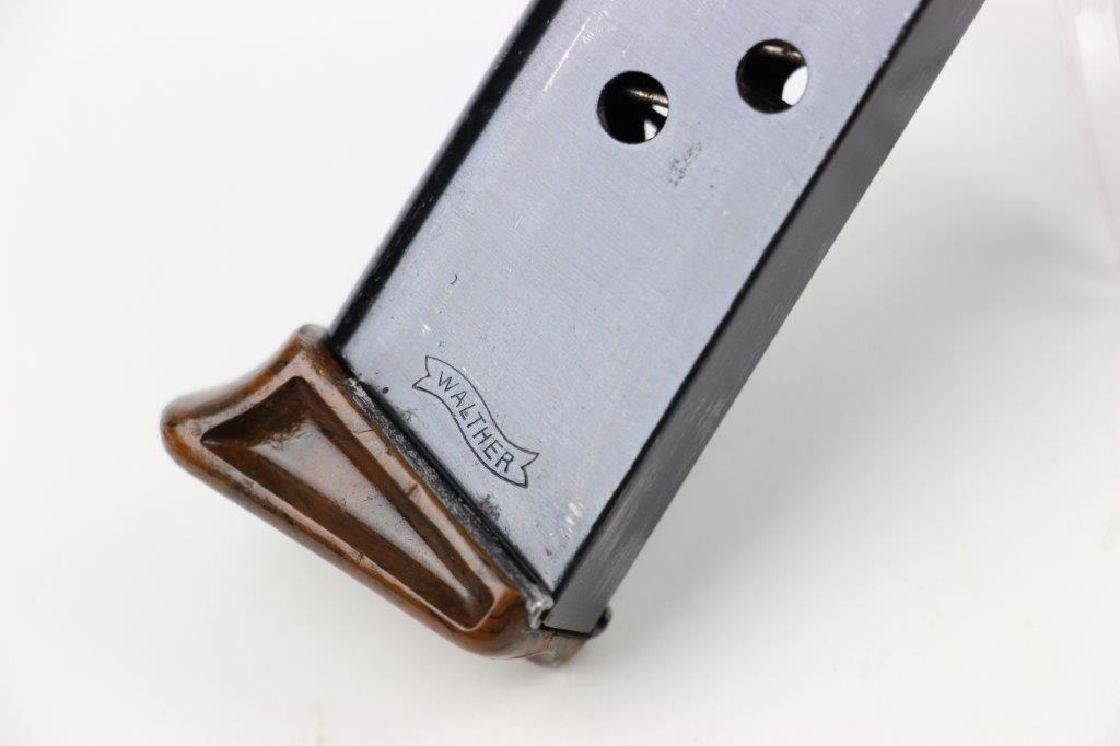 5/1/24 – This is an early WW2 variation Walther PPK Finger Extension Magazine. The magazine has a high polish blued finish and Walther banner stamp on one side of the base. There’s spotty finish loss but no rust or pitting. Great overall condition. The finger extension base has a beautiful black and brown marbled finish with an early style thin-lip. There’s one hairline fracture on the right side of the finger extension, extending down from the base of the tube. This is very minimal, but worth noting. Strong, functional spring and great overall condition.