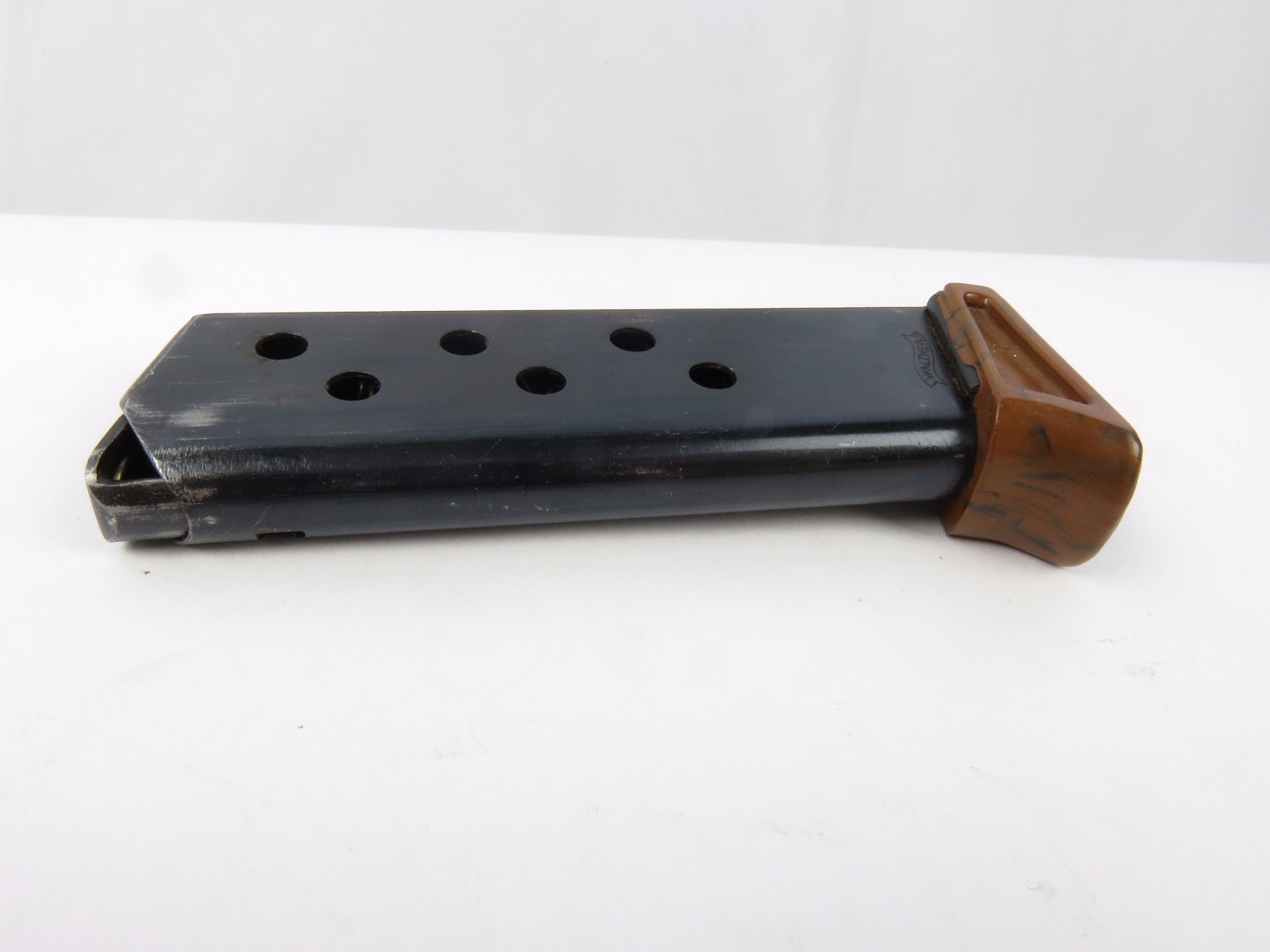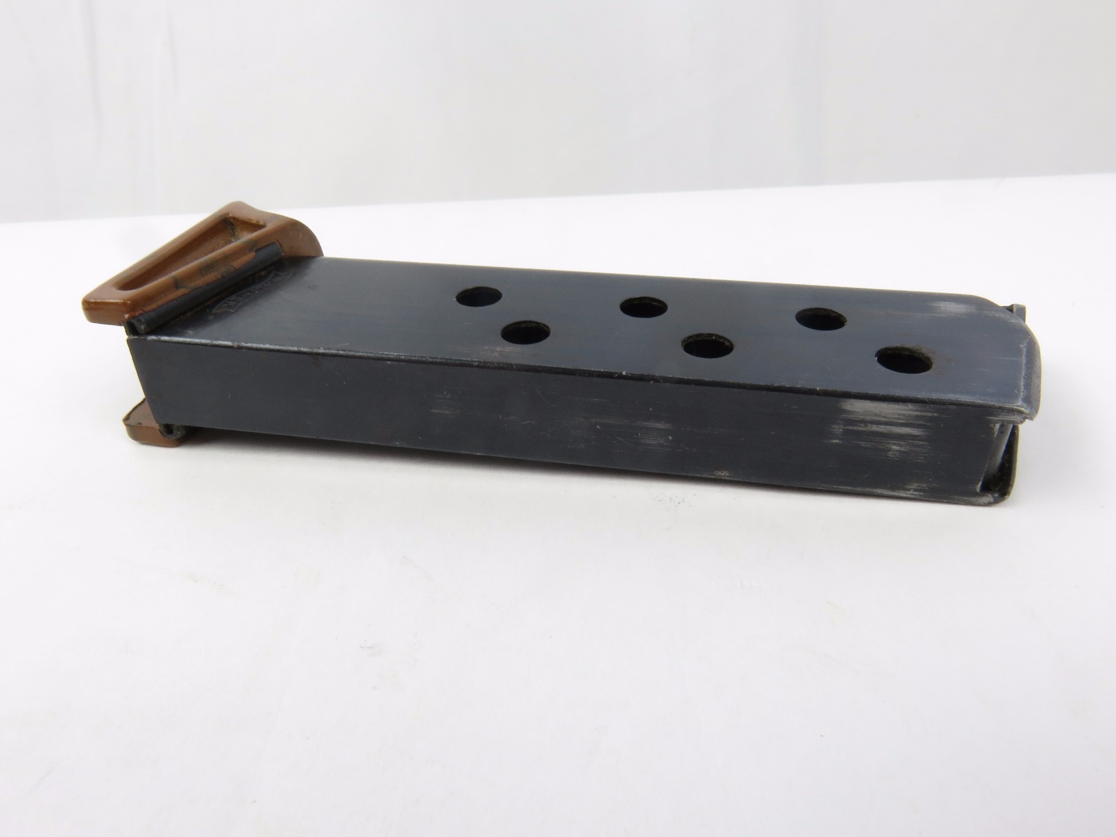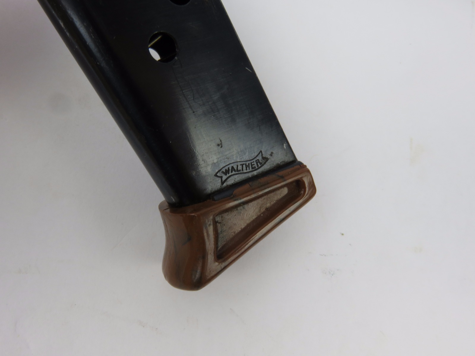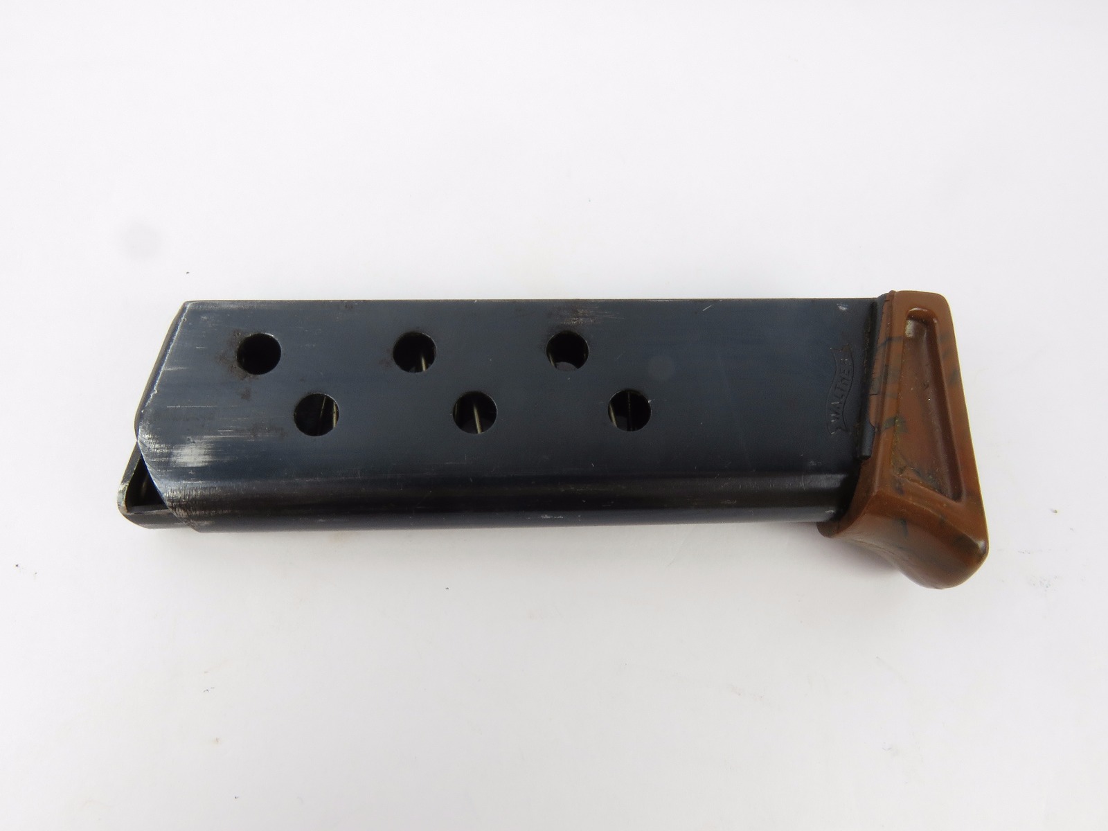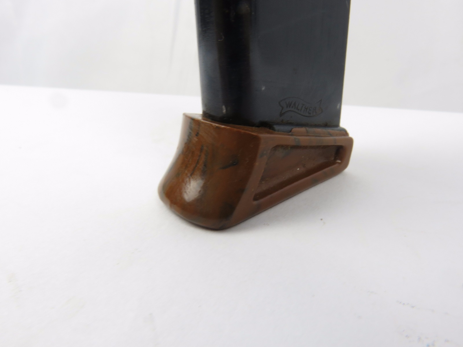 8/18/17 – This is an original Walther PPk finger extension magazine from WW2. The magazine has a very nice high polish blued frame with no rust or pitting. The left side of the frame has a Walther banner stamp only. The base is a thick lipped brown bakelite bottom, which makes this a semi-transitional magazine most likely made in the late 1930s or early 1940s. Guaranteed original and authentic, with a fully functional spring.
