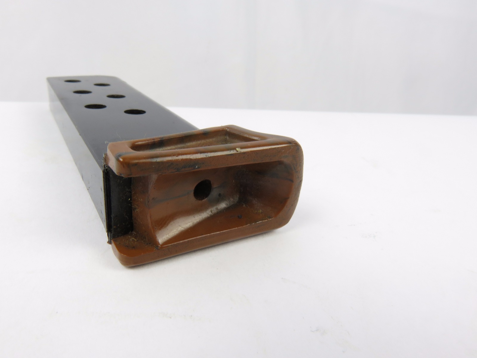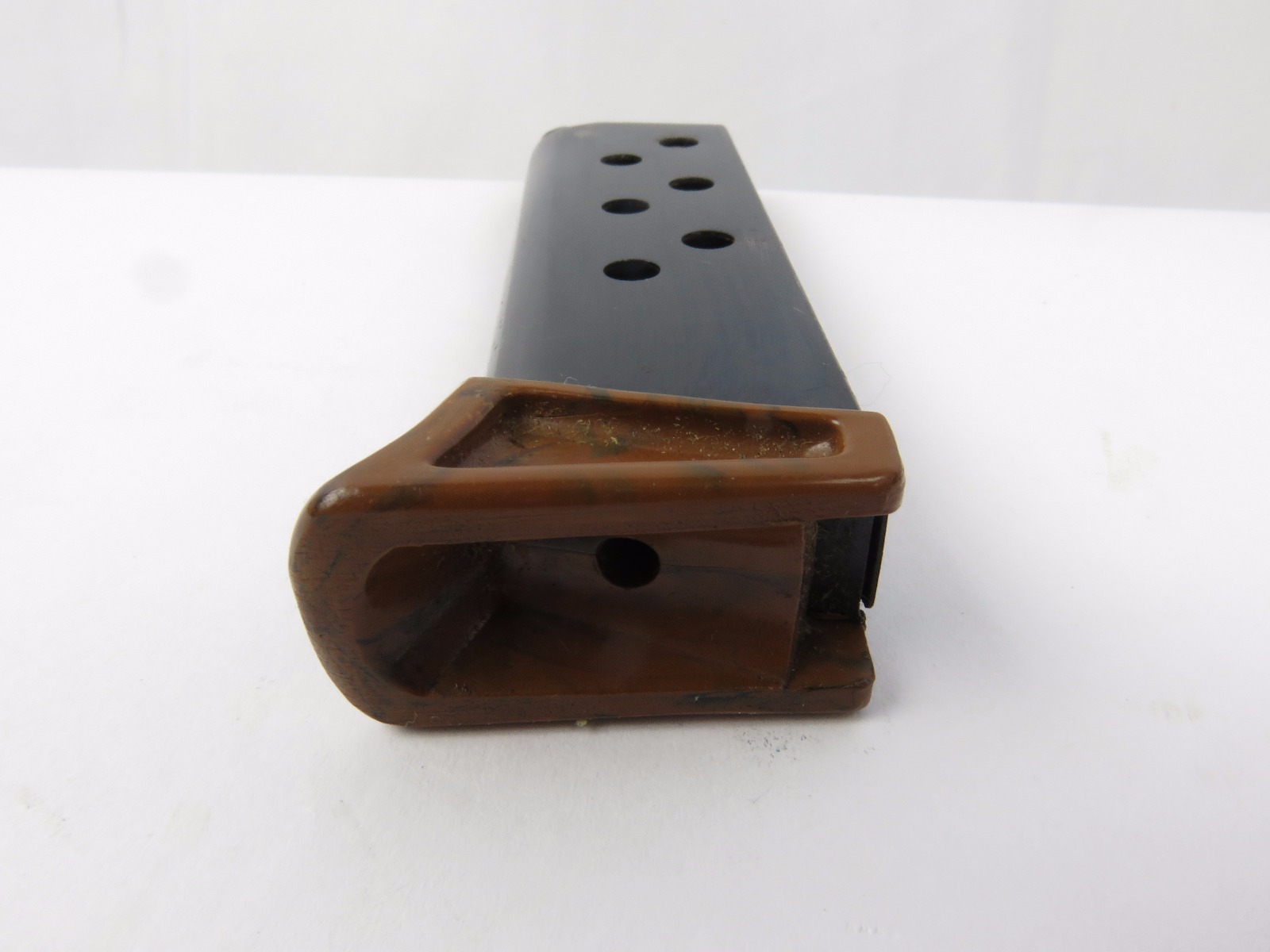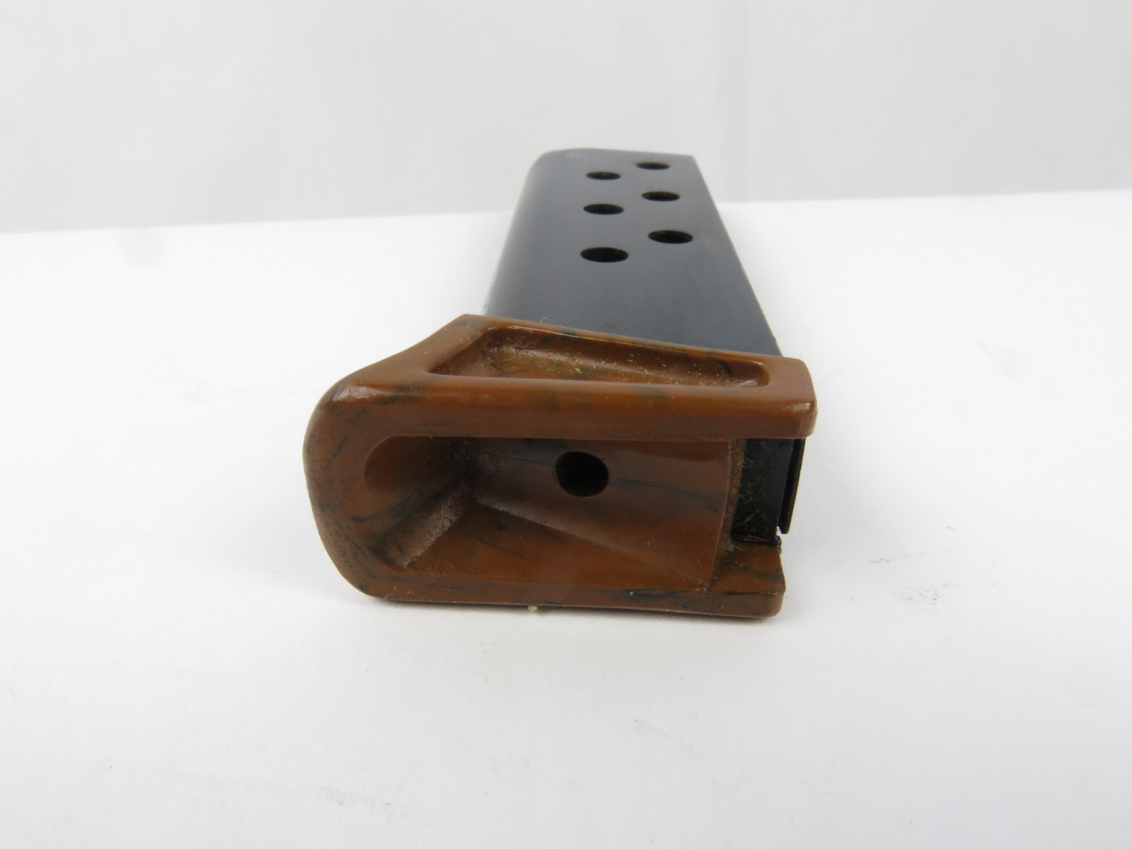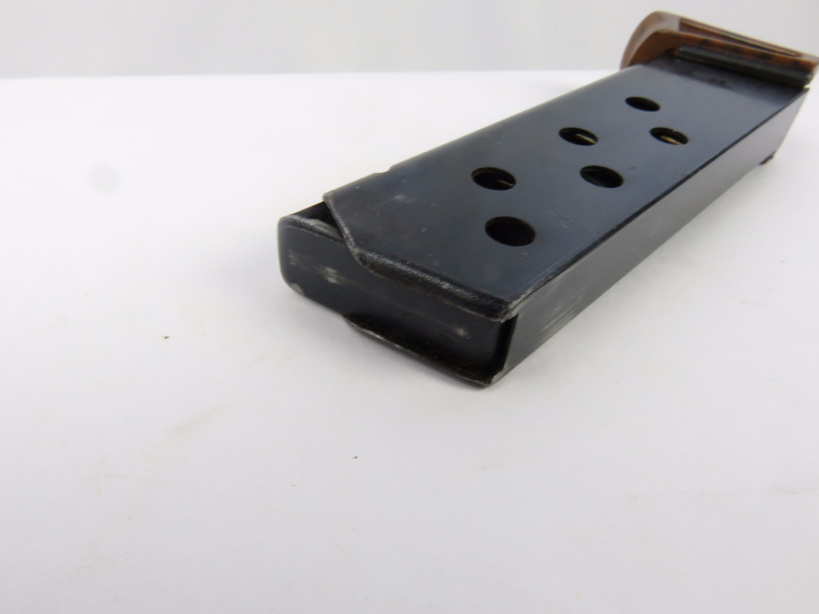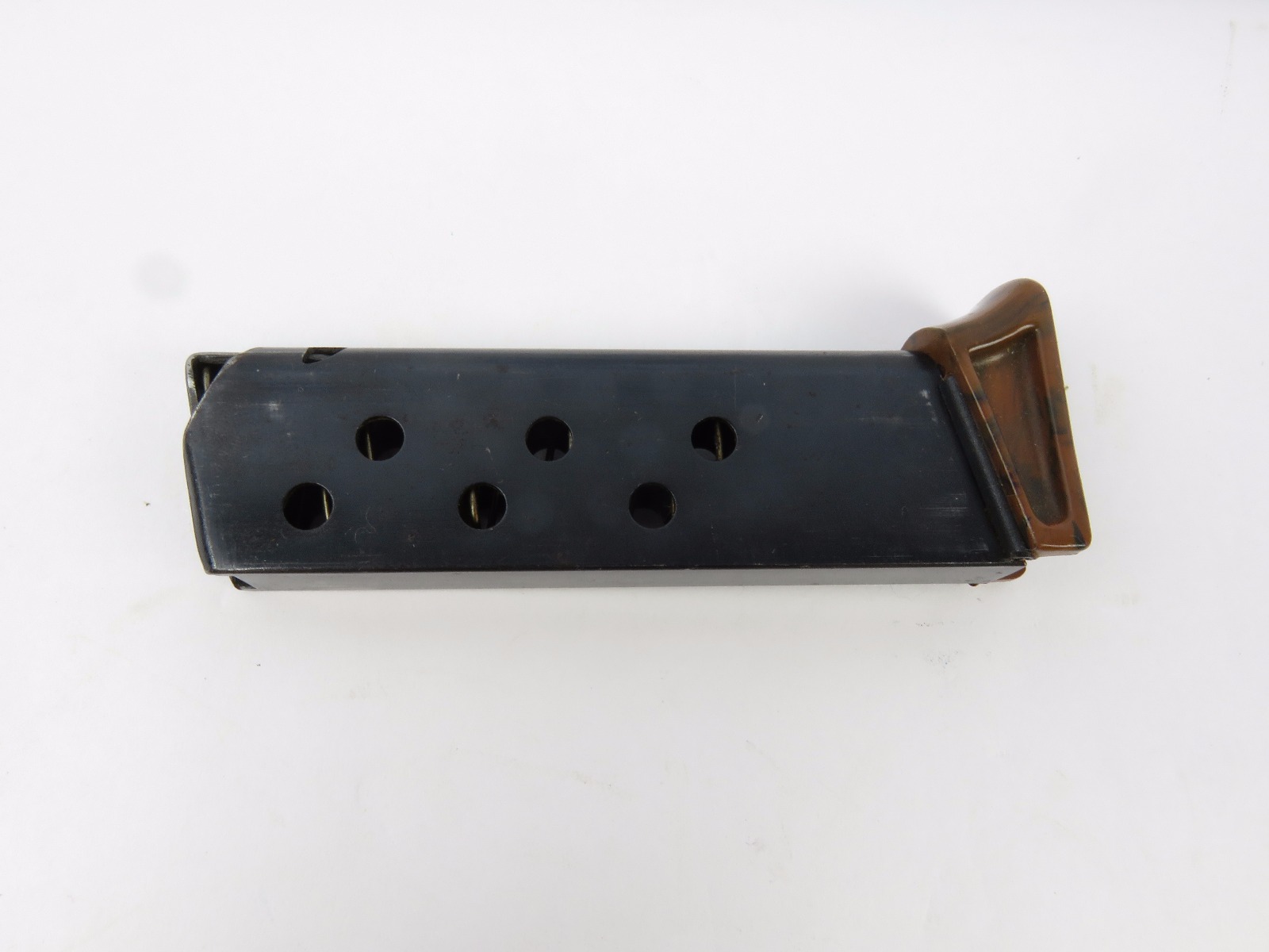 8/18/17 – This is an original Walther PPk finger extension magazine from WW2. The magazine has a very nice high polish blued frame with no rust or pitting. The left side of the frame has a Walther banner stamp only. The base is a thick lipped brown bakelite bottom, which makes this a semi-transitional magazine most likely made in the late 1930s or early 1940s. Guaranteed original and authentic, with a fully functional spring.