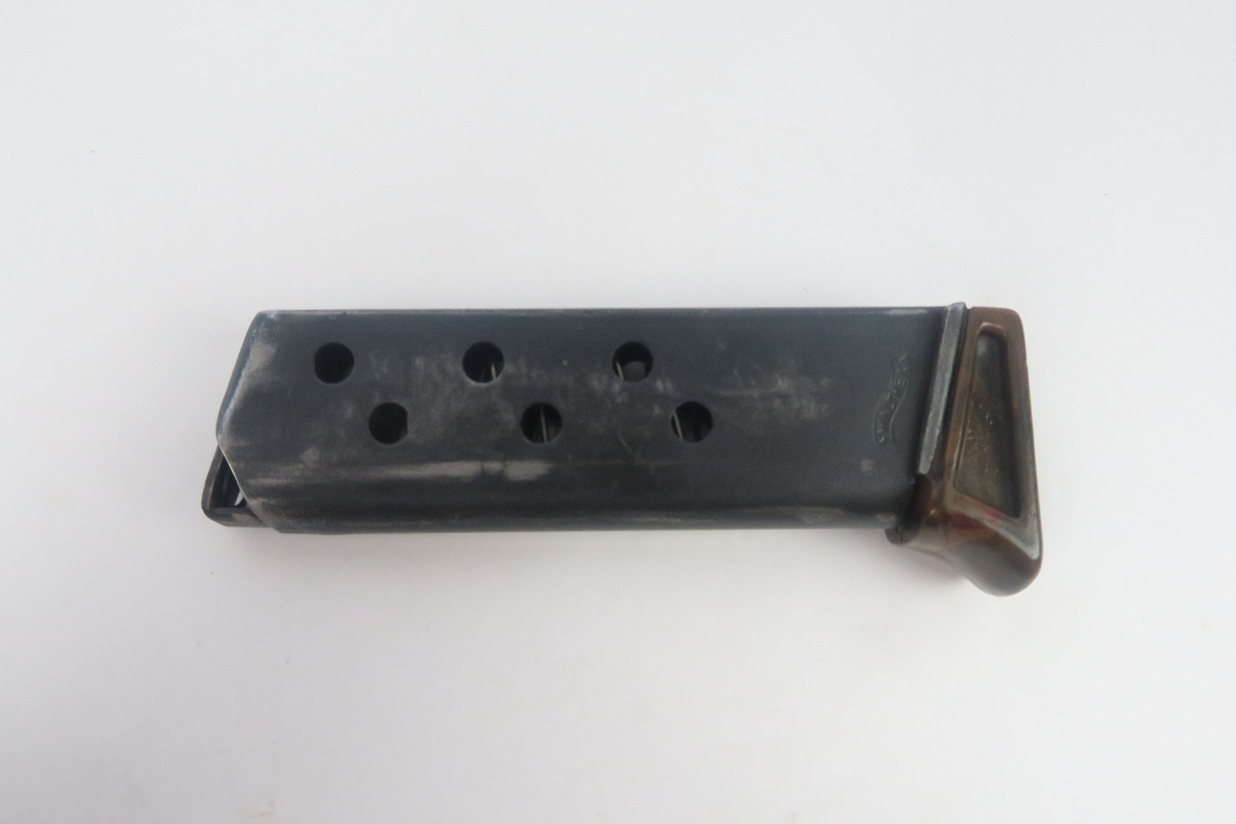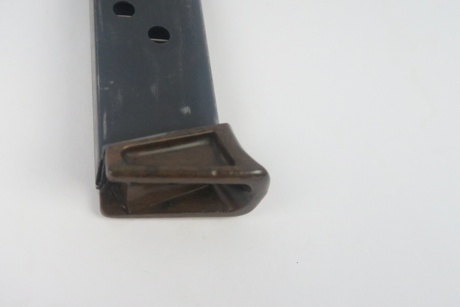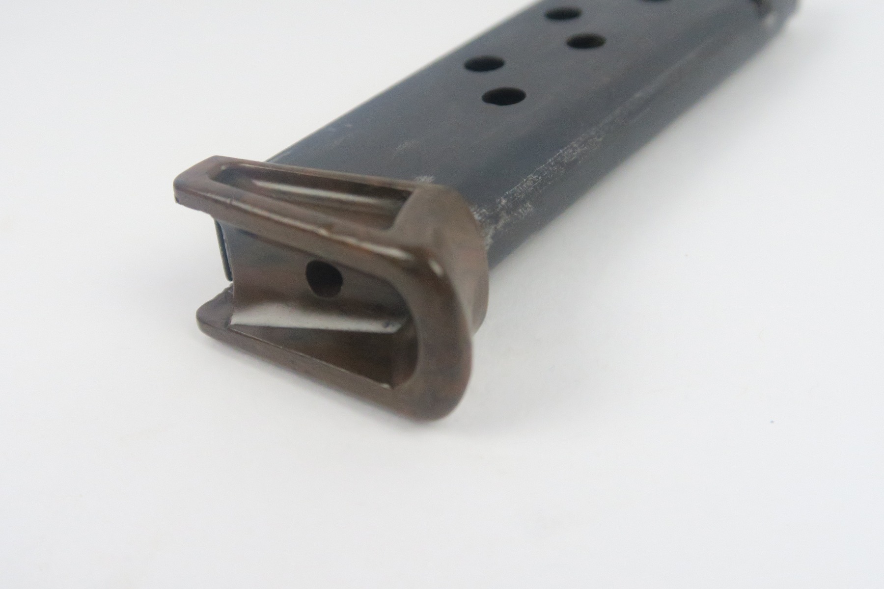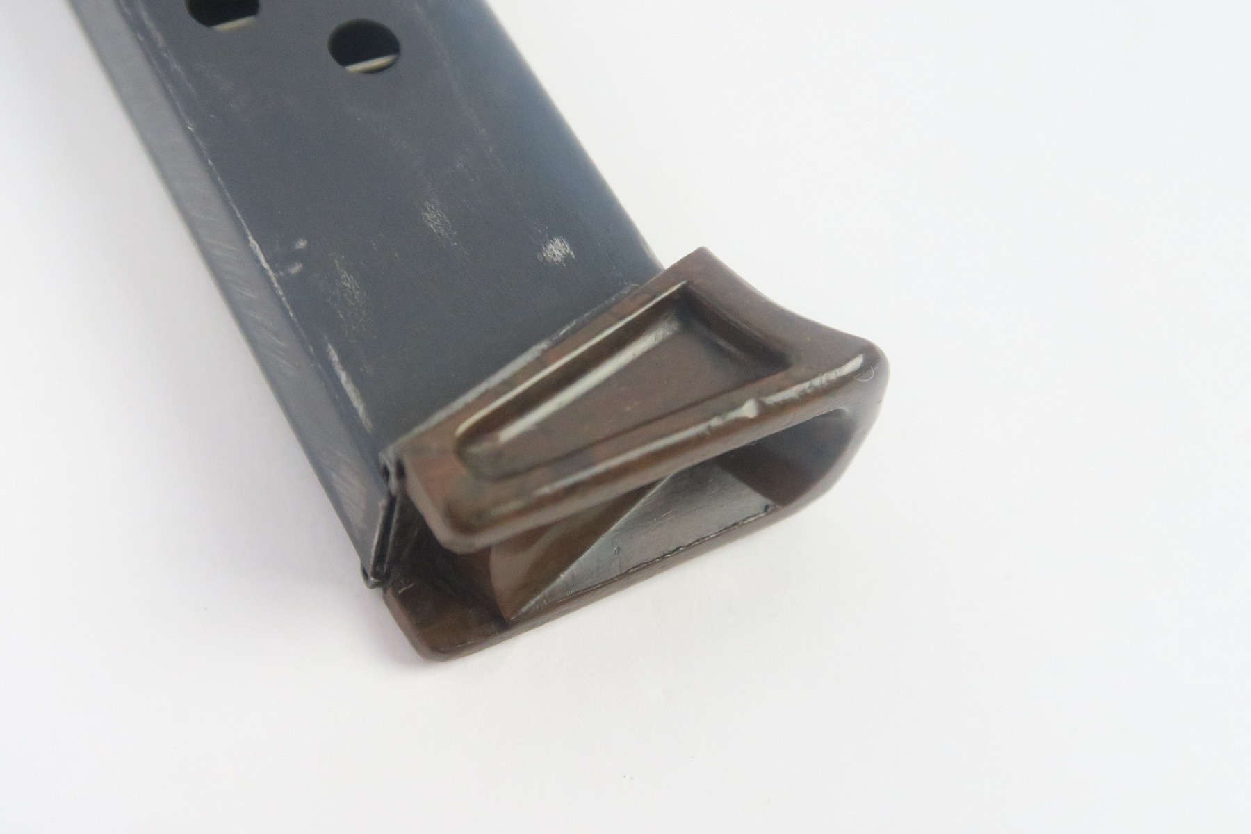 2/2/18 – This is an original WW2 production finger extension Walther PPk magazine. The dark brown finger extension has nice black swirls and some small hints of red. The magazine is an earlier variation with Walther banner only, but has a duller blued finish. No rust or pitting, guaranteed original and authentic.