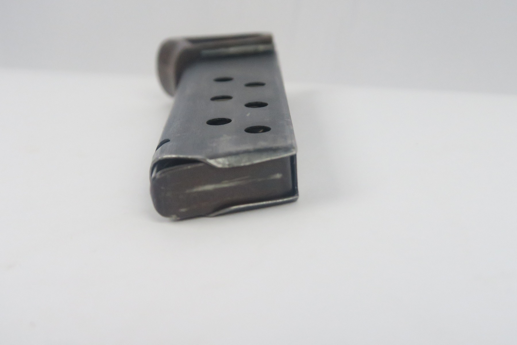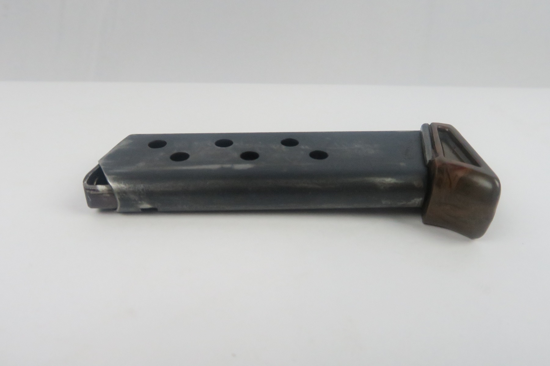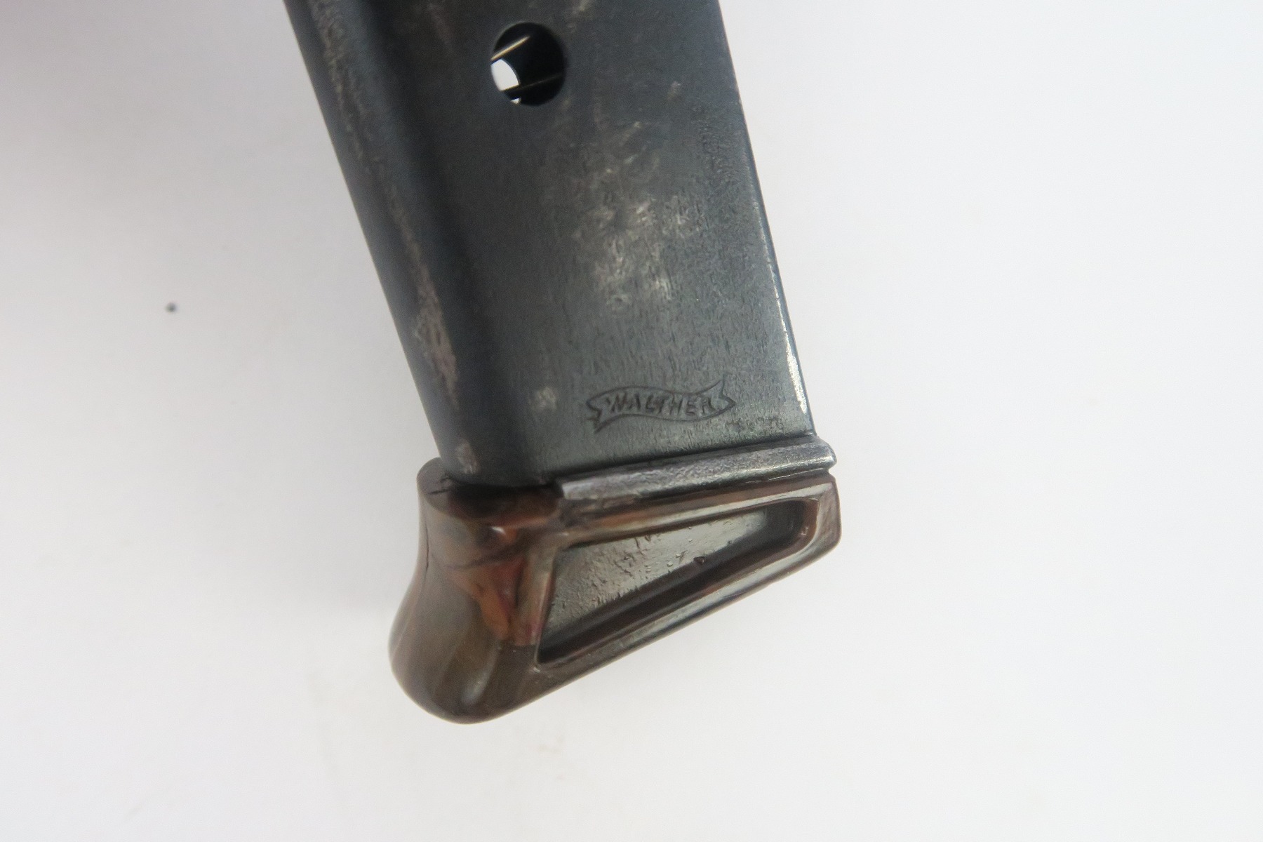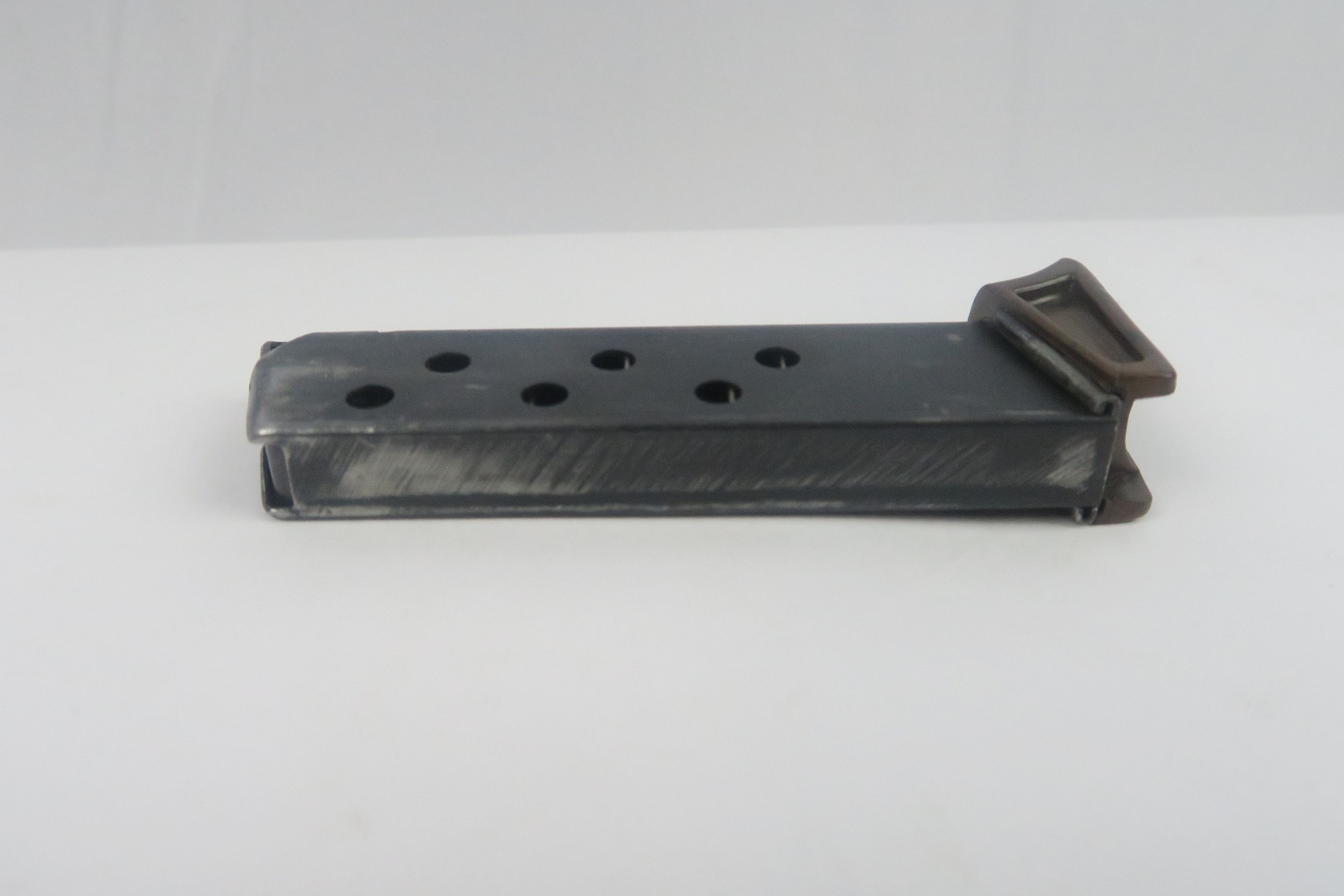 2/2/18 – This is an original WW2 production finger extension Walther PPk magazine. The dark brown finger extension has nice black swirls and some small hints of red. The magazine is an earlier variation with Walther banner only, but has a duller blued finish. No rust or pitting, guaranteed original and authentic.