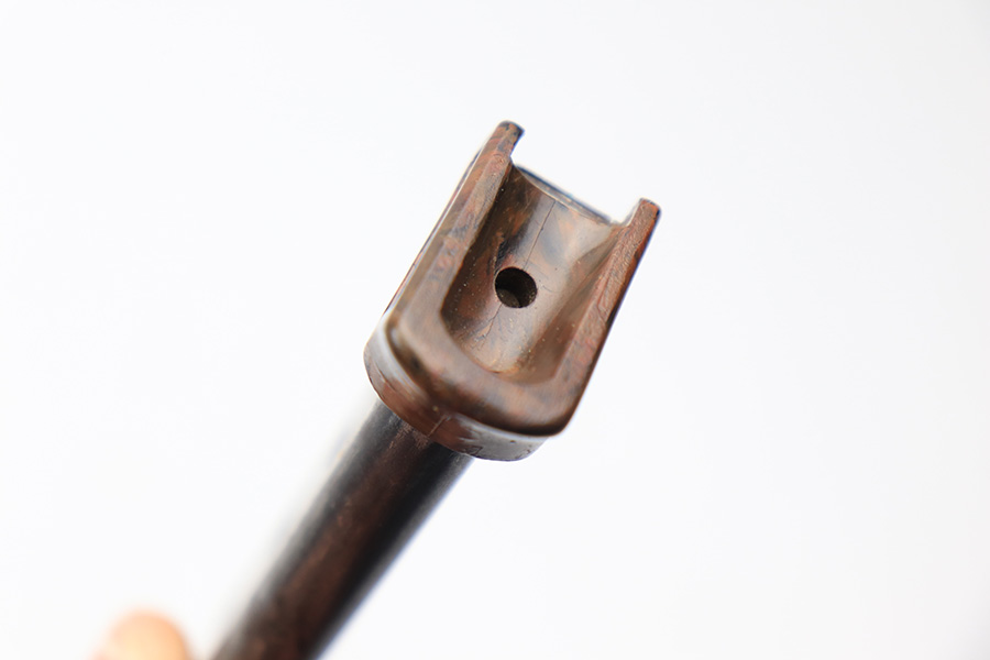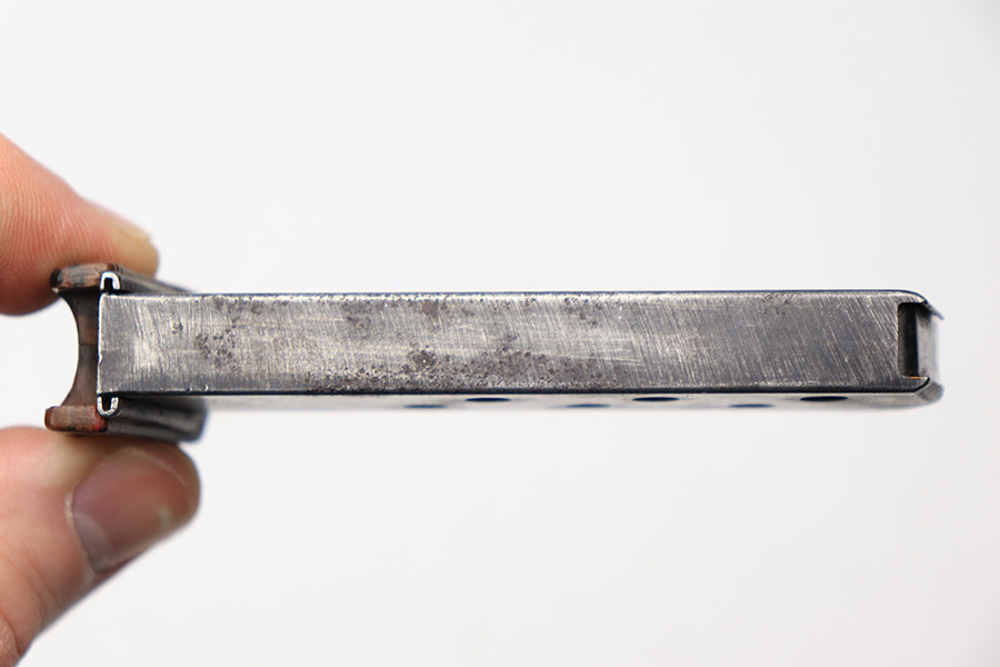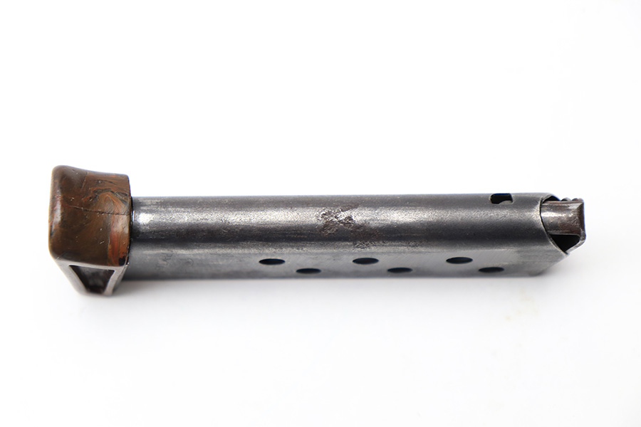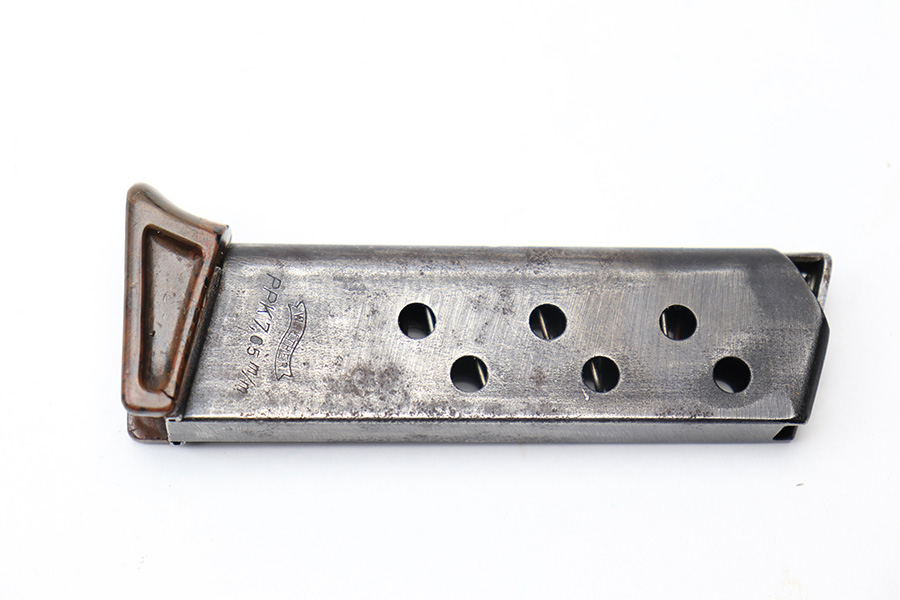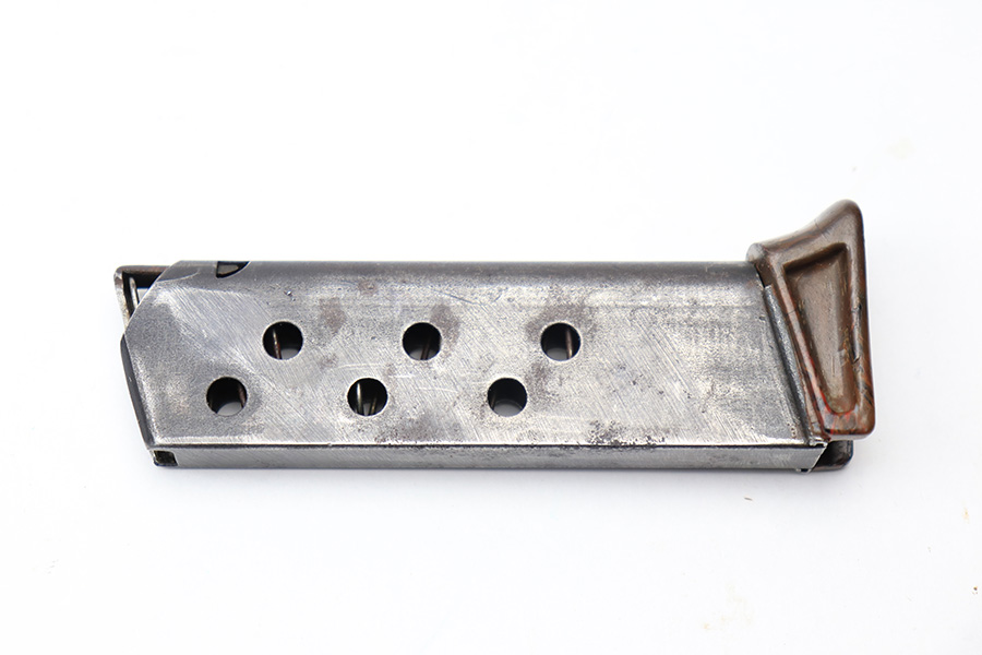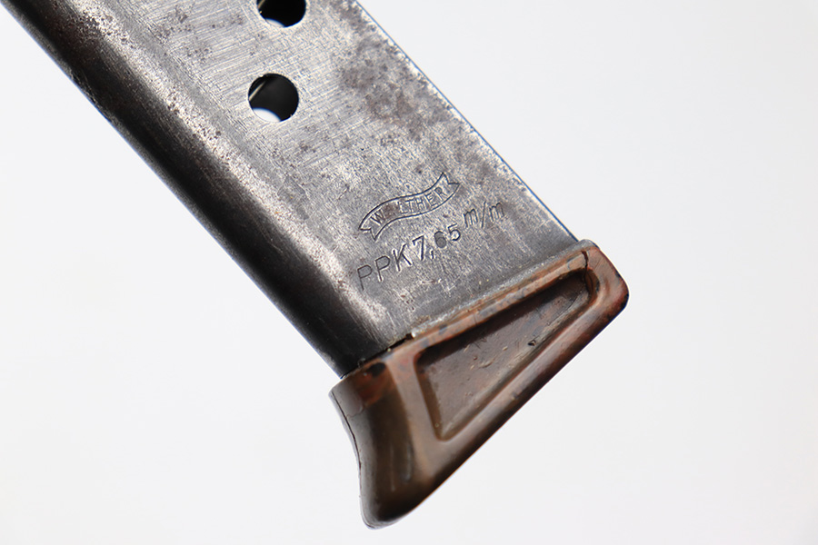3/10/22 – This is an original wartime production Walther PPK finger extension magazine. The magazine has light surface patina throughout, as well as a thinning blued finish. The bakelite base is in great shape with no cracks or chips, except for one very small crack on the back right corner, but this is very minor. Price reduced accordingly. The spring is strong and functional.