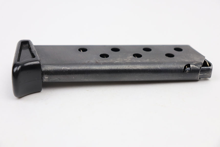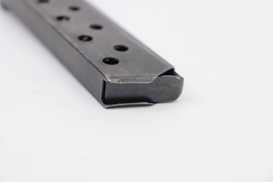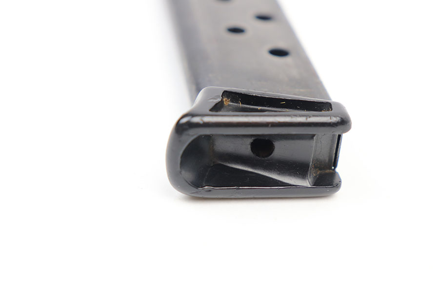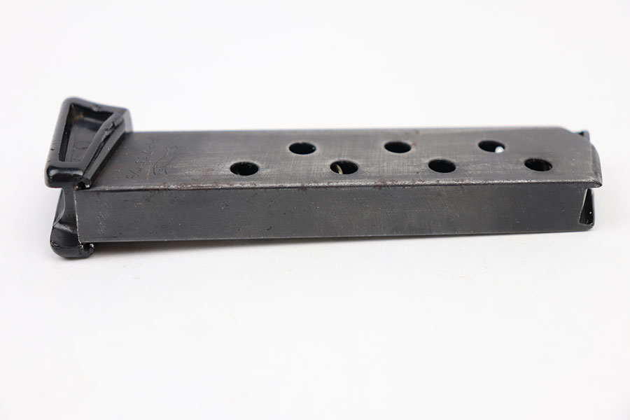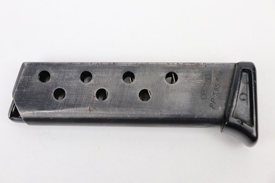 3/2/21 – This is a WW2 wartime production Walther PP magazine with a black bakelite finger extension. There is some mild finish loss but no major wear on the tube. The bakelite base is original and in tact. Strong, fully functional spring.