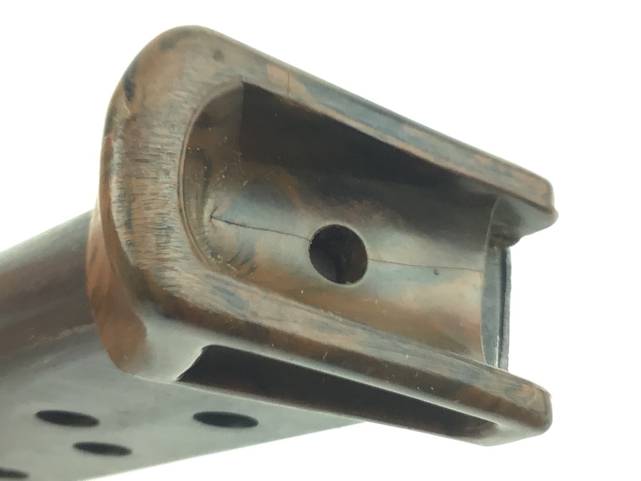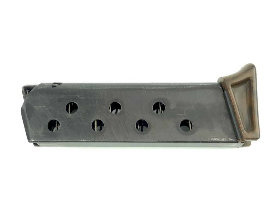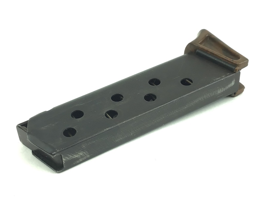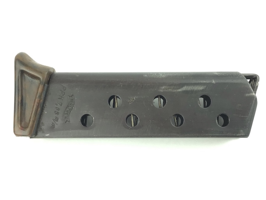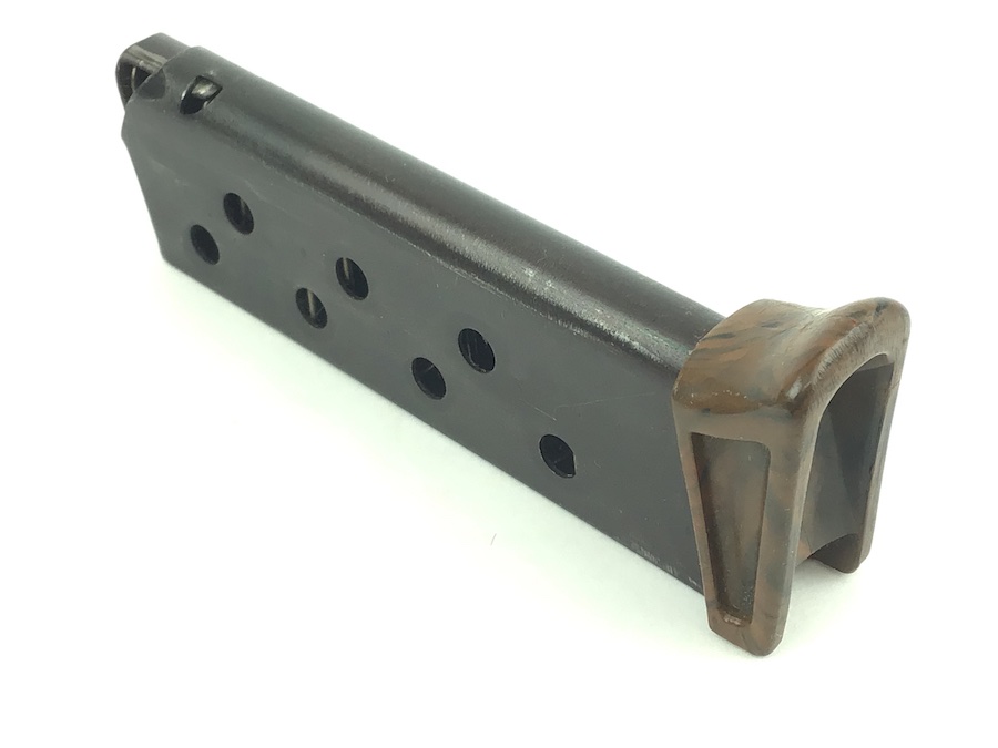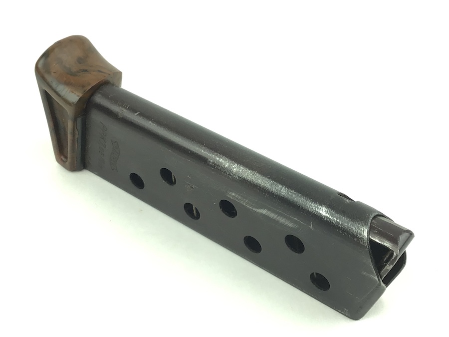 3/15/21 – This is an original, WW2 era Walther PPK Brown Finger Extension Magazine. The magazine is in great condition with no rust or pitting. Properly wartime marked on the left side. The spring is excellent and fully functional. The finger extension is a thick-lip wartime variation with a minor scratch on the bottom. It is solid and secure. Guaranteed original.