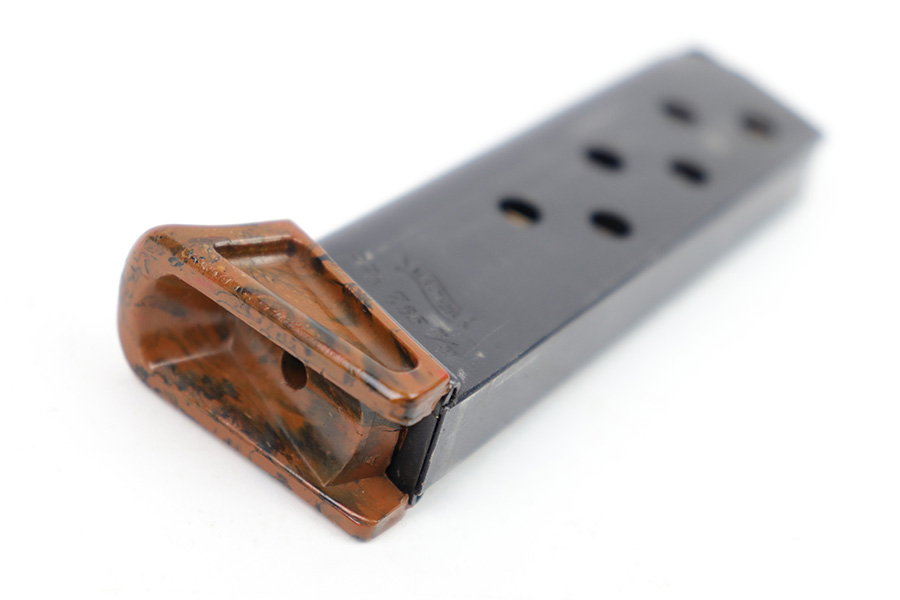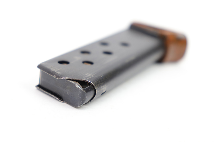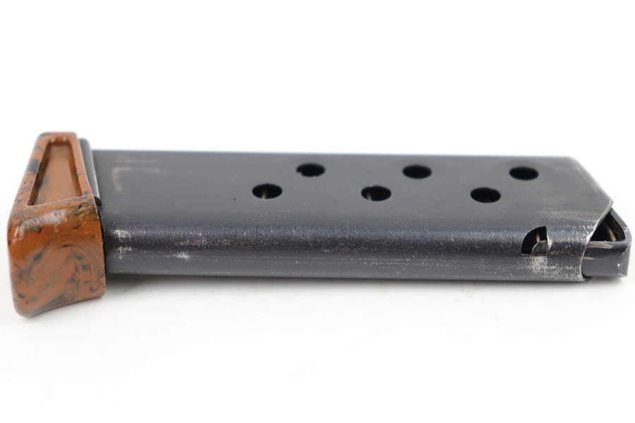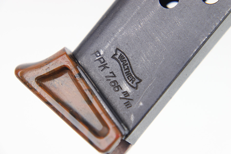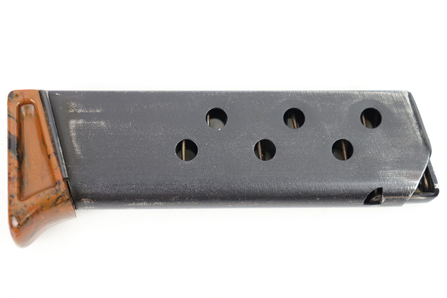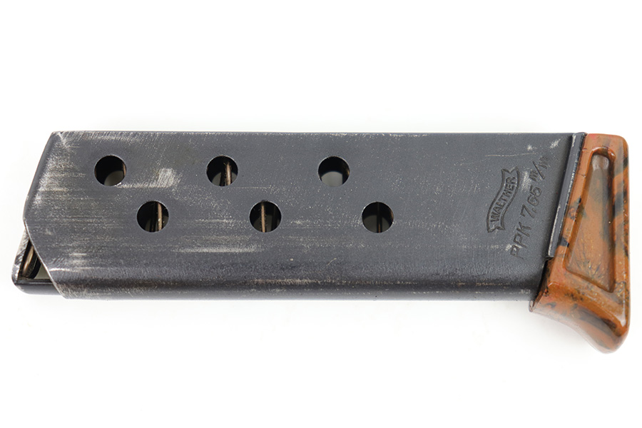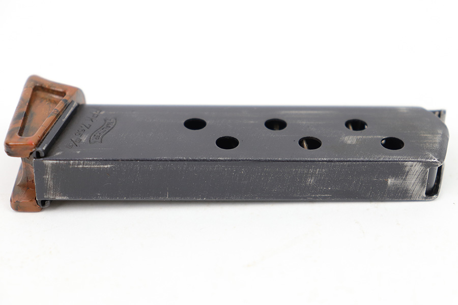 1/19/23 – This is an excellent condition finger extension magazine for a Walther PPK pistol from WW2. The magazine has a blued tube with a dull wartime finish and minimal surface wear. The brown bakelite base is also excellent condition with no cracks or chips, and a correct wartime “thick-lipped” variation. The spring is strong and fully functional.