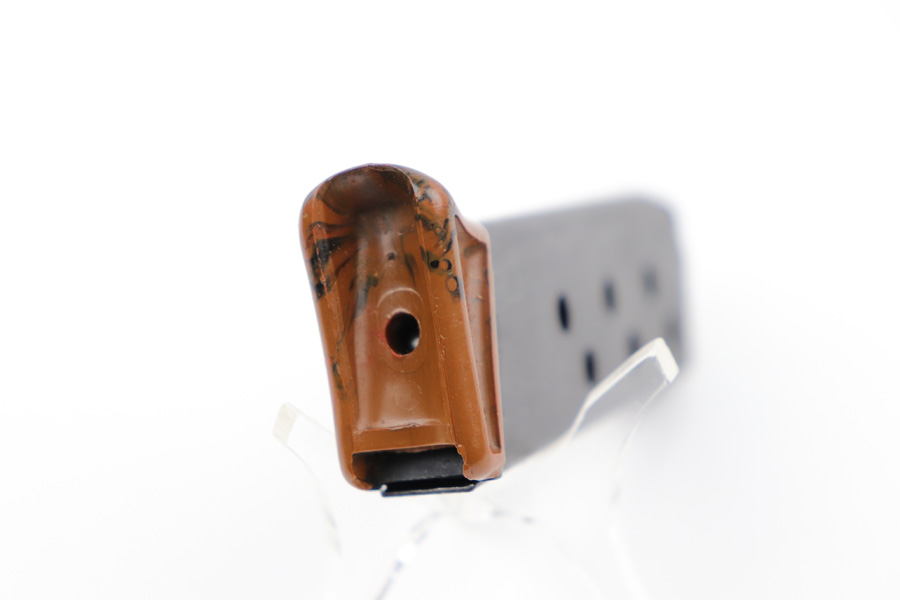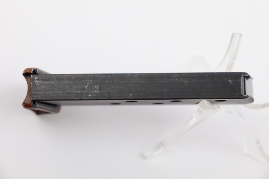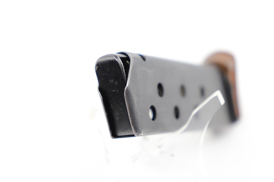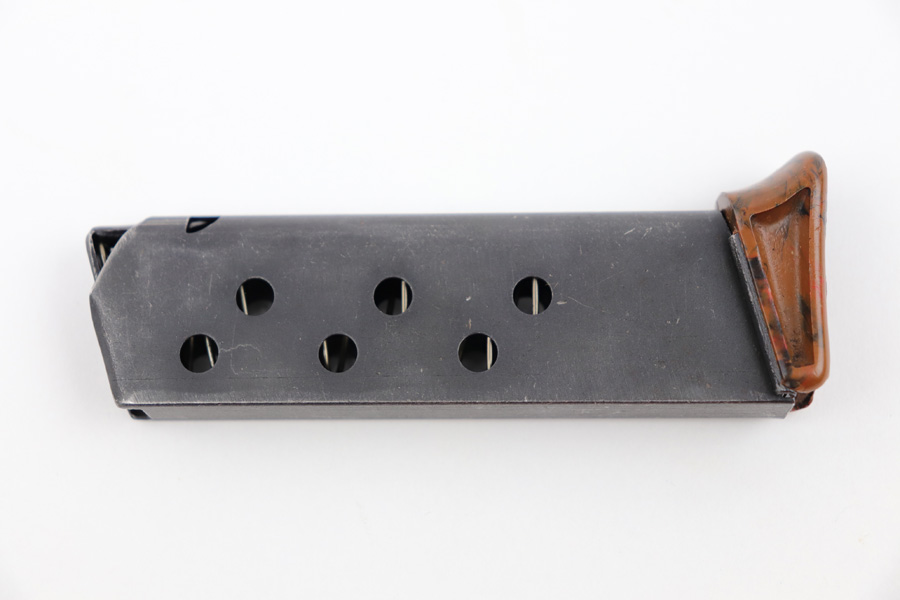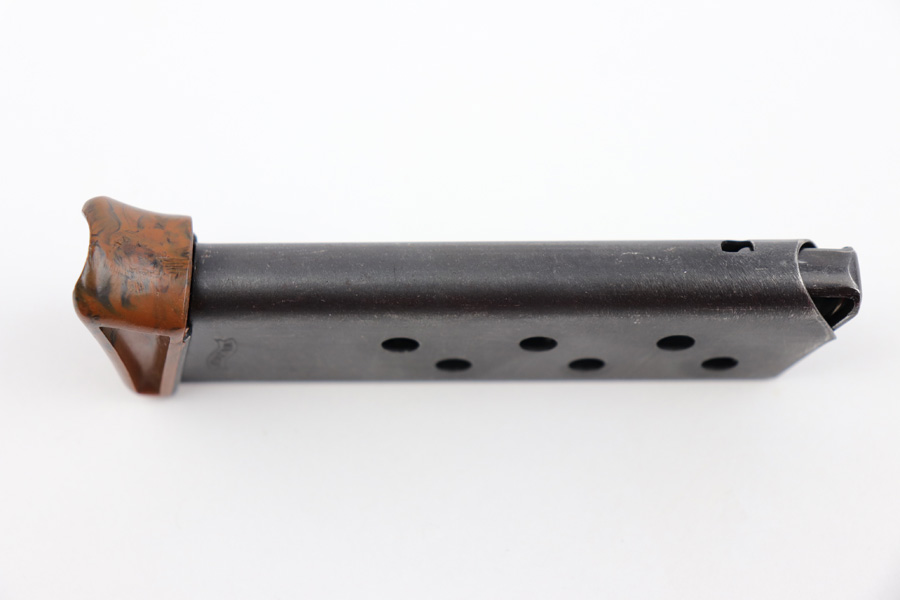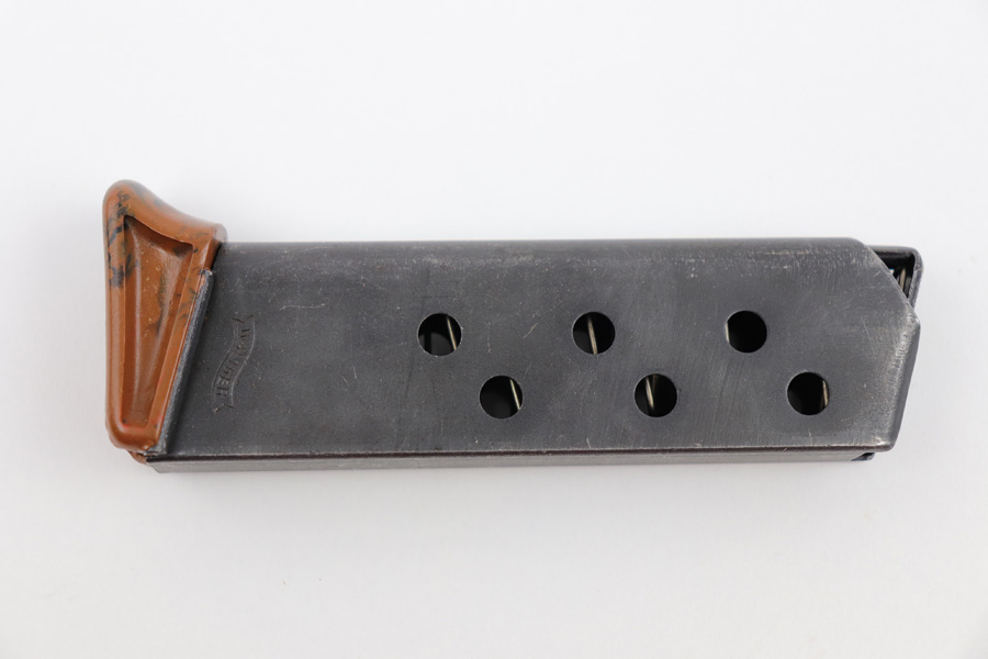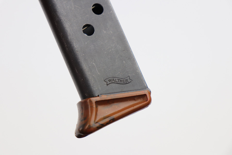 8/8/19 – This is an original Walther PPK magazine from WW2 with an excellent brown bakelite finger extension. The finger extension is an early variation with a “thin lip” in the front. No cracks or chips on the bakelite finger extension. The magazine frame is excellent as well with a dull blued finish and early style Walther banner. Perfect for an early wartime production Walther PPK. No rust or pitting, and a strong fully functional spring.