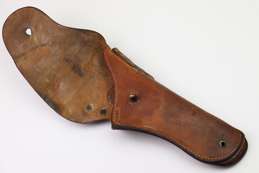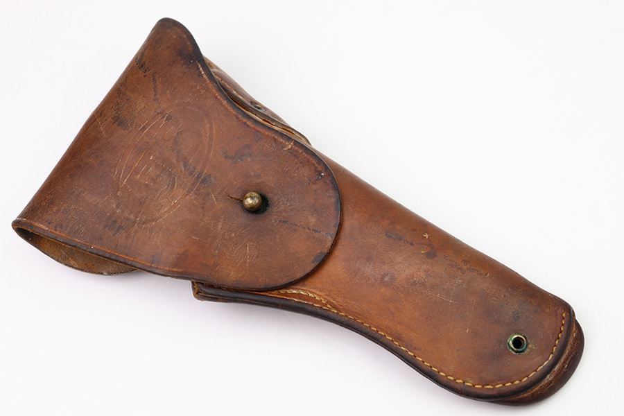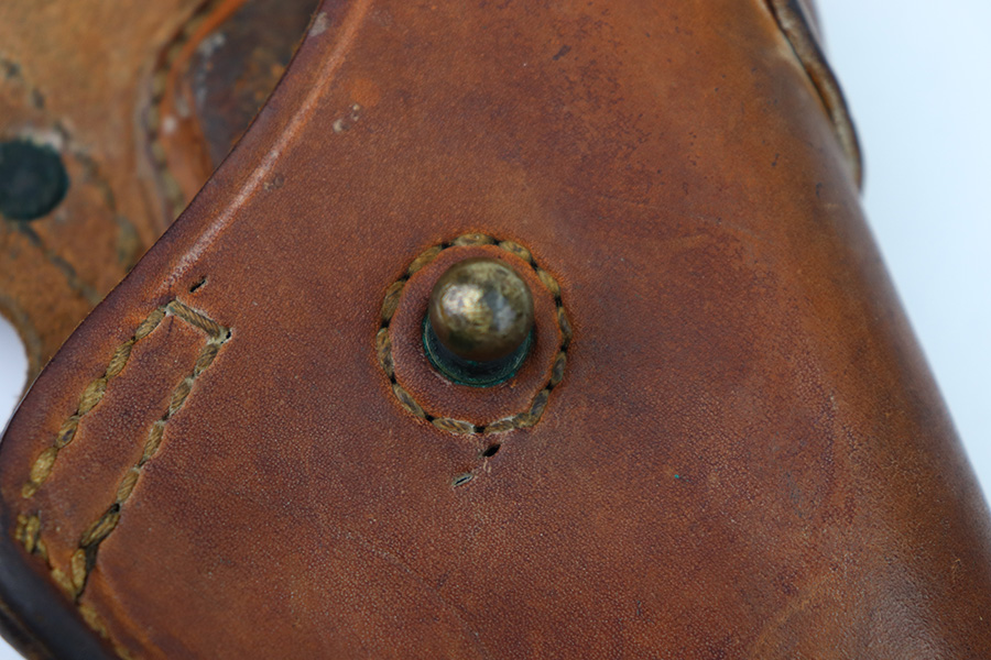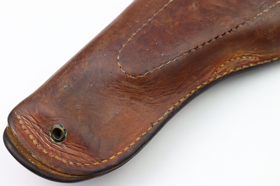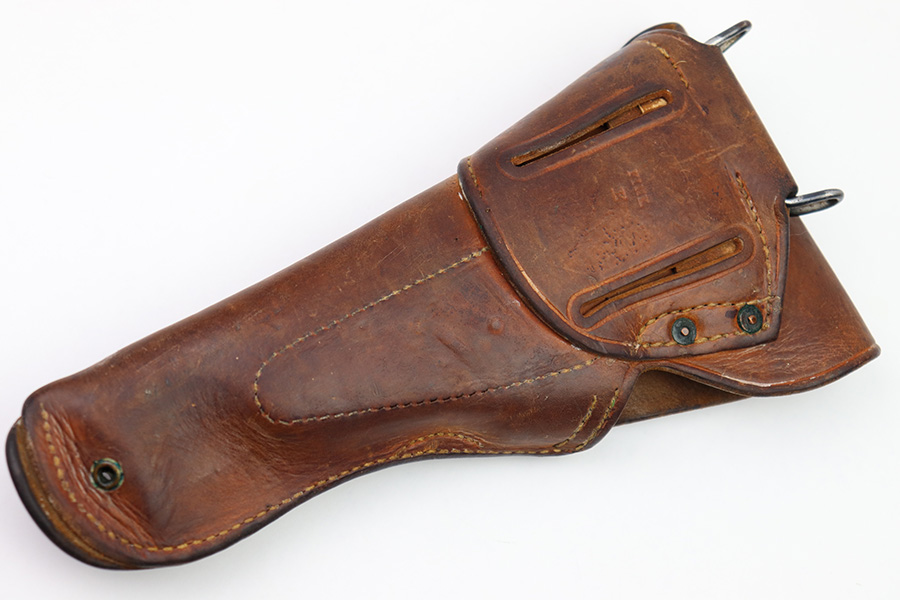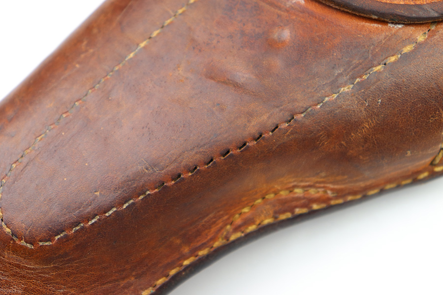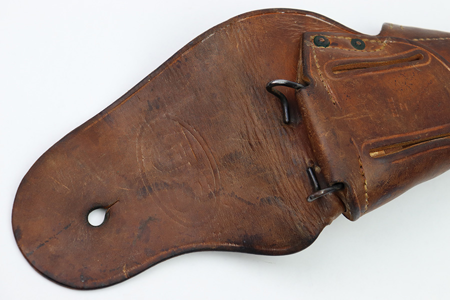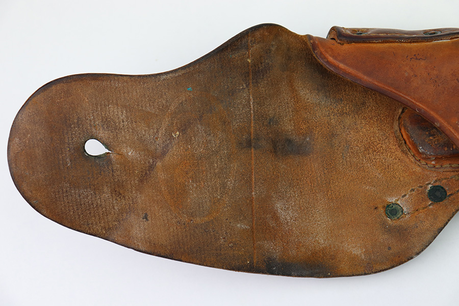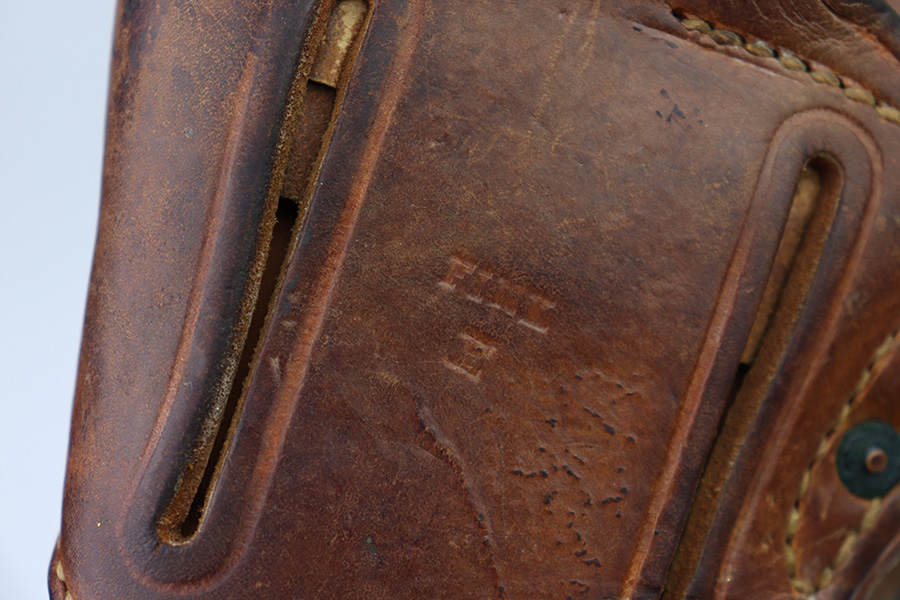 8/17/22 – This is an original M1916 holster manufactured during WW2 for the M1911A1 pistol. The holster is maker stamped on the back leather “FINK”, which is one of the more uncommon manufacturers. The front leather is “US” stamped, but this is started to fade out of the leather with age. The exterior leather has some surface discoloration and mild wrinkling. Normal pliability overall and no stitching issues.