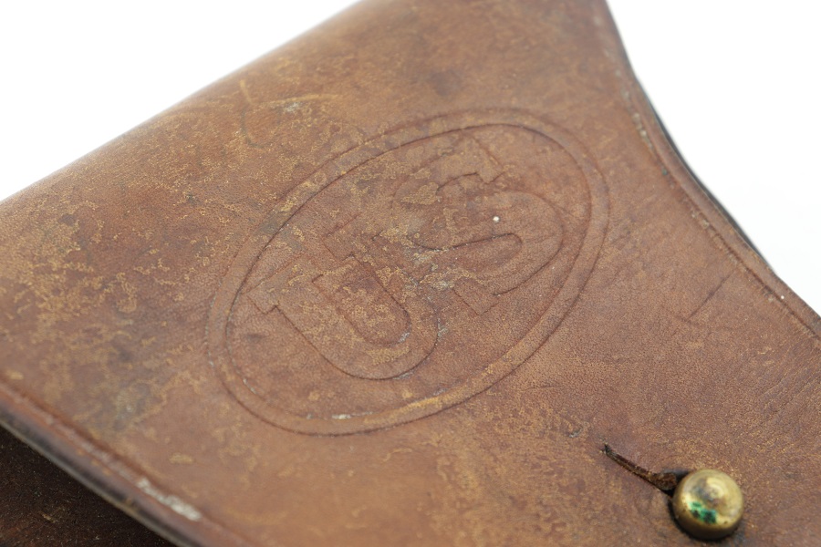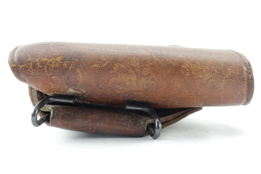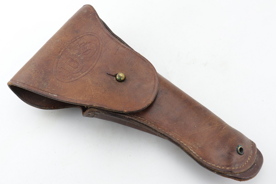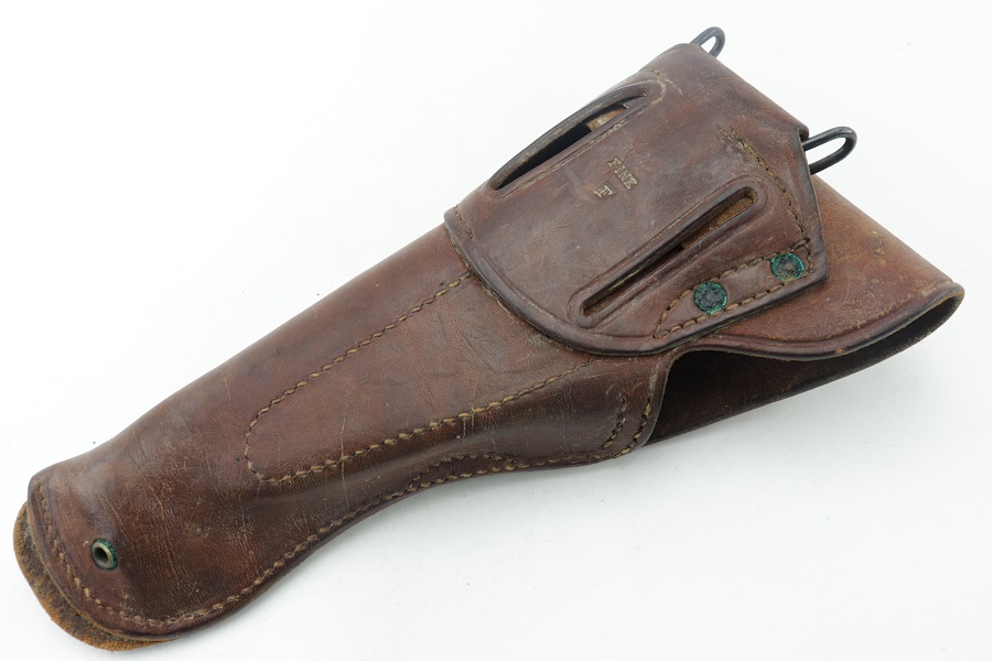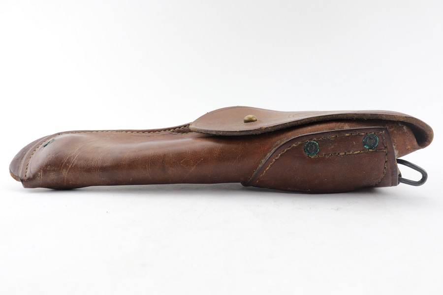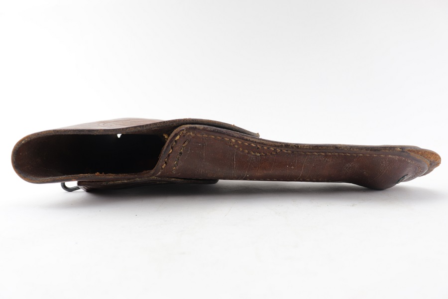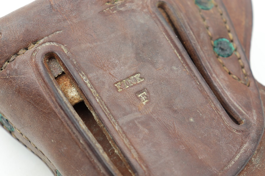 5/22/24 – This is an original M1916 Colt holster for M1911 Colt pistol. Rare maker “FINK” stamped distinctly on the back above the letter “F”. (Fink Leather Shops, Kansas City, Missouri) Nice and solid light brown leather construction. The flap is embossed with the “US” letters. A very desirable maker. Some surface wear with a clean interior. Original and intact stitching.