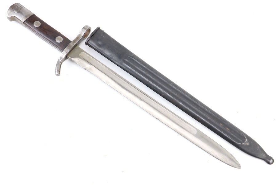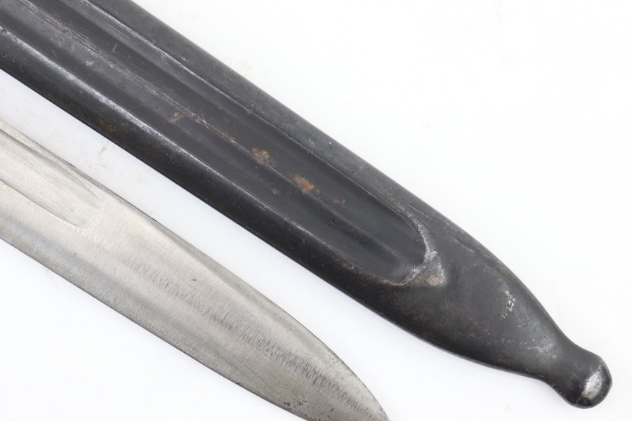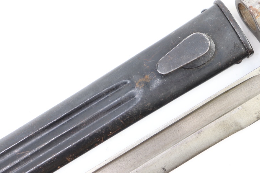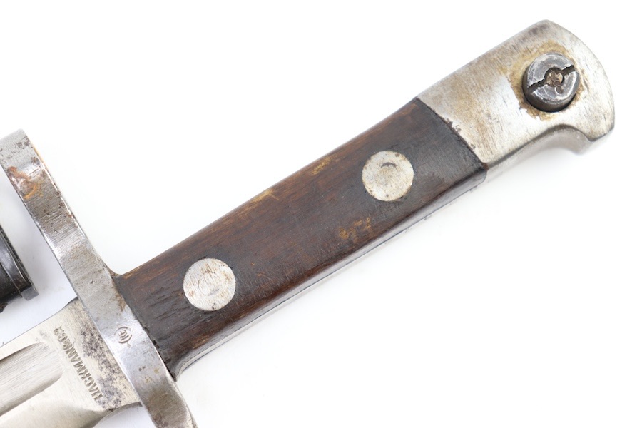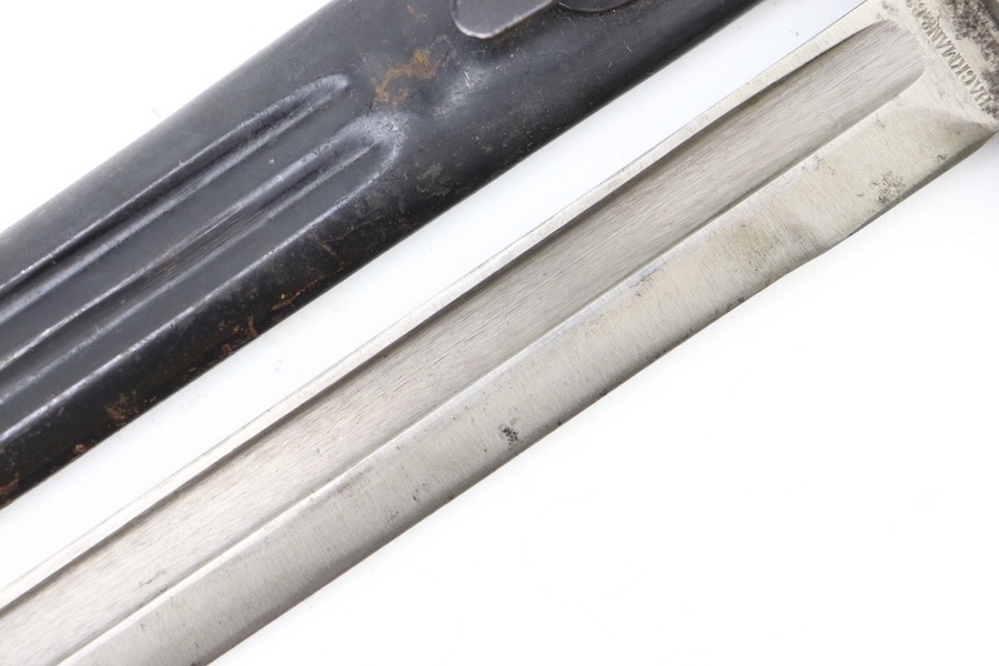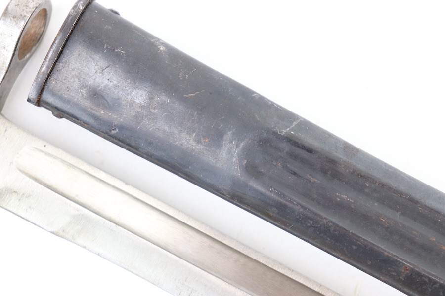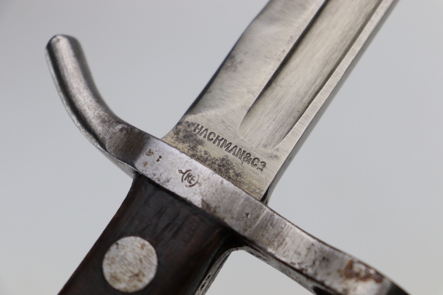 10/9/23 – This is a great and original condition Hackman & Co bayonet with scabbard. The blade has minor speckling of patina with no rust or pitting. The edge has not been sharpened. Ricasso is maker-stamped. The cross guard and pommel have an honest wear patina, with the cross guard having minor side-to-side play. Wood grips show age with a couple of tiny chips. Serial number under the handle reads S20975. The scabbard has minor patches of surface rust but retains almost all of its original finish.