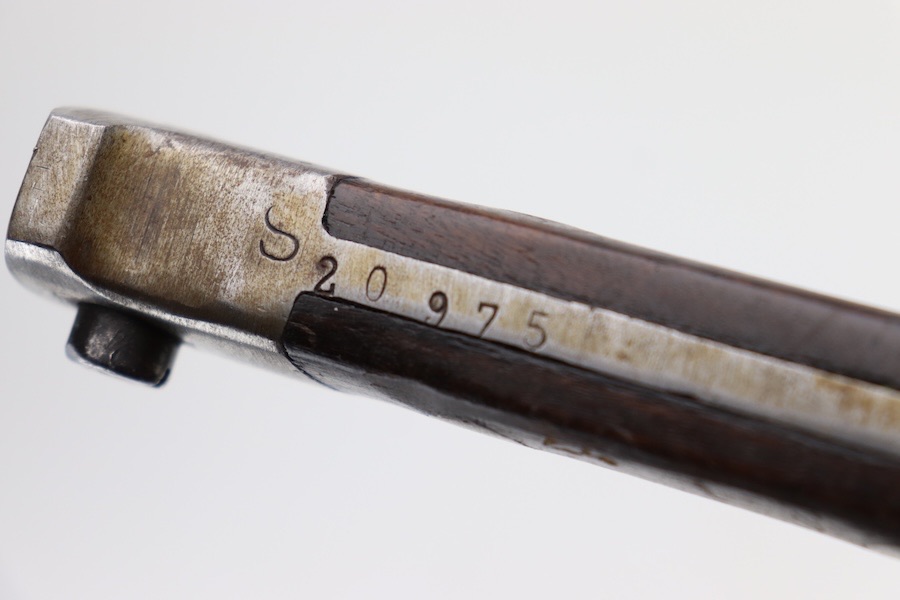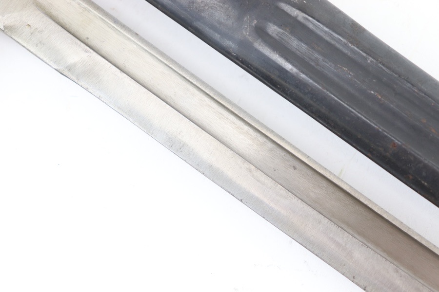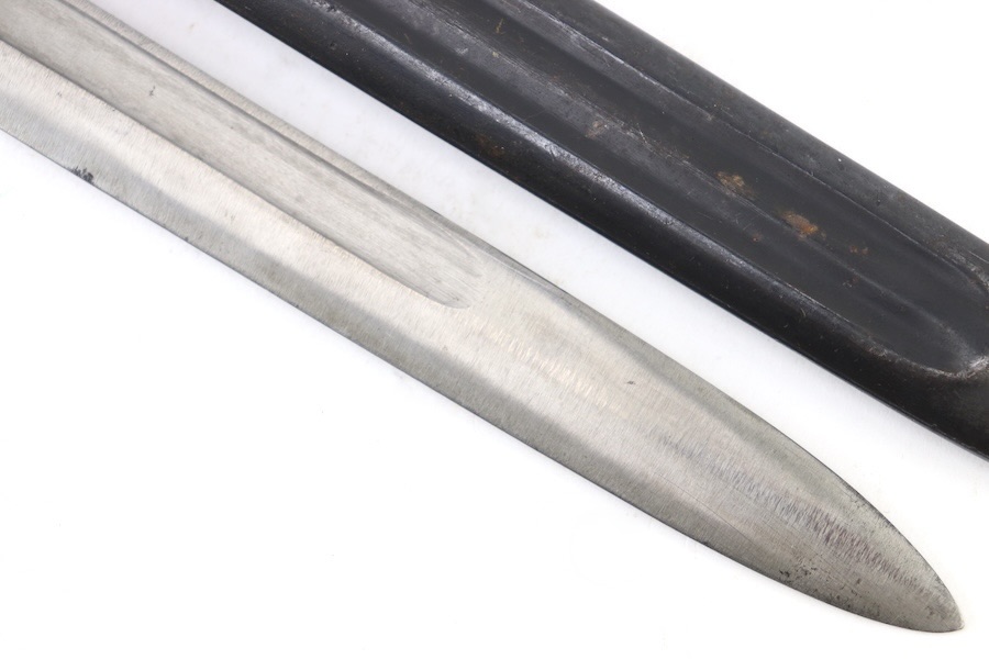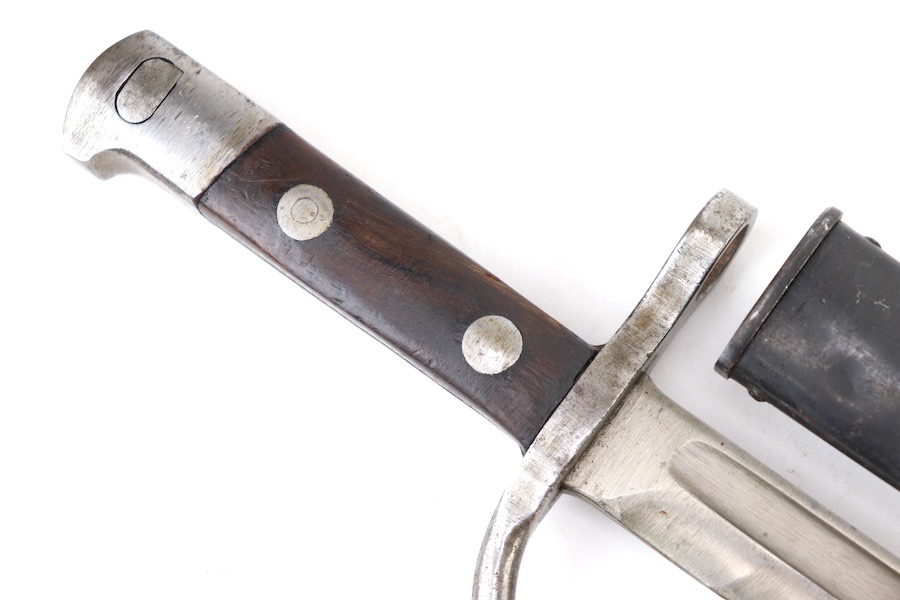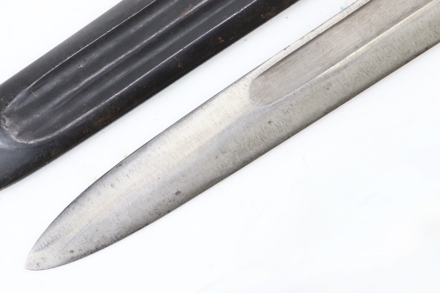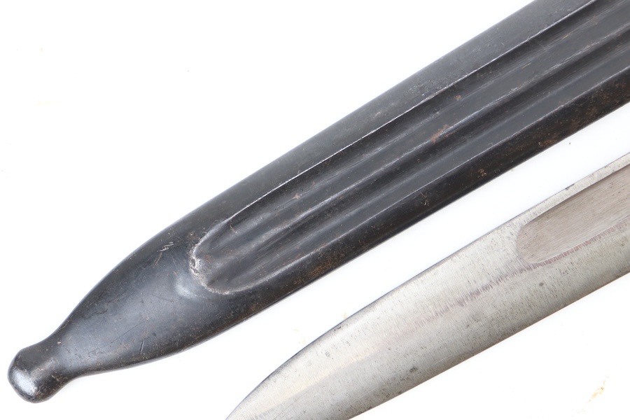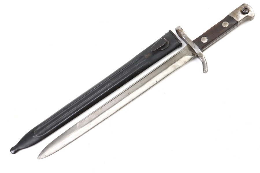 10/9/23 – This is a great and original condition Hackman & Co bayonet with scabbard. The blade has minor speckling of patina with no rust or pitting. The edge has not been sharpened. Ricasso is maker-stamped. The cross guard and pommel have an honest wear patina, with the cross guard having minor side-to-side play. Wood grips show age with a couple of tiny chips. Serial number under the handle reads S20975. The scabbard has minor patches of surface rust but retains almost all of its original finish.