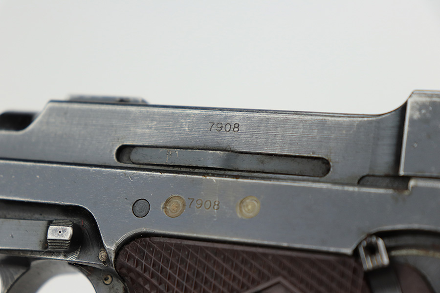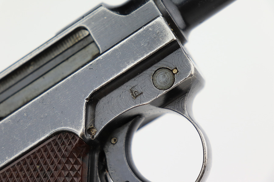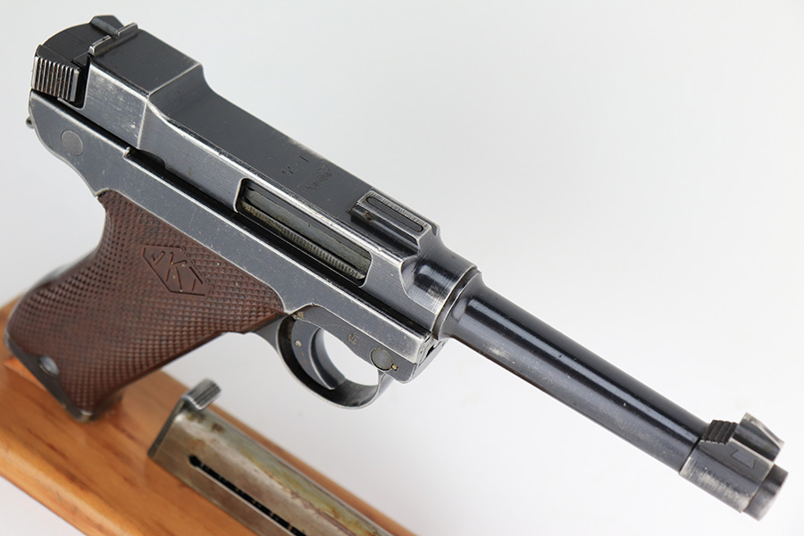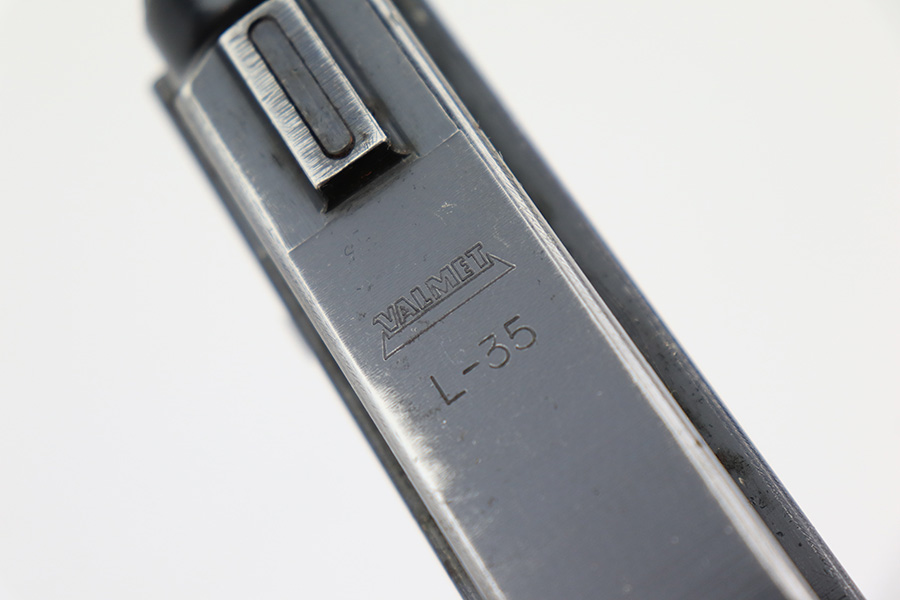 5/17/23 – This is a very nice example of a rare Finnish VKT L-35 Rig, made in the 1940’s. This Finnish designed and manufactured pistol (a copy of the Lahti) was issued to Finnish military frontline-units during Winter War (1939-1940) in very small numbers and in growing numbers during Continuation War (1941-1944). After World War 2, it remained in use of Finnish Armed Forces until 1980’s. This one is matching and has no import marks. It has retained about 90% of its bluing with general high edge wear, some wear around the muzzle, and a few tiny handling marks on the front strap. Two small circular milling marks on the left side of the frame. Fitted with excellent reddish plastic grips and comes with one proper magazine. The bore has good rifling, but there is minor pin-pricking throughout.