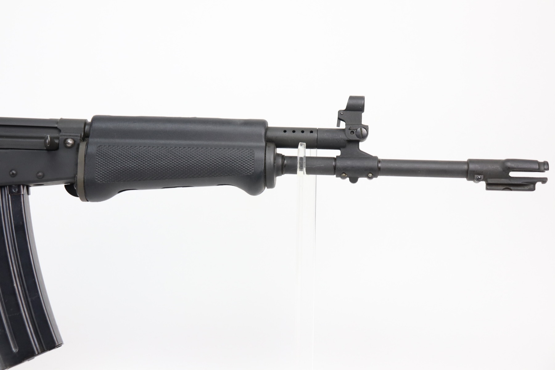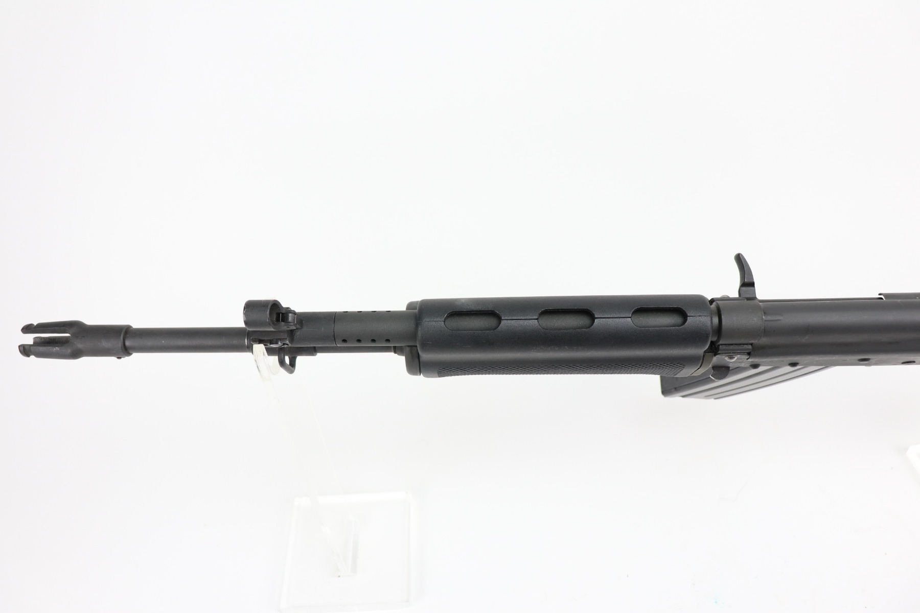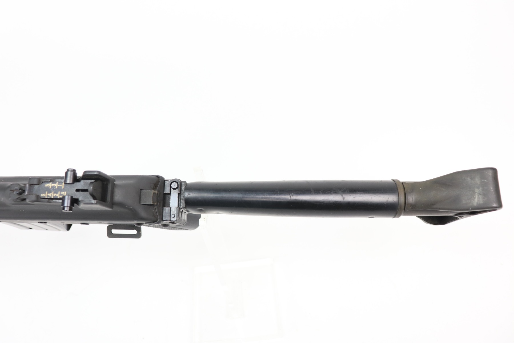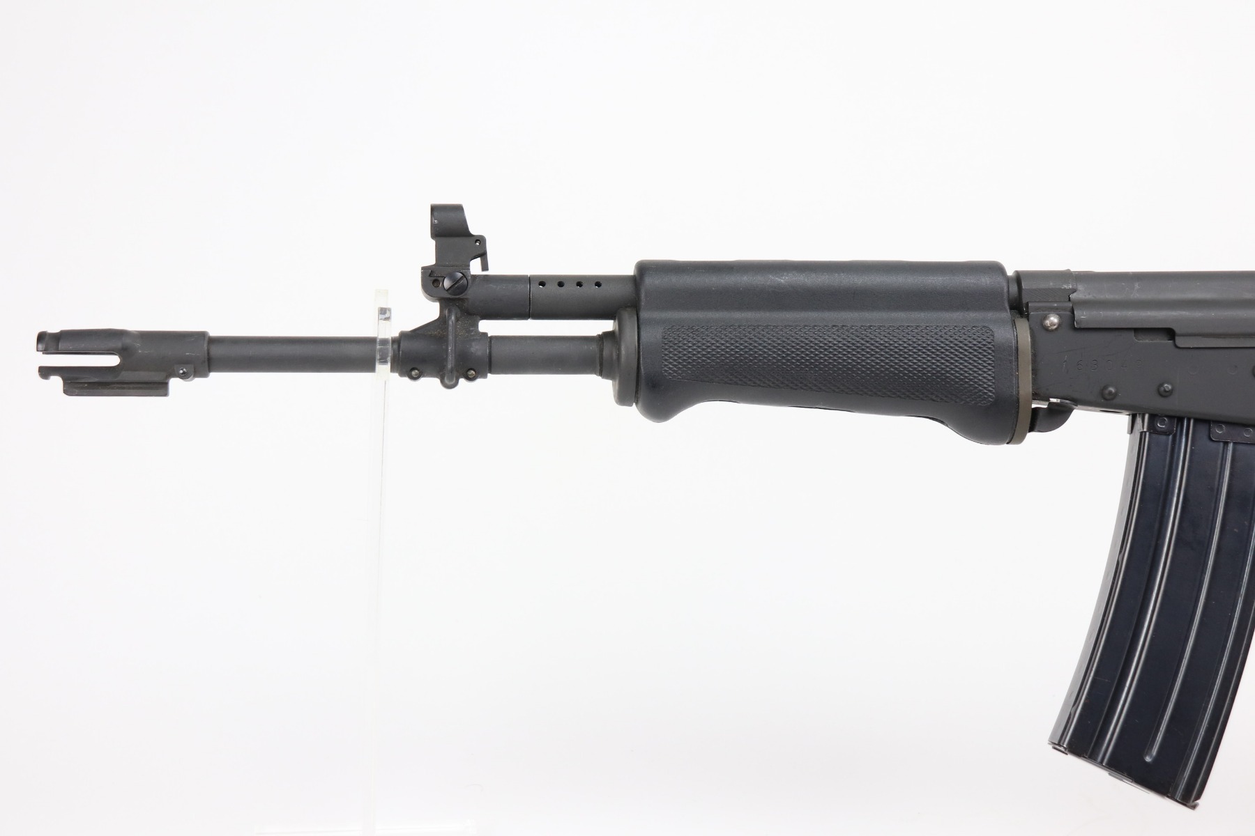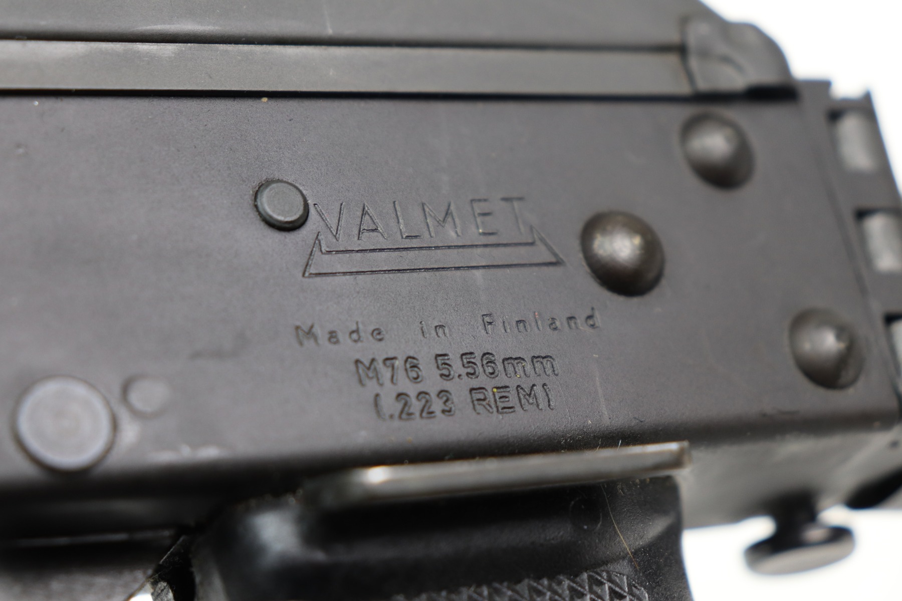 3/2/21 – This is a like-new example of a Finnish Valmet M76 Assault Rifle, chambered in 5.56mm or .223. Made between 1976-86. The Valmet M62/76 series of rifles are updates of the AK-47 design. Beginning with a licensed version of the AK-47 receiver, Valmet set about upgrading the design at every point. Tolerances are much tighter than the Soviet bloc AKs while still being generous enough to assure outstanding reliability in all climates. The gas piston included small “fingers” near the piston to ensure smoother functioning inside the gas tube, which helped to increase the inherent accuracy of the rifle. Another move toward increased accuracy was the upgraded sights. They also come with a folding stock. This one is all matching and in like-new condition except for very light surface scuffs on the receiver. Some light surface scratches and handling marks on the stock as well. It comes with one 30-rd magazine. The bore is mint.