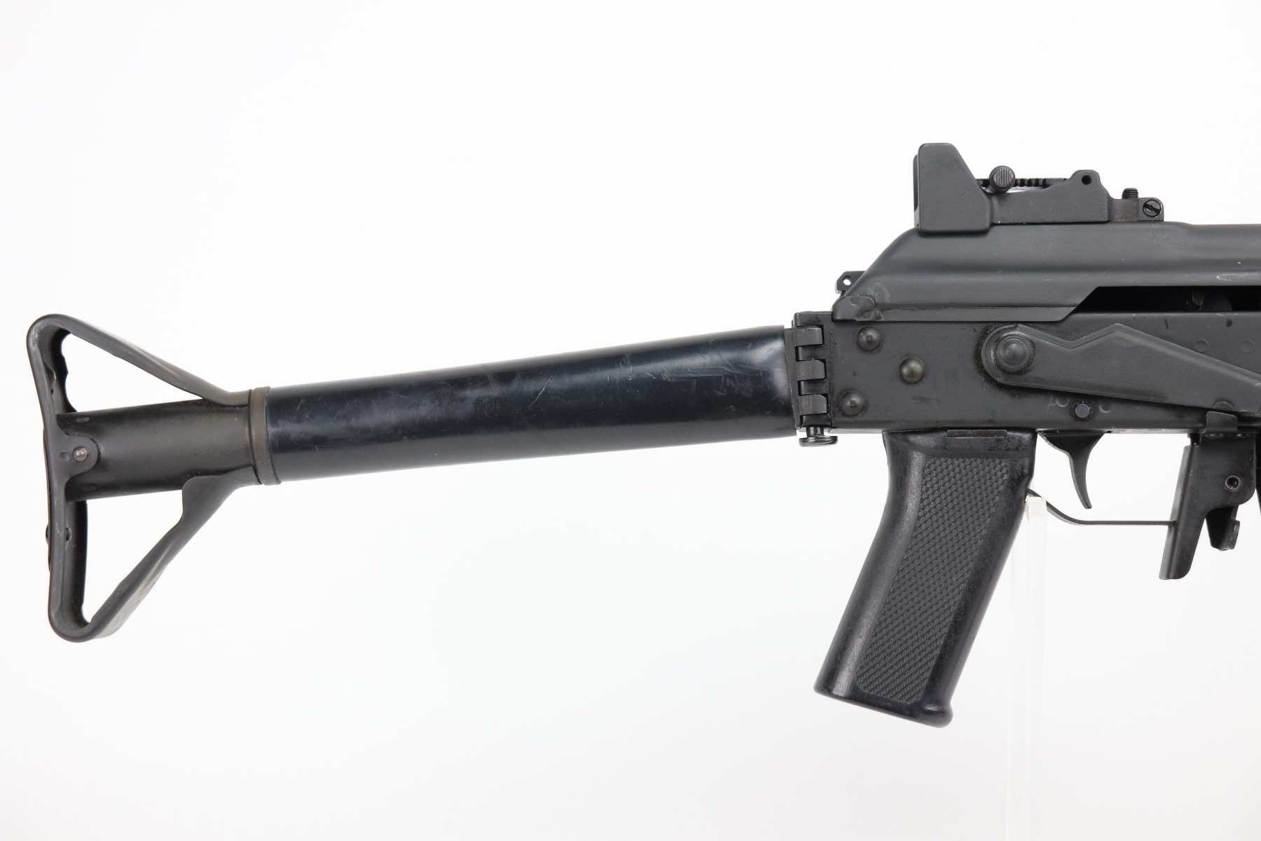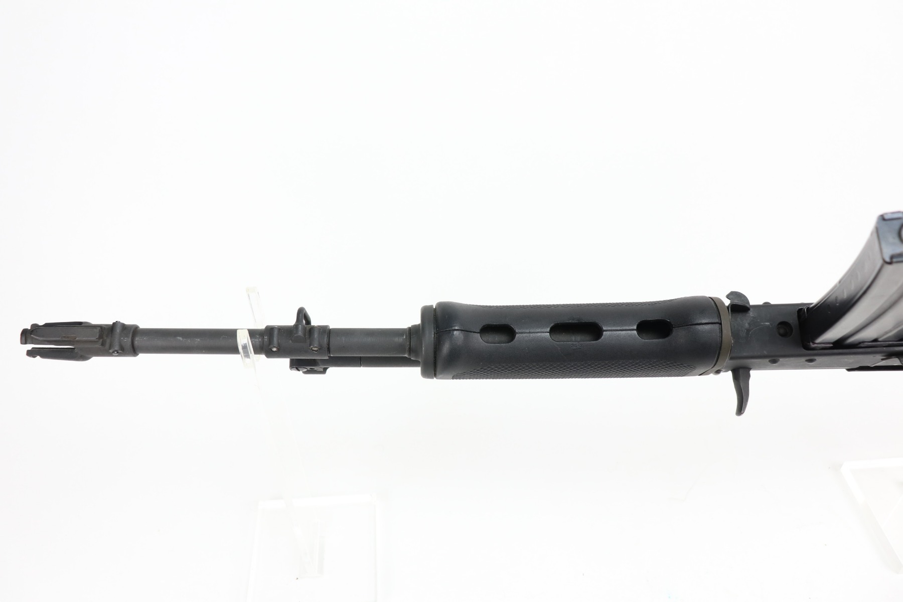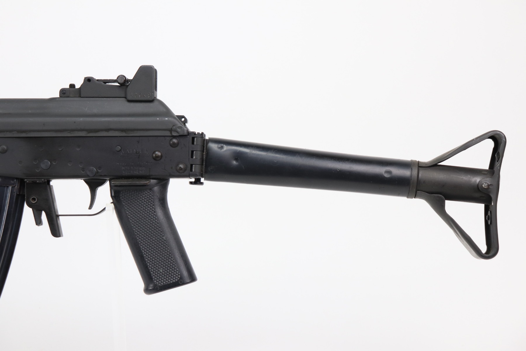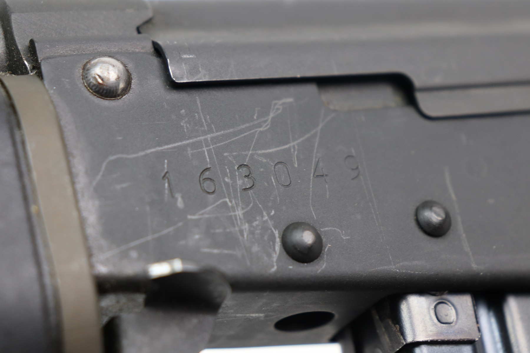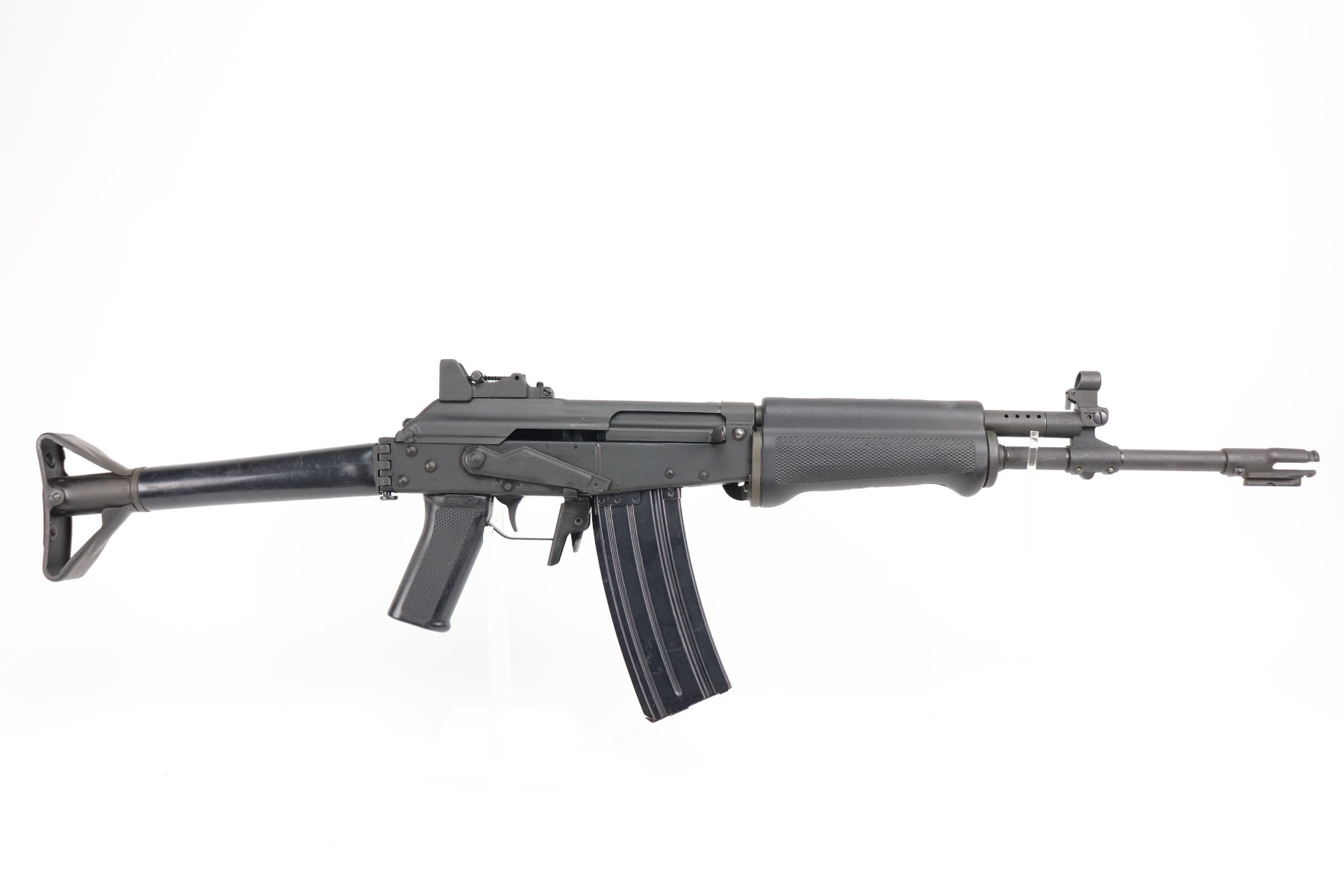 3/2/21 – This is a like-new example of a Finnish Valmet M76 Assault Rifle, chambered in 5.56mm or .223. Made between 1976-86. The Valmet M62/76 series of rifles are updates of the AK-47 design. Beginning with a licensed version of the AK-47 receiver, Valmet set about upgrading the design at every point. Tolerances are much tighter than the Soviet bloc AKs while still being generous enough to assure outstanding reliability in all climates. The gas piston included small “fingers” near the piston to ensure smoother functioning inside the gas tube, which helped to increase the inherent accuracy of the rifle. Another move toward increased accuracy was the upgraded sights. They also come with a folding stock. This one is all matching and in like-new condition except for very light surface scuffs on the receiver. Some light surface scratches and handling marks on the stock as well. It comes with one 30-rd magazine. The bore is mint.