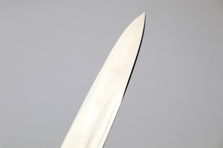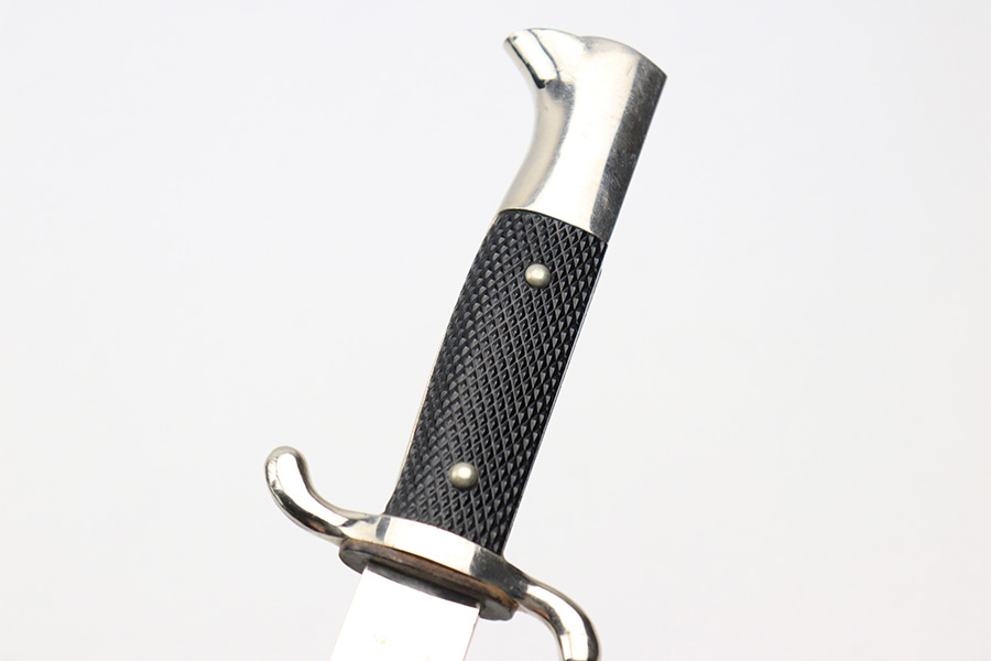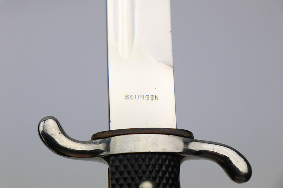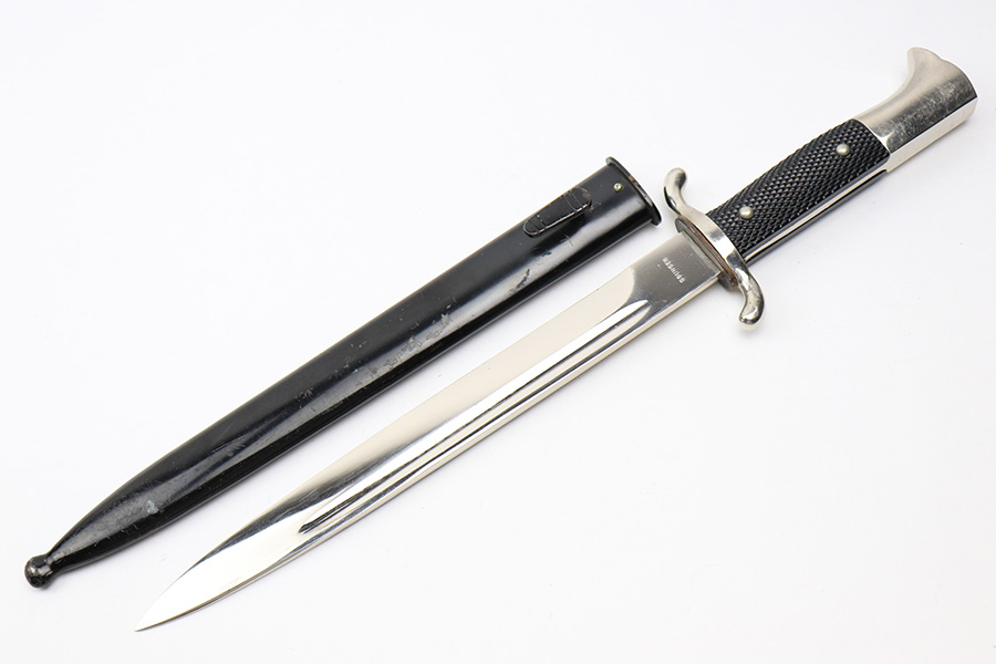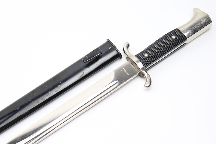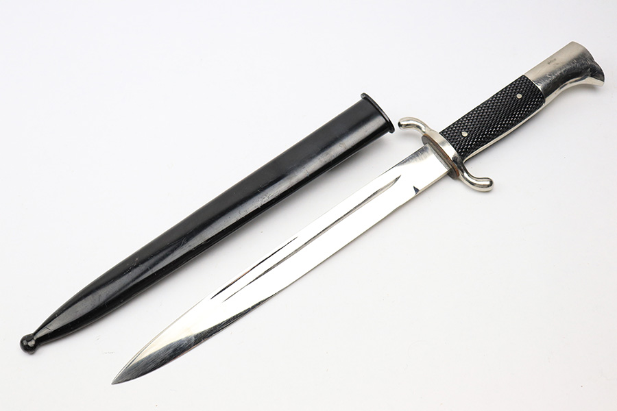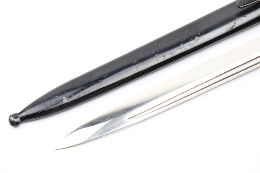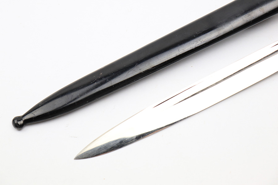 5/11/22 – This is an original WW2 era Fire Serviceman’s dress bayonet. The bayonet is in excellent condition with a beautiful blade that is stamped “Solingen” on one side. There are no other markings or stamps. The handle is equally excellent with a sharp diamond pattern on each panel. The hilt has some mild surface scuffs but overall has a nice polished look. The scabbard has no dents or major issues besides some mild paint loss.