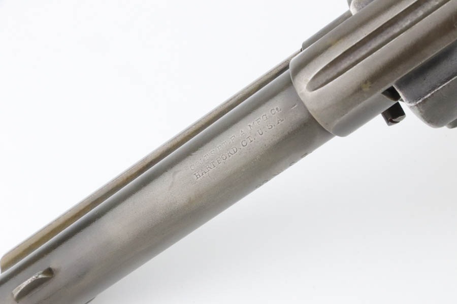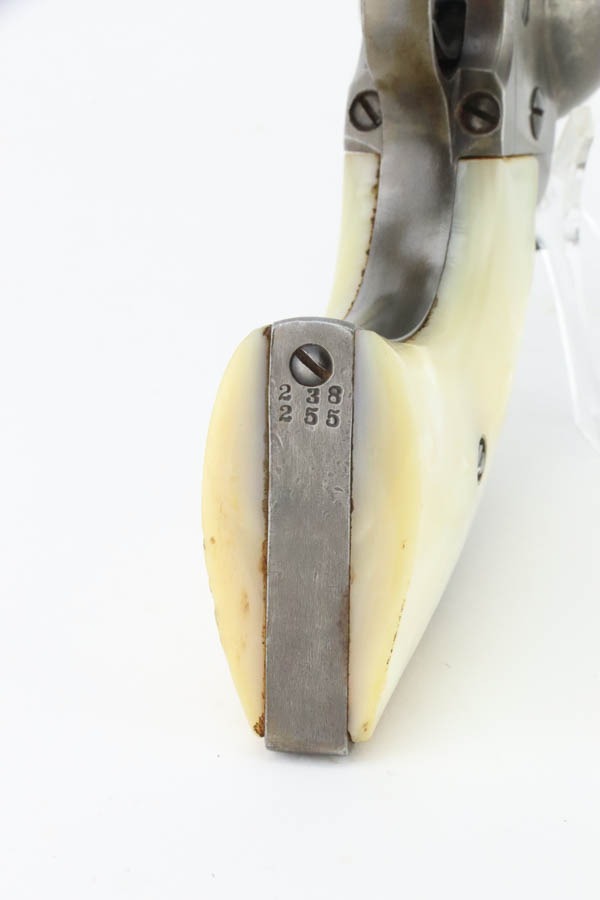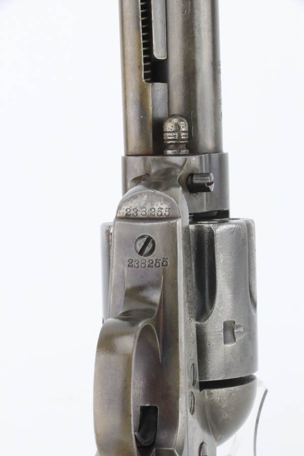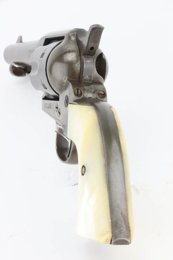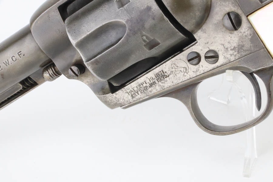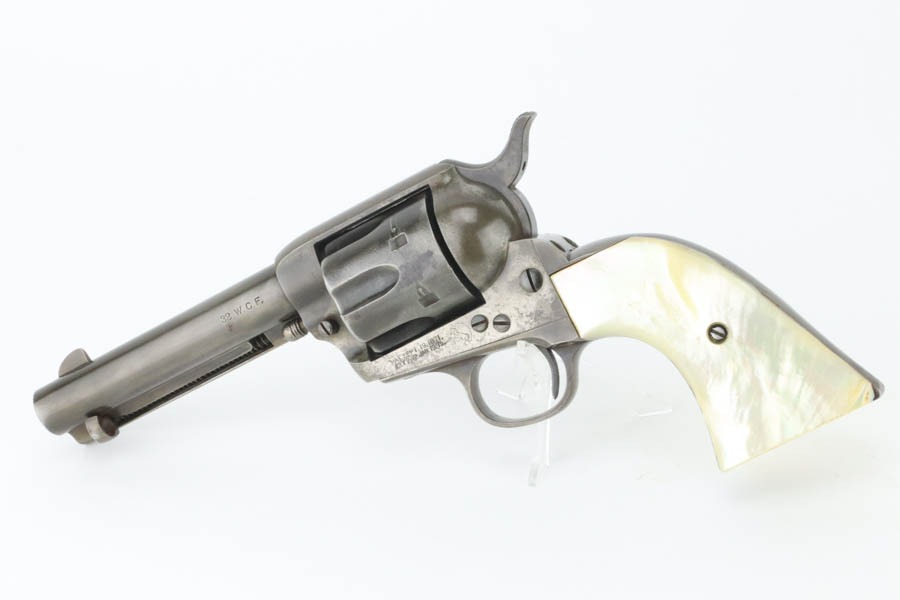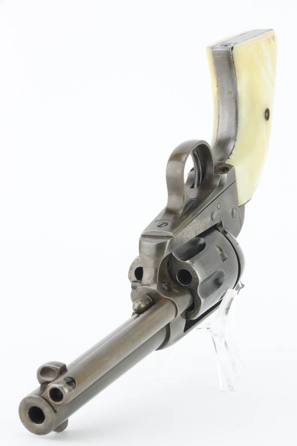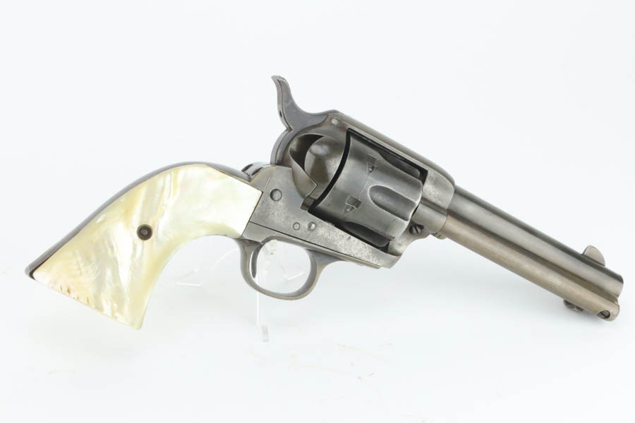 11/12/24 – This is a first generation Colt Single Action Army Revolver from 1903. Chambered in .32 WCF with a 4.75″ barrel. All matching. There is obvious thinning with light brown patina throughout. Areas of light pitting mostly on the frame and on the cylinder. Fitted with beautiful mother-of-pearl grips – tiny chip on the bottom edge of the left side, some small blemishes along the bottom edge of the right side. Fully functional. Smooth action. The bore has decent rifling, but there is pitting throughout.