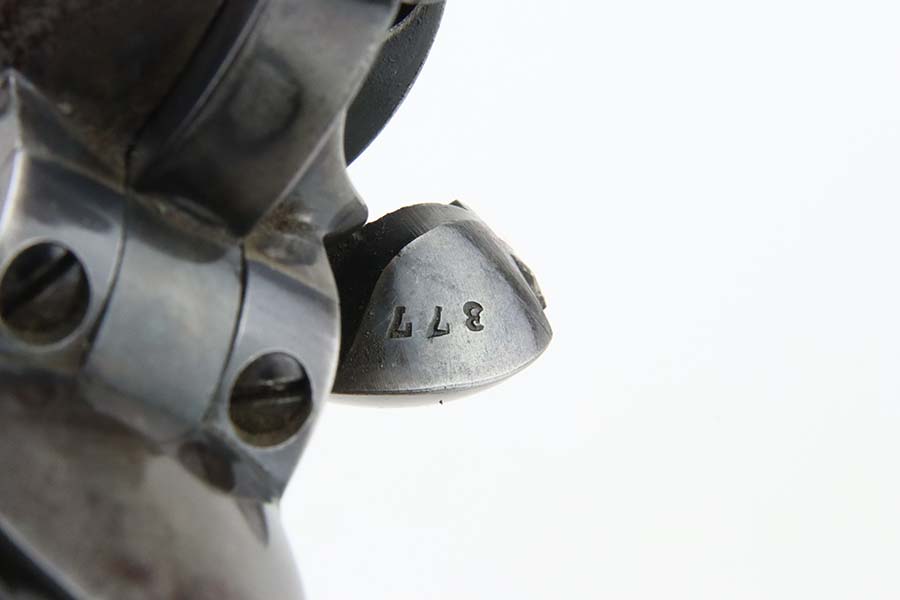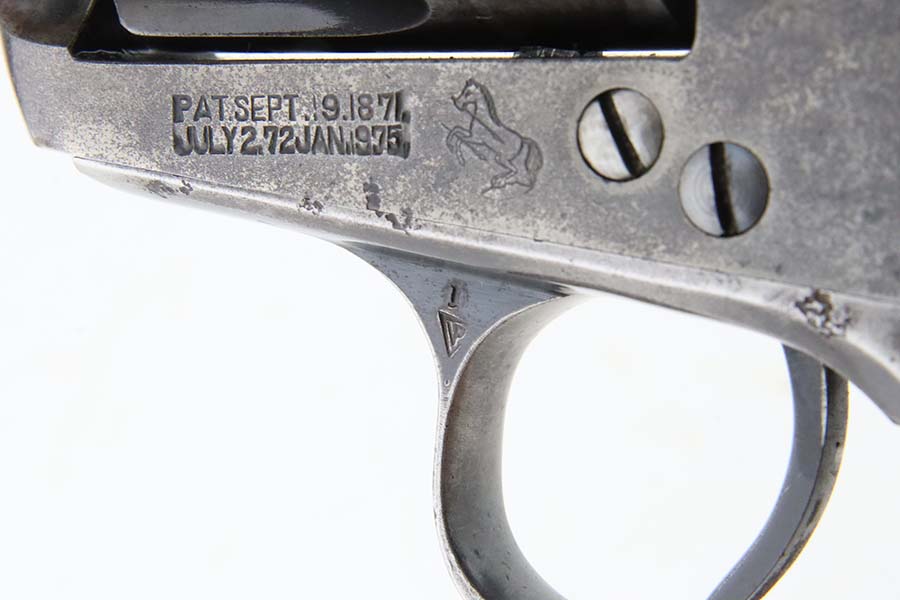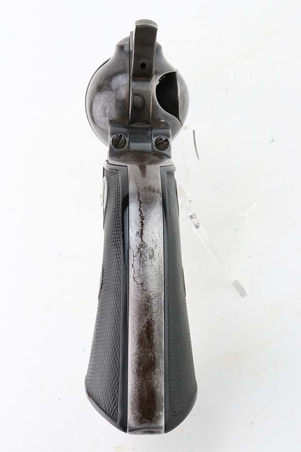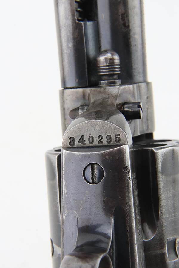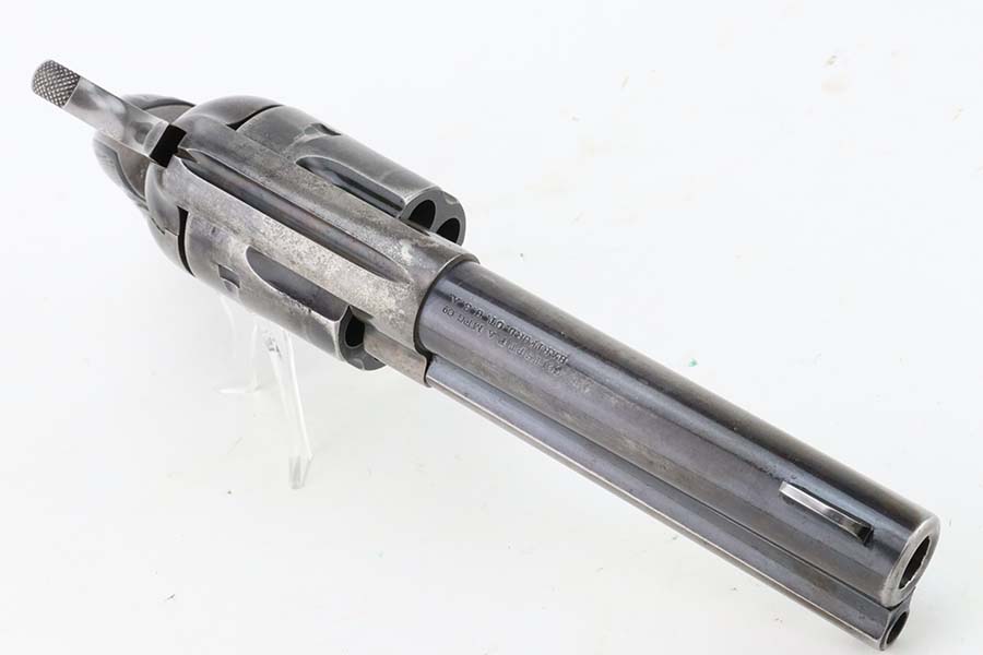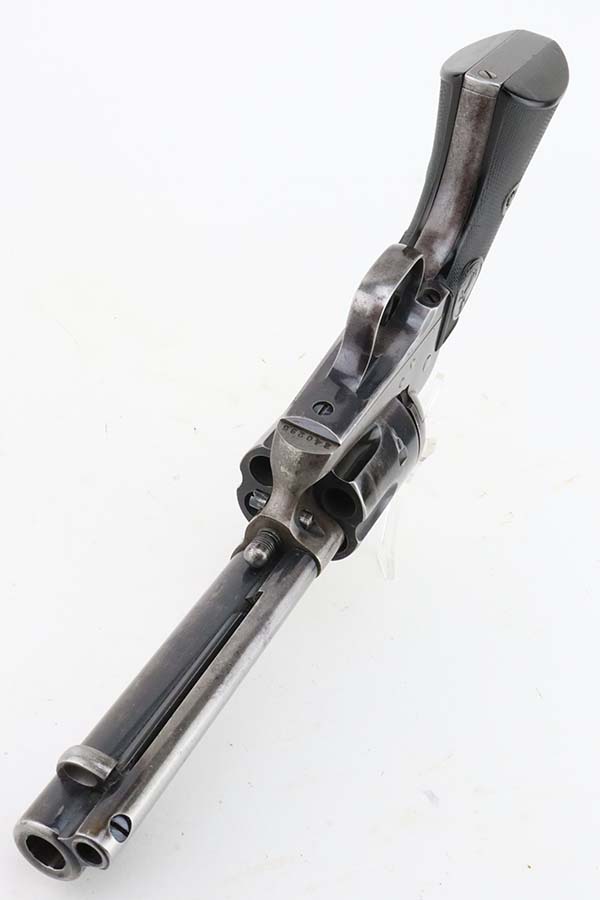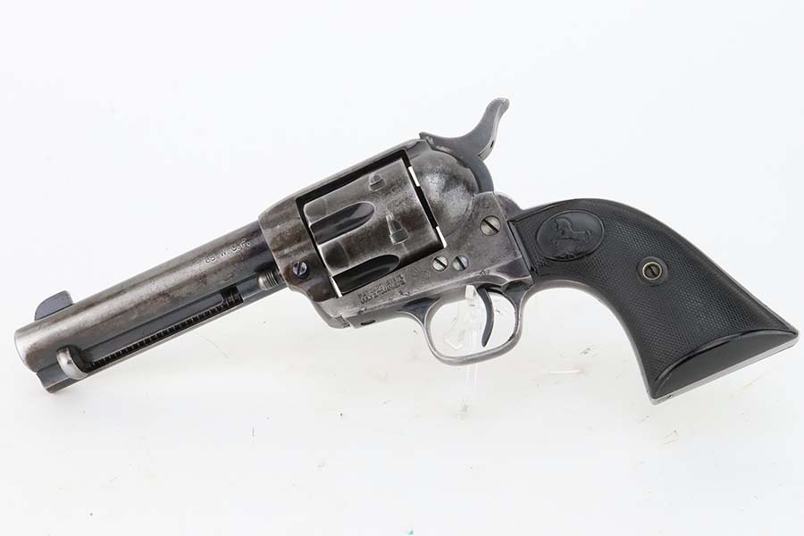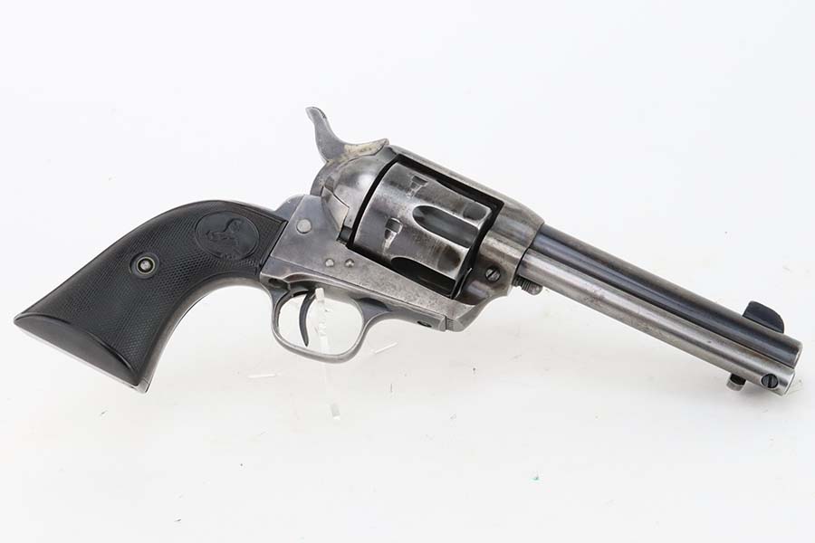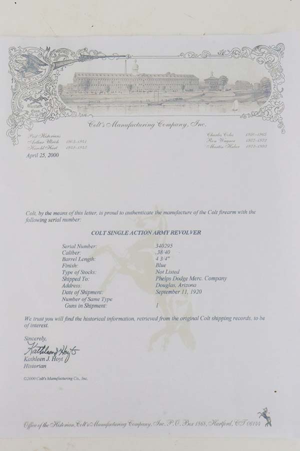 3/8/24 – This is a nice example of a First Generation Colt Single Action Army Revolver from 1920. Chambered in .38 WCF with a 4.75 inch barrel. According to the included Colt Factory letter, it was delivered to Phelps Dodge Merc Co in Douglas, Arizona on September 11, 1920. The letter is a photocopy of the original. The gun is all matching and has lost most of its original finish. There is spotty oxidation and “attic patina” throughout. Fitted with period-correct black hard rubber grips. The bore has pretty good rifling, but there is pin-pricking throughout.