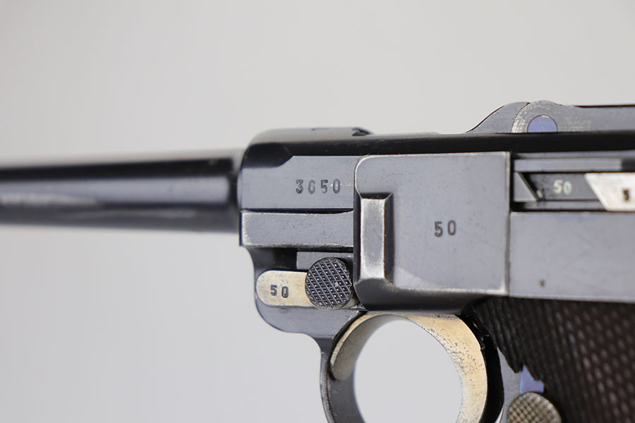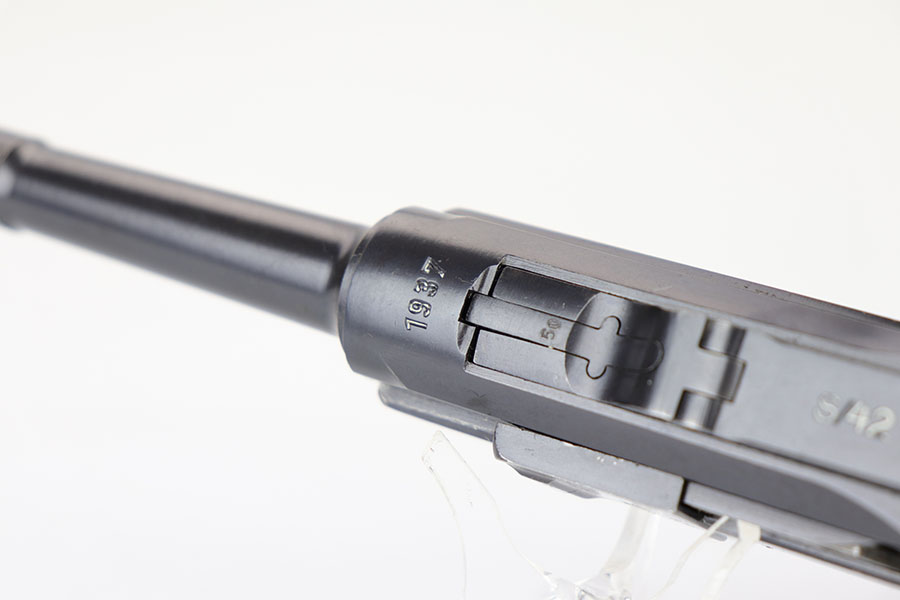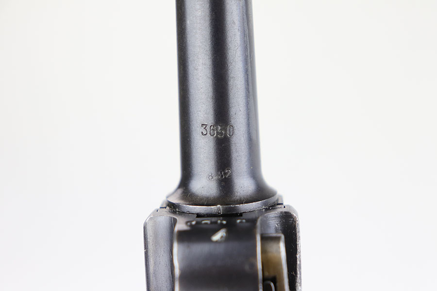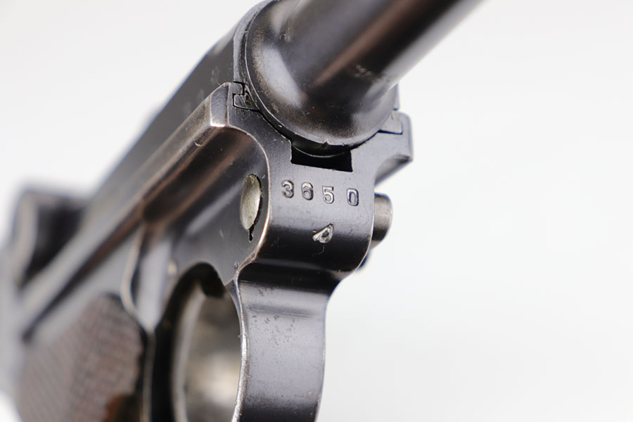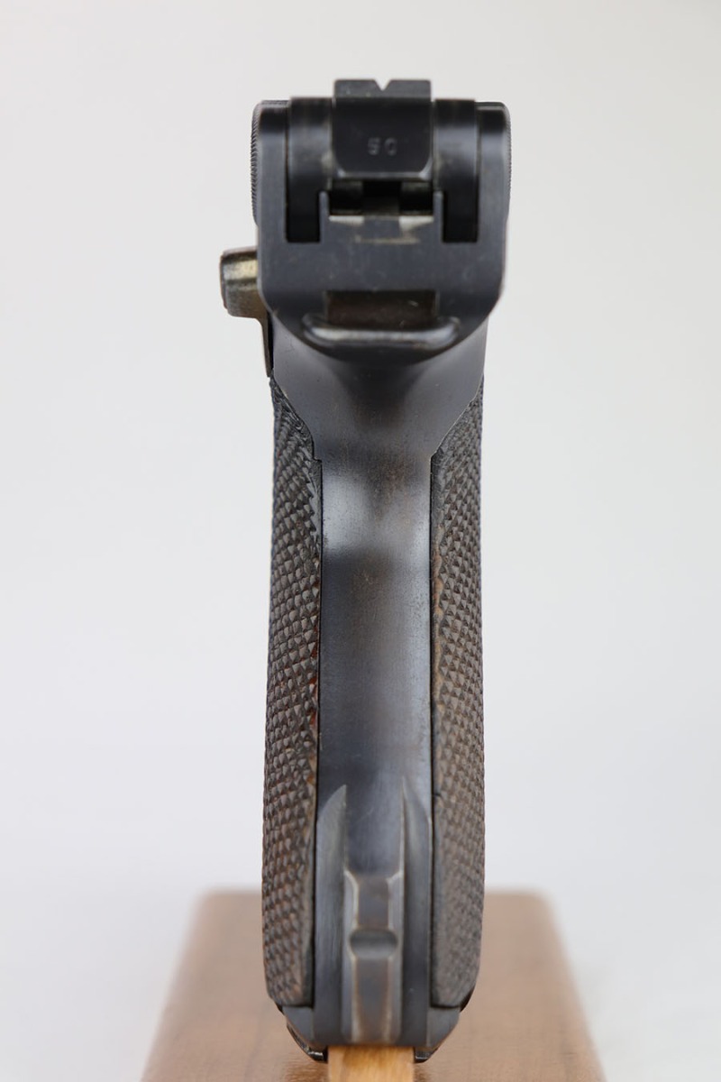 6/24/20 – This is an early variation of 1937 dated Mauser Luger with strawed small parts and rust blue finish. More scarce than the ‘G Date’ Lugers, excellent condition examples are difficult to find. This particular gun is all matching, including a rarely seen matched magazine and grips. It retains about 95% of its original finish with some light dulling on the grip straps, minimal high edge wear and a small rub mark on the left side of the barrel. Great bore and grips.