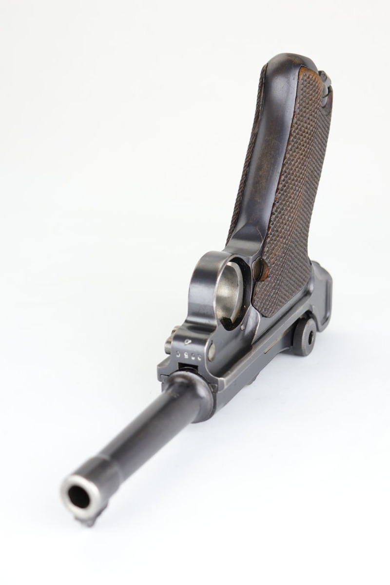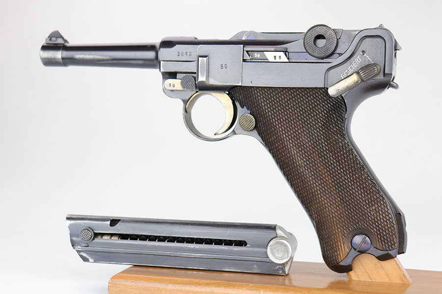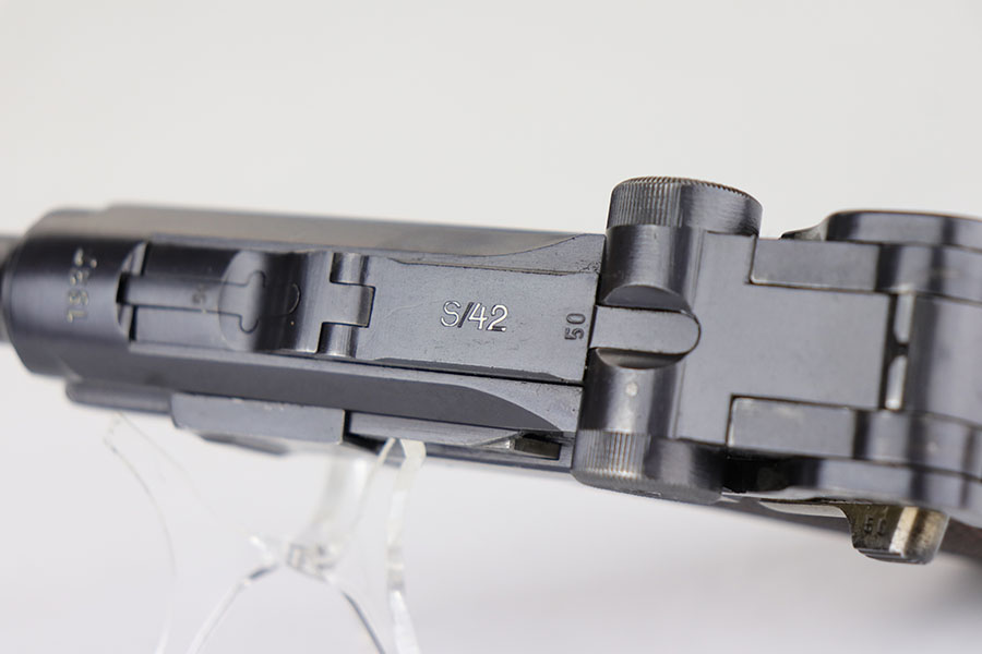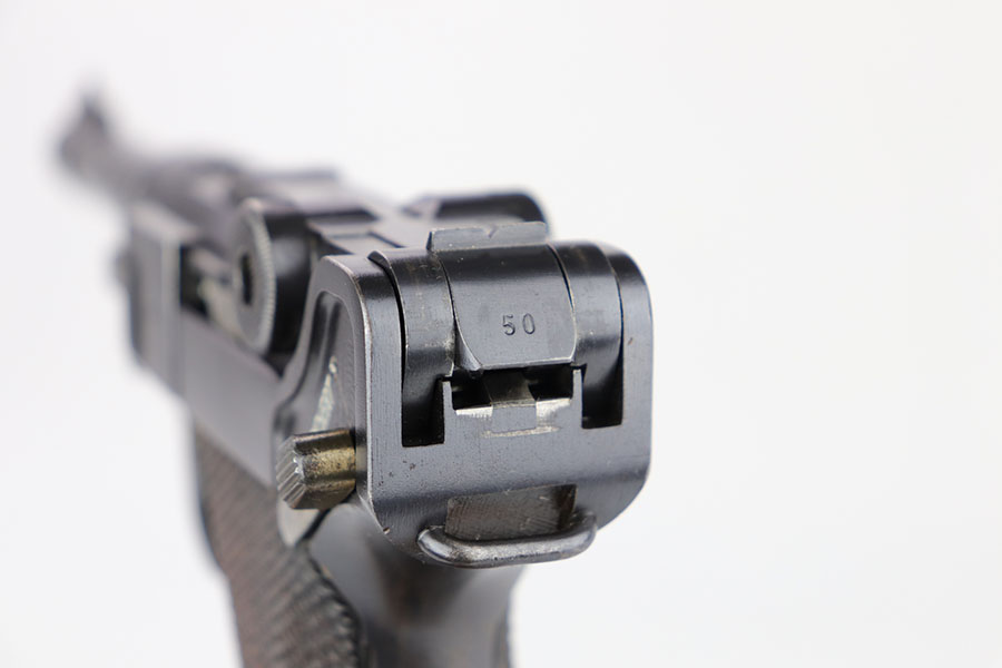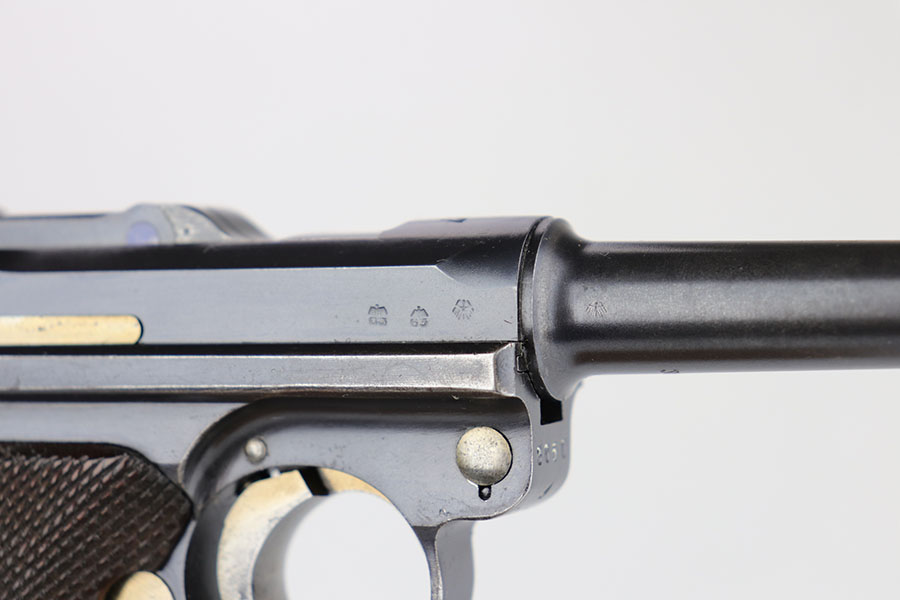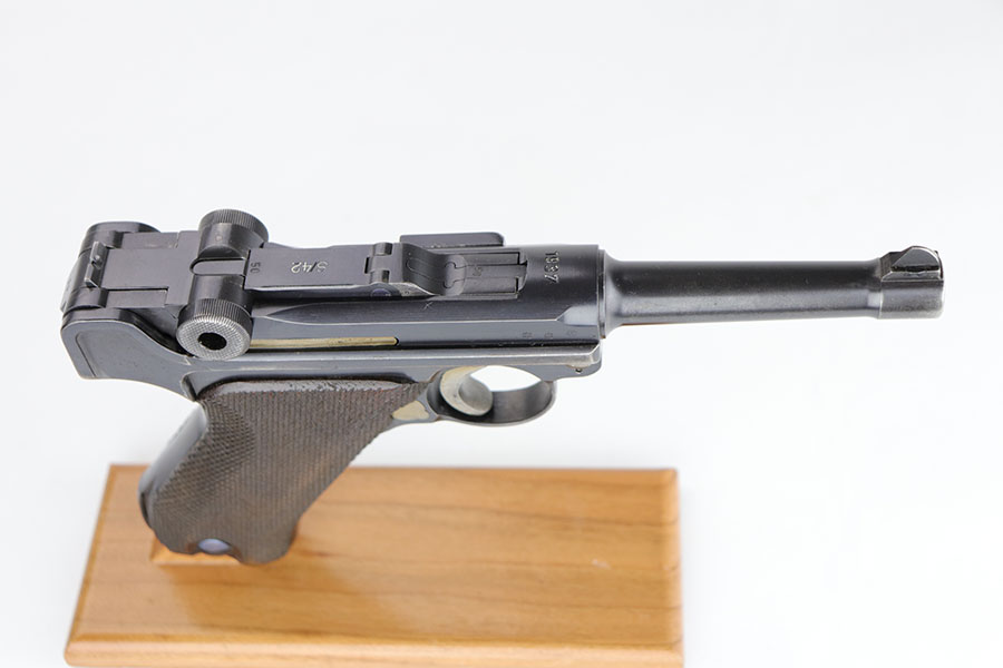 6/24/20 – This is an early variation of 1937 dated Mauser Luger with strawed small parts and rust blue finish. More scarce than the ‘G Date’ Lugers, excellent condition examples are difficult to find. This particular gun is all matching, including a rarely seen matched magazine and grips. It retains about 95% of its original finish with some light dulling on the grip straps, minimal high edge wear and a small rub mark on the left side of the barrel. Great bore and grips.