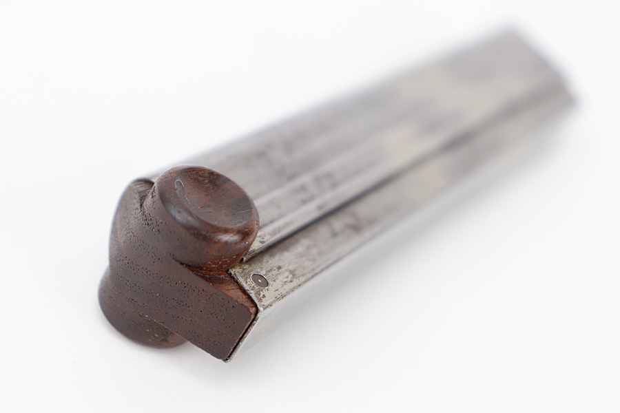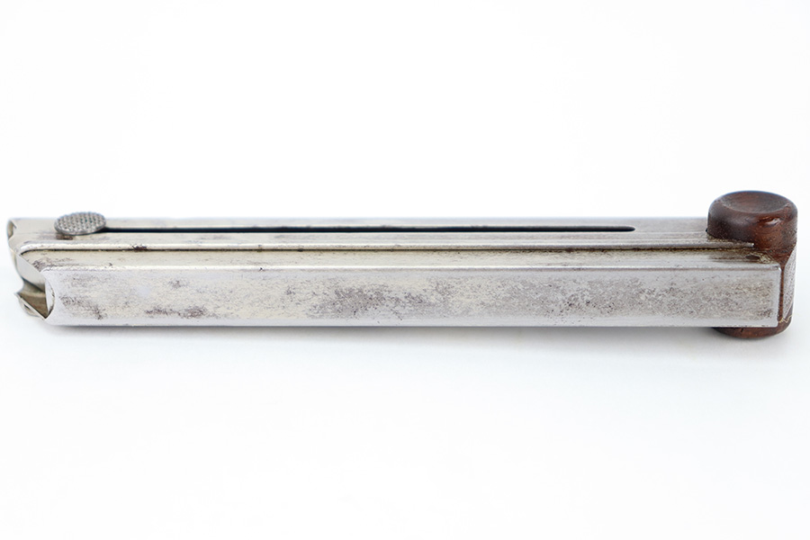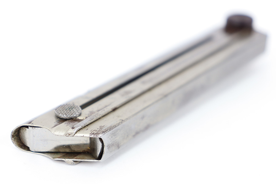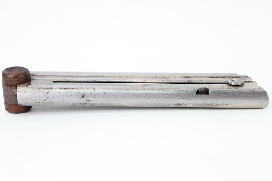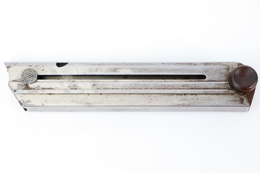 12/18/23 – This is an original early 1900’s Luger magazine with a flat button for an unrelieved frame luger. This is a rare early variation that’s hard to find and highly collectible. This example is in good overall condition with natural age and surface patina on the tube. No rust or pitting and a fully functional spring. The wood base is unmarked and in excellent condition.