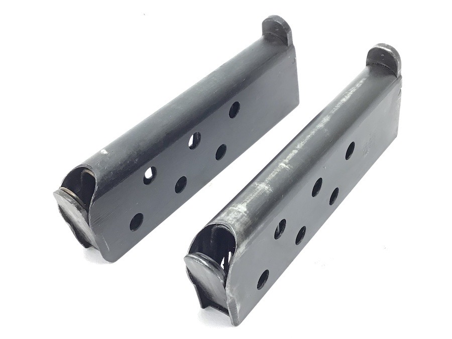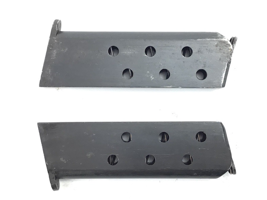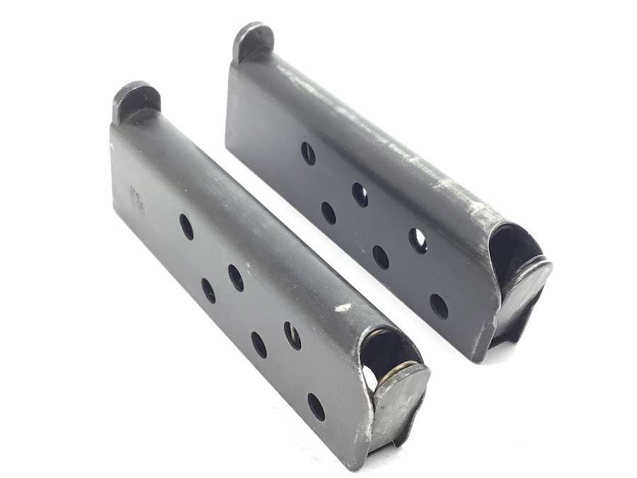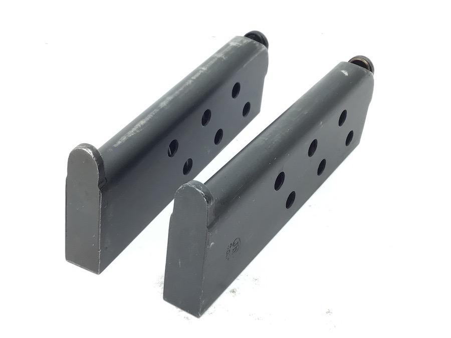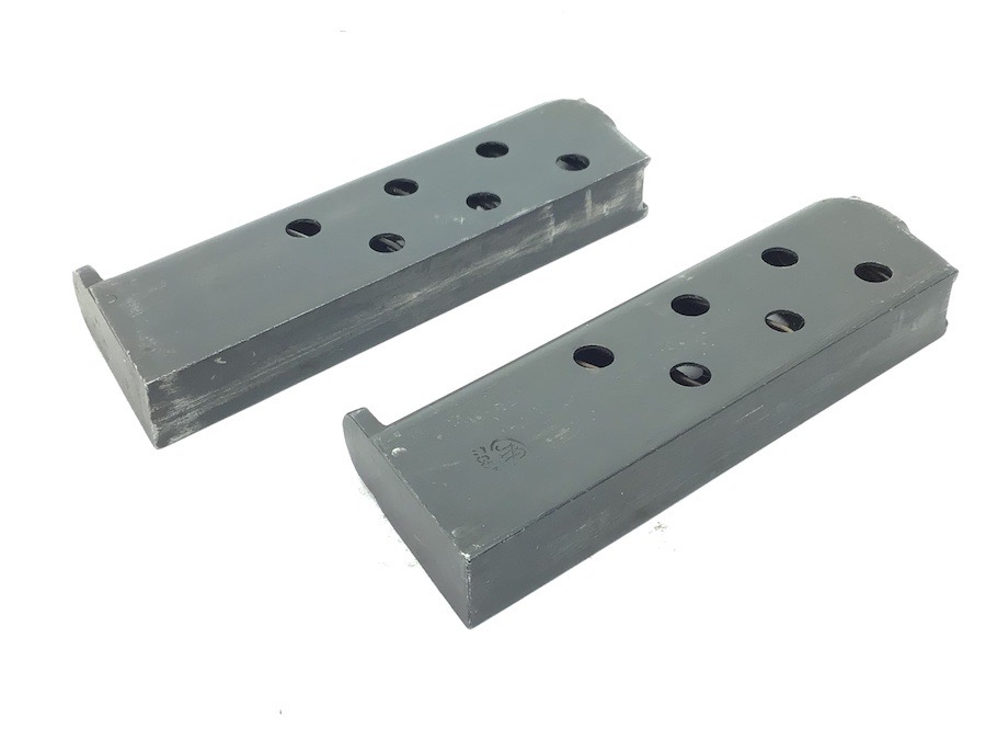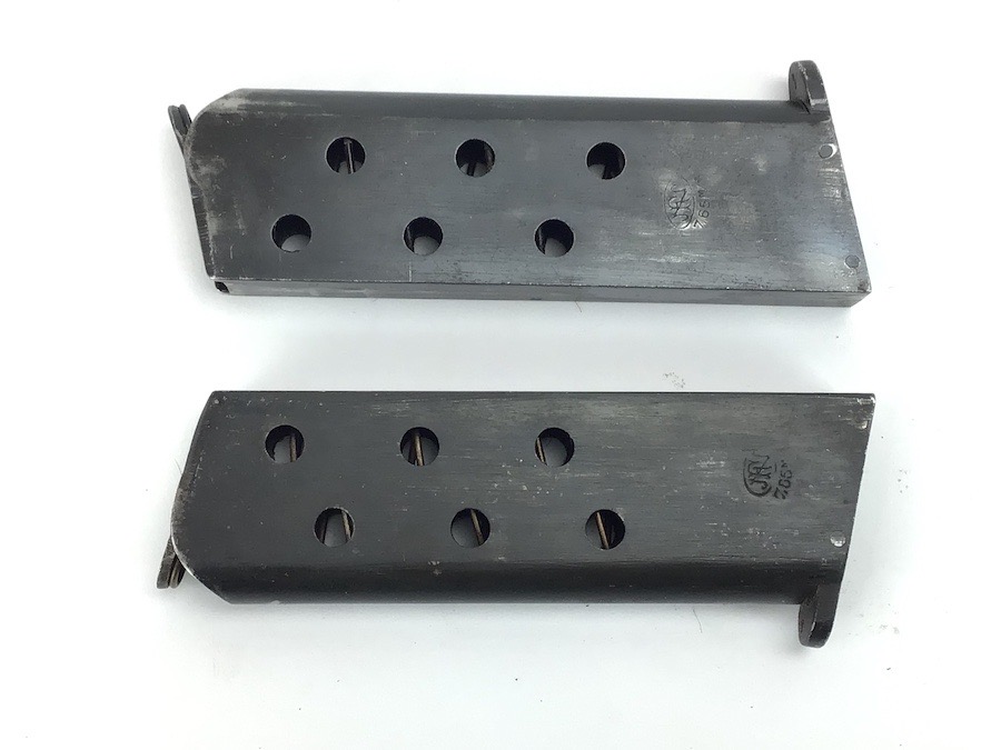 3/4/24 – These are original FN model 1910 magazine in 7.65mm. The magazines are FN logo stamped on the right and left side, respectively . Nice finish throughout, and a strong fully functional springs. Both are stamped on the toe of the base.
