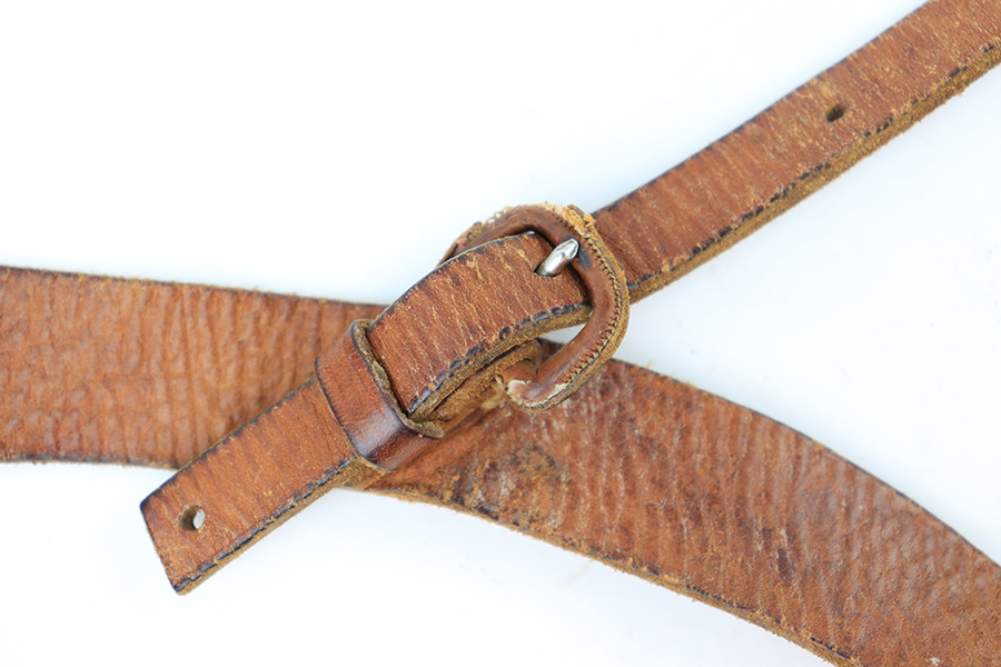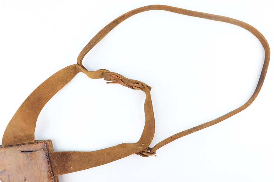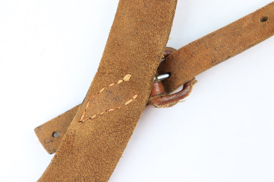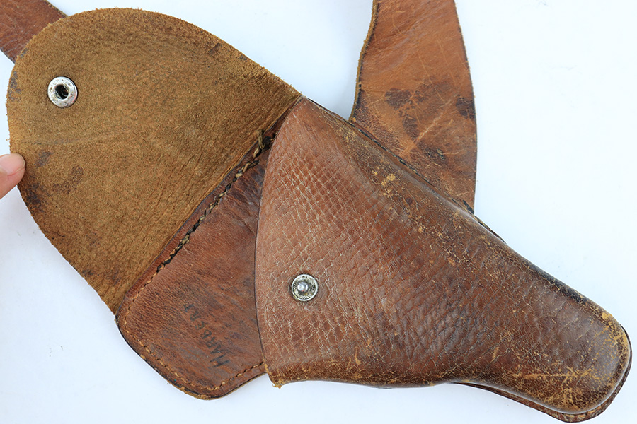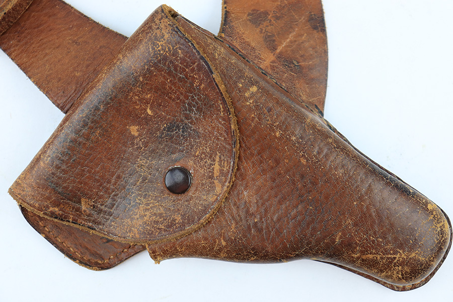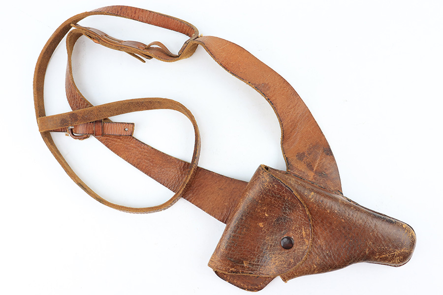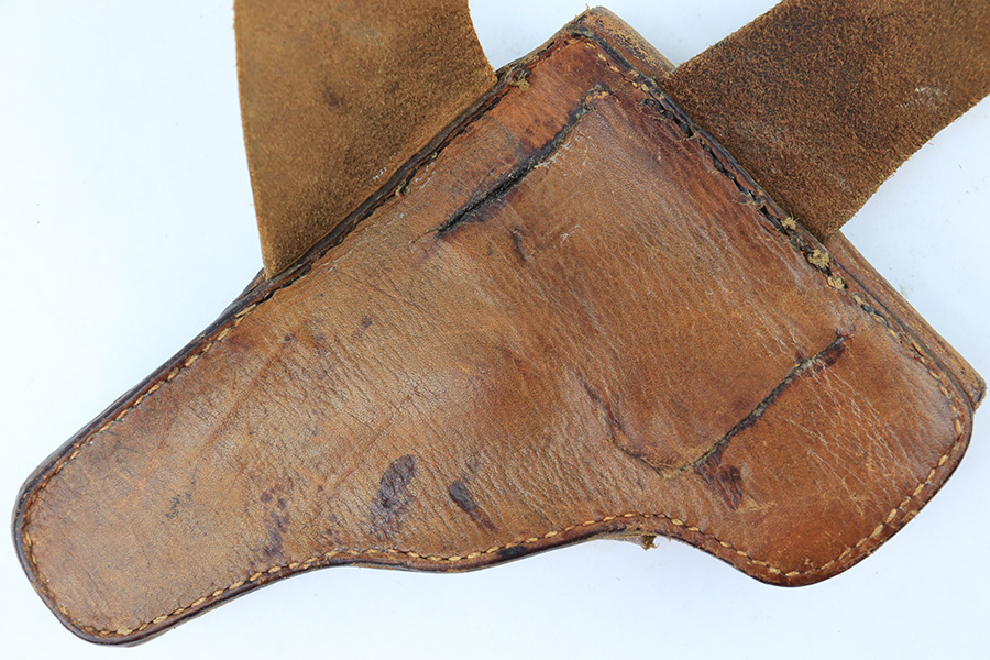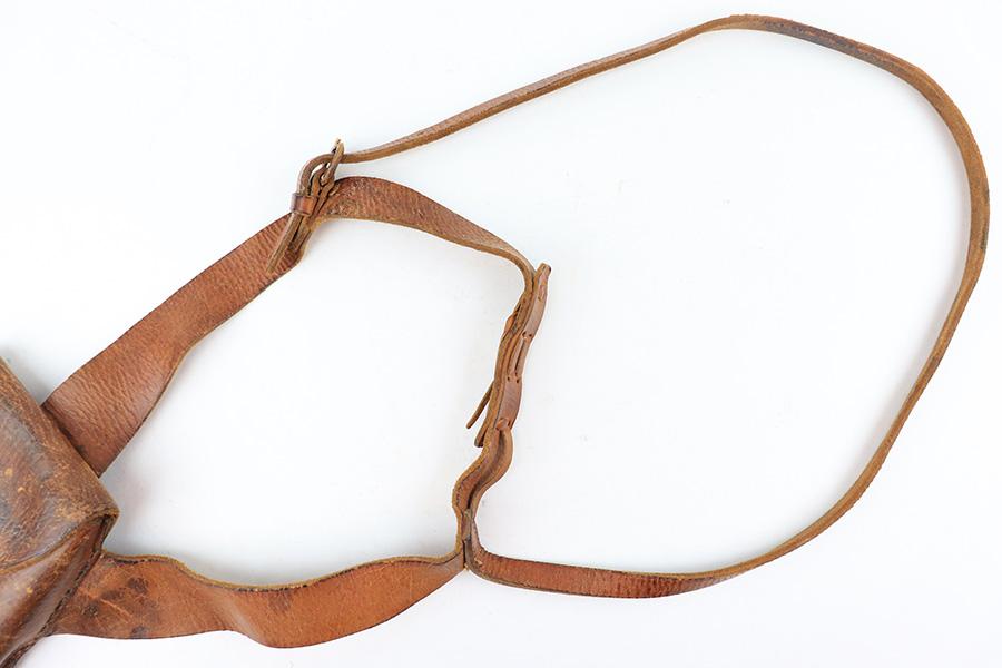 7/25/23 – This is a leather shoulder holster that fits a Mauser model 1910 or 1914, FN model 1910, or similar sized 6.35mm pistol. A Walther PPK fits, but very snug inside the leather. There are no markings or stamps, and we suspect this is likely a WW2 era modified holster. The back leather has two cuts for threading through a belt, if desired. The leather is soft and pliable throughout with normal wrinkling and typical signs of aging. The shoulder strap is completely intact with light surface wear but no major issues.