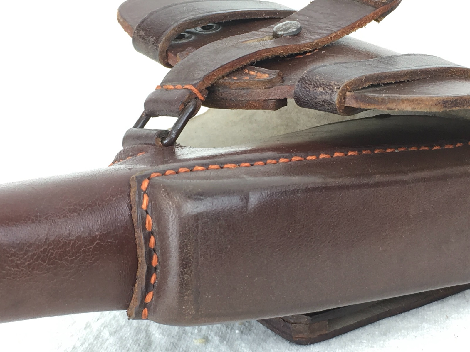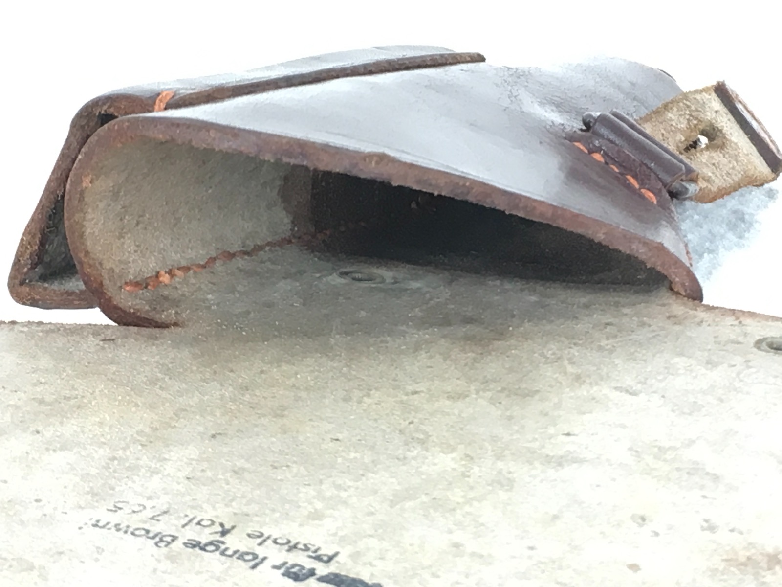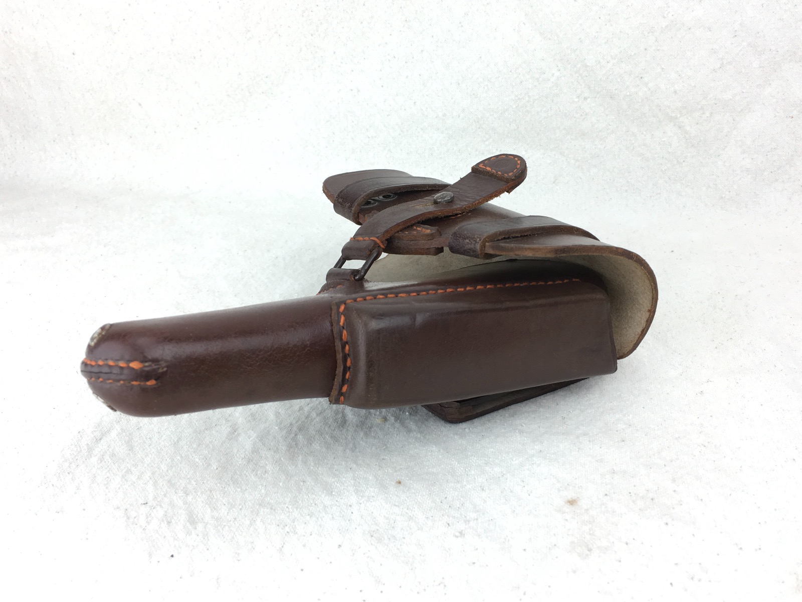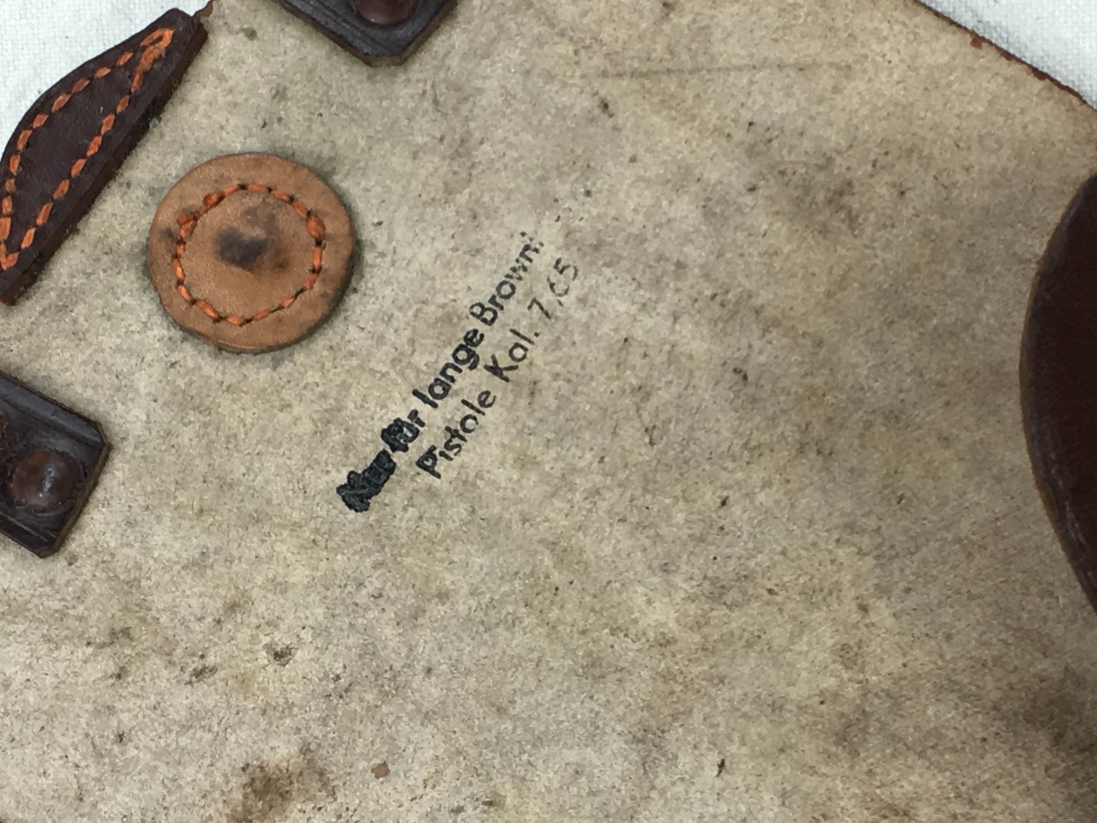 11/27/18 – Luftwaffe 7,65mm Pistol Holster for the FN Browning Model 1922 Pistol. The leather construction holster has one large belt-loop on the back. The holster has a stitched on spare magazine pouch. The interior of the top flap is ink stamped with ‘Nur für lange Browning-Pistole Kal. 7.65’ (Only for the long Browning pistol, Caliber 7.65mm). The closure is maker mark stamped and dated with ‘jhg 43’ indicating production by the company of ‘Gustav Genschow & Co AG’ in Altstadt-Hachenburg. Excellent example in mint and unissued condition. Clean leather in excellent condition. Very minor surface corrosion on the bottom vent holes, but hardly noticeable. All parts are guaranteed original, authentic and fully functional.