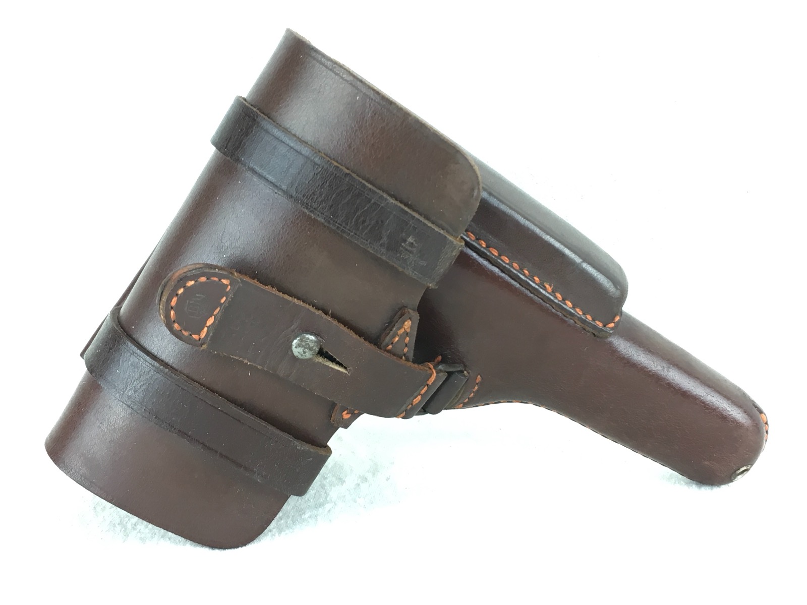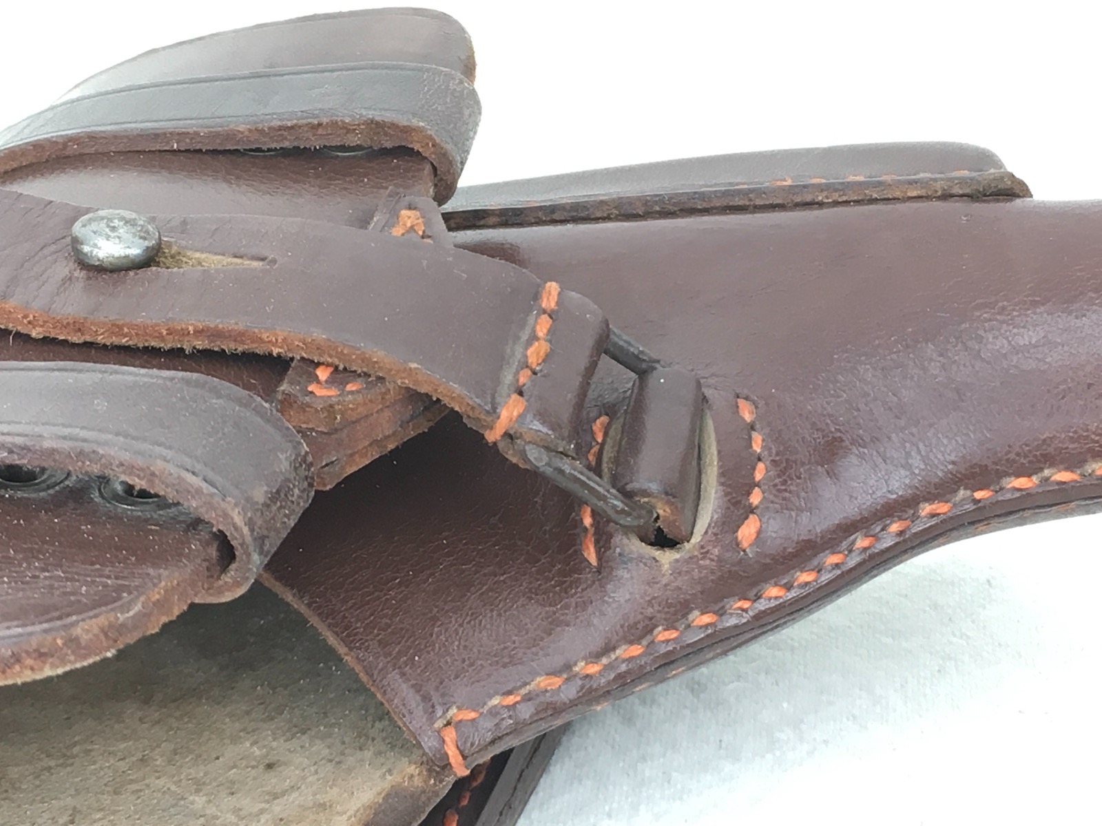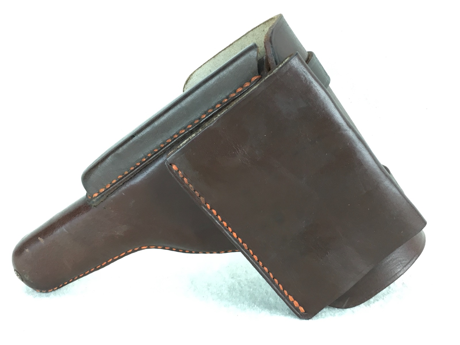 11/27/18 – Luftwaffe 7,65mm Pistol Holster for the FN Browning Model 1922 Pistol. The leather construction holster has one large belt-loop on the back. The holster has a stitched on spare magazine pouch. The interior of the top flap is ink stamped with ‘Nur für lange Browning-Pistole Kal. 7.65’ (Only for the long Browning pistol, Caliber 7.65mm). The closure is maker mark stamped and dated with ‘jhg 43’ indicating production by the company of ‘Gustav Genschow & Co AG’ in Altstadt-Hachenburg. Excellent example in mint and unissued condition. Clean leather in excellent condition. Very minor surface corrosion on the bottom vent holes, but hardly noticeable. All parts are guaranteed original, authentic and fully functional.