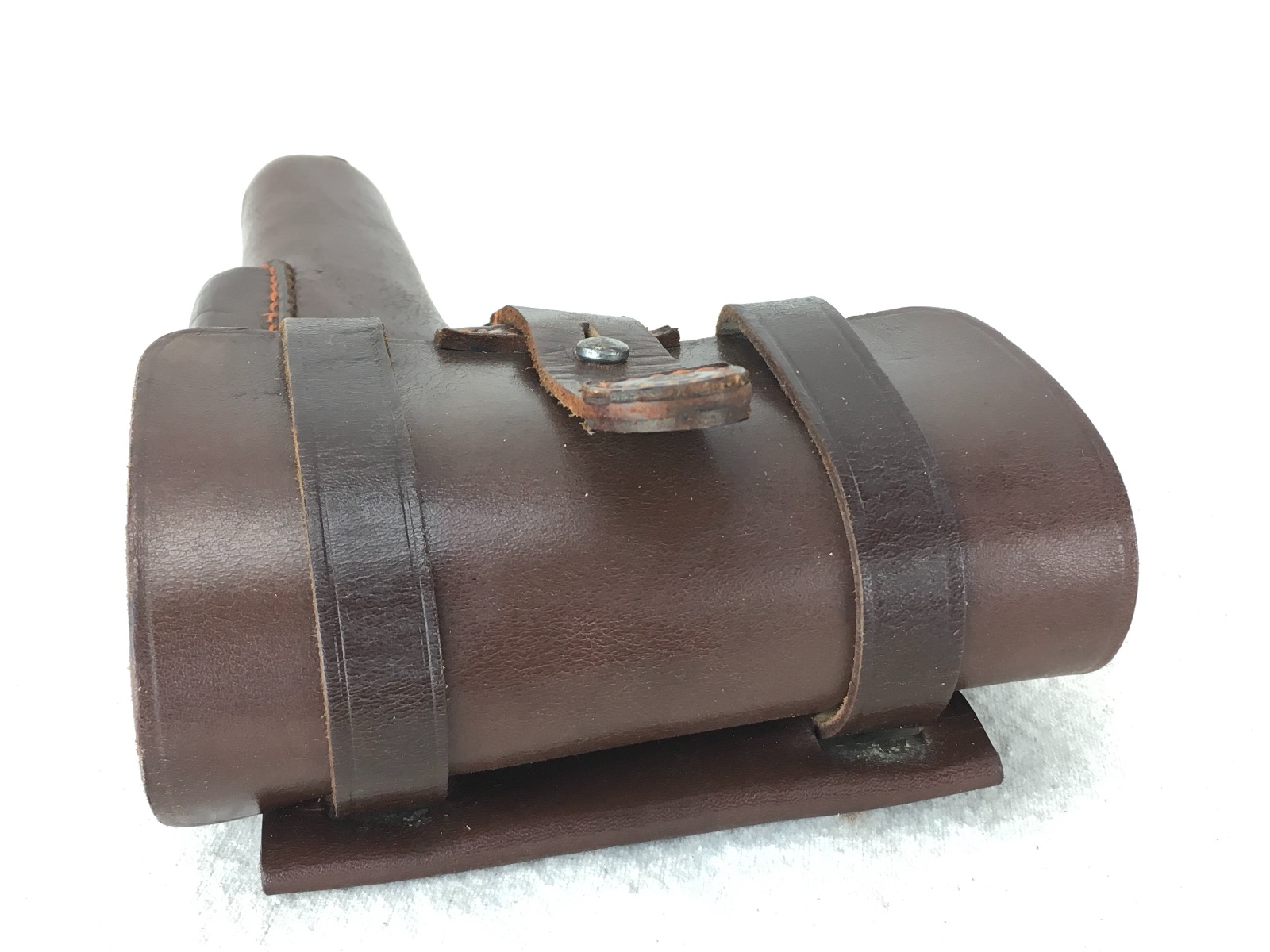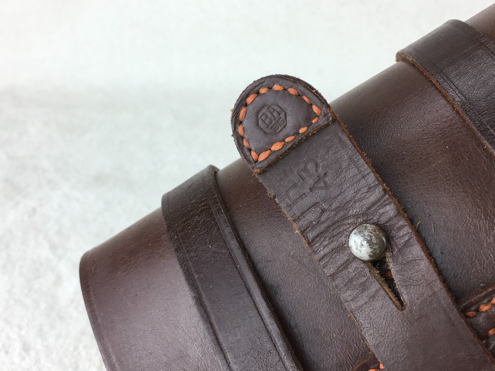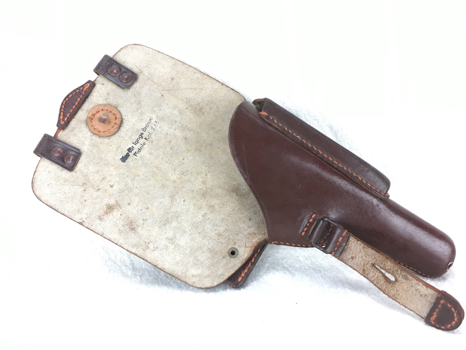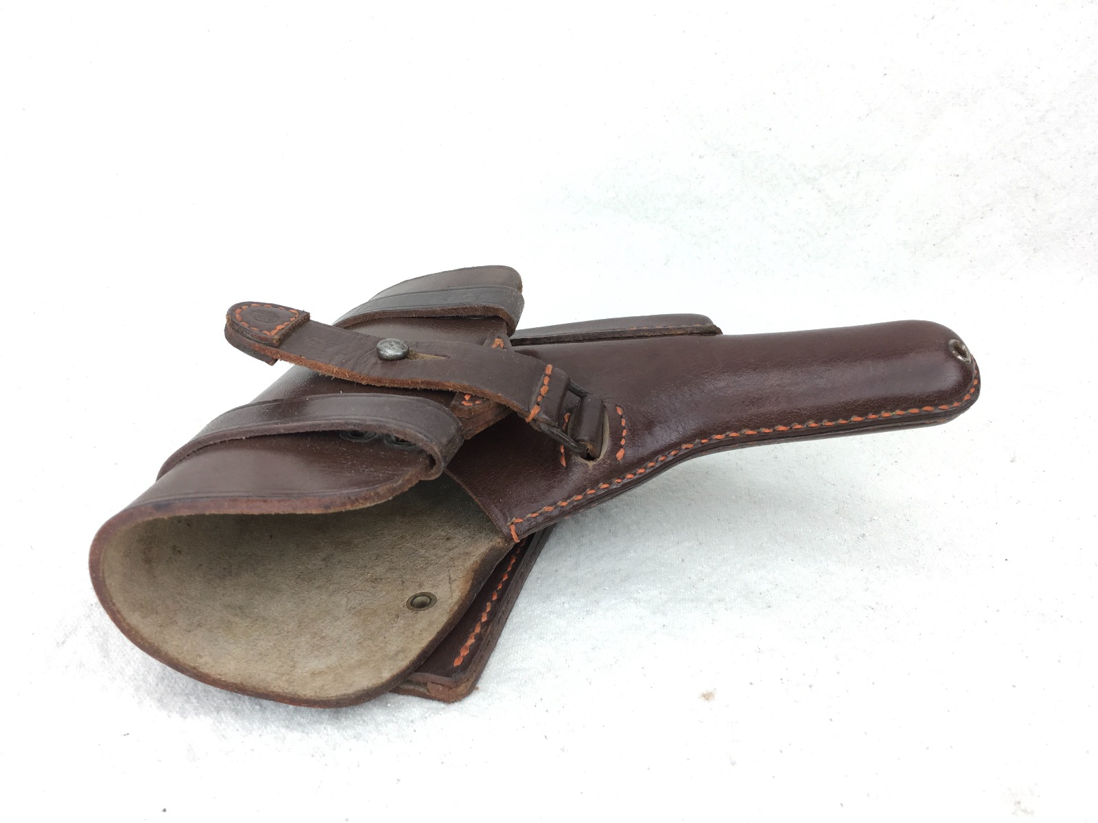 11/27/18 – Luftwaffe 7,65mm Pistol Holster for the FN Browning Model 1922 Pistol. The leather construction holster has one large belt-loop on the back. The holster has a stitched on spare magazine pouch. The interior of the top flap is ink stamped with ‘Nur für lange Browning-Pistole Kal. 7.65’ (Only for the long Browning pistol, Caliber 7.65mm). The closure is maker mark stamped and dated with ‘jhg 43’ indicating production by the company of ‘Gustav Genschow & Co AG’ in Altstadt-Hachenburg. Excellent example in mint and unissued condition. Clean leather in excellent condition. Very minor surface corrosion on the bottom vent holes, but hardly noticeable. All parts are guaranteed original, authentic and fully functional.