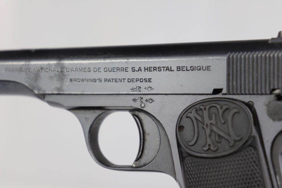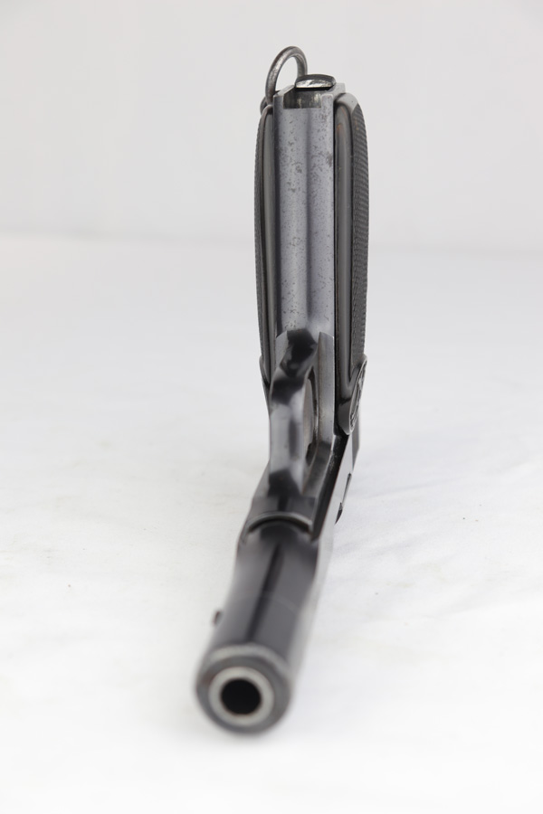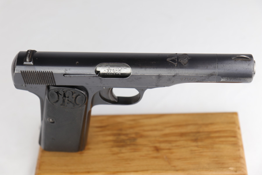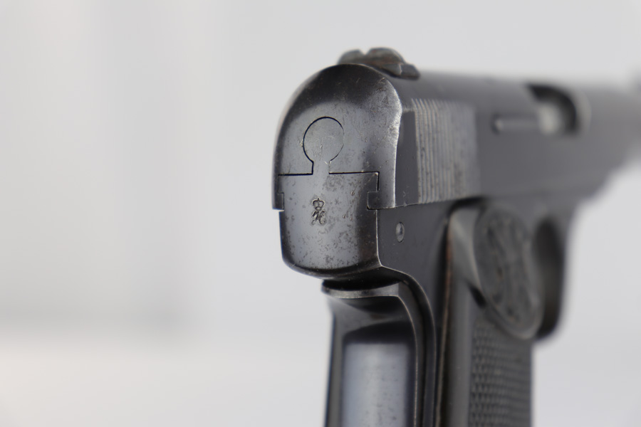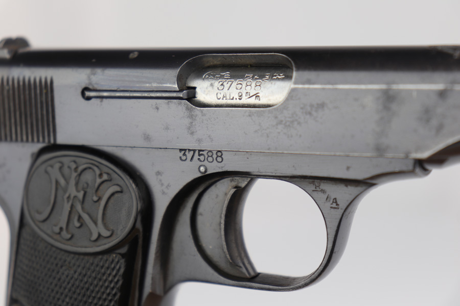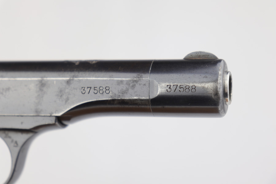 6/4/18 – This is an original Dutch contract FN model 1922 pistol made prior the WW2. The pistol comes with an original holster, cleaning rod, and matching serial numbered magazine. The holster and cleaning rod are both original Dutch issued as well, but have a different serial number than the gun and magazine. The holster & cleaning rod do however match each other (35188). The pistol is in about 92% original condition with some discoloration and beginning signs of pitting on the slide as well as a few spots on the frame, most namely the front and back straps. The pistol is all original and matching serial numbered 37588 including one factory original numbered magazine. The holster and cleaning rod are in excellent condition. The bore has some normal wear and light patina, an 8 out of 10 overall. Guaranteed original.