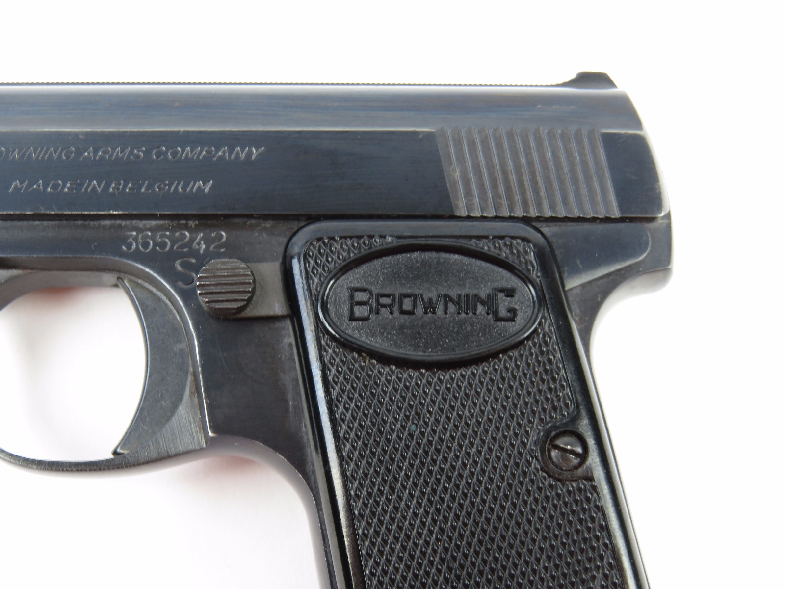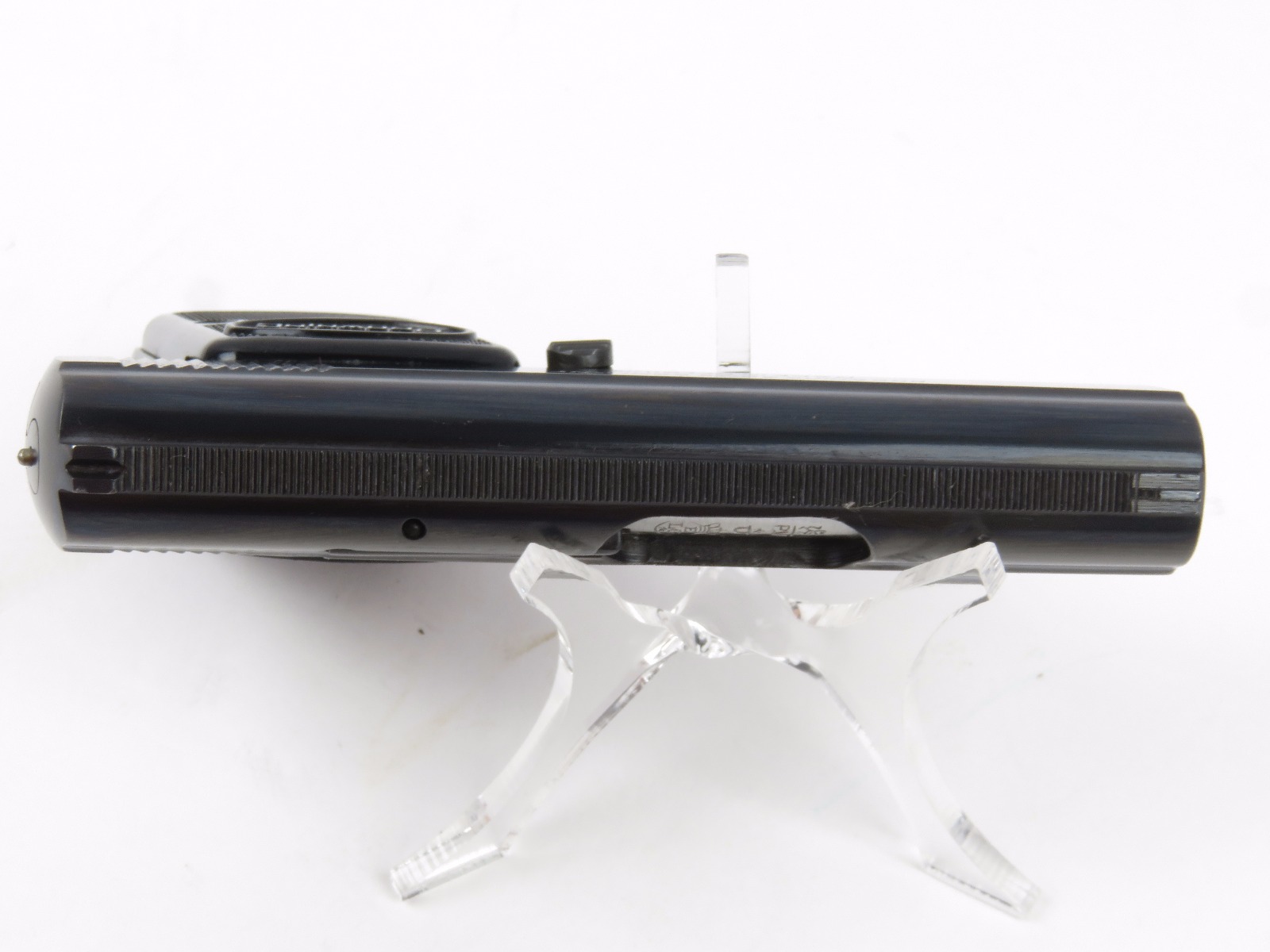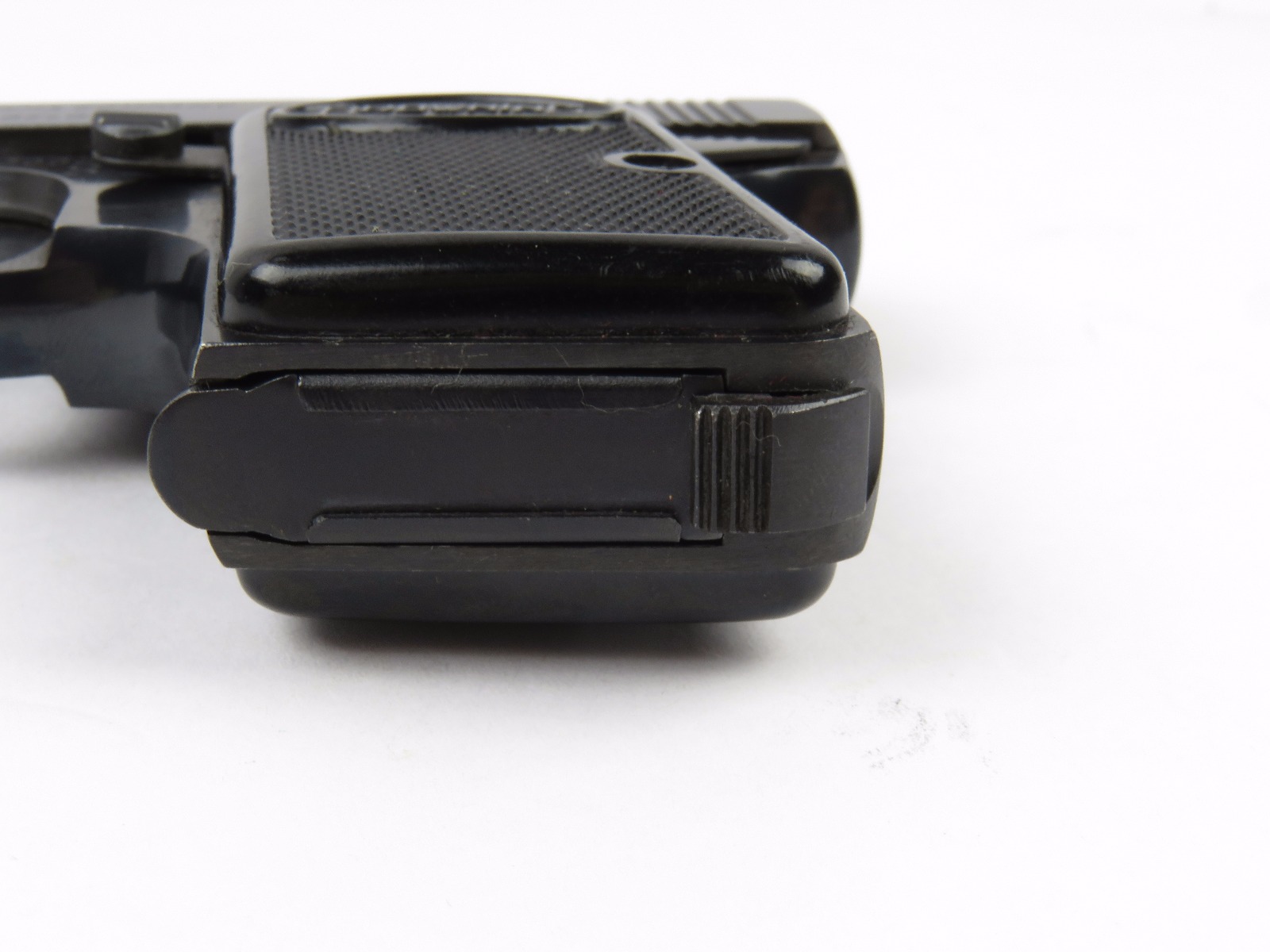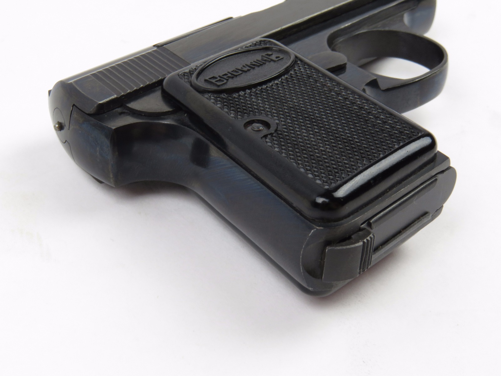 10/12/17 – This is an original Belgian made Baby Browning pistol. The finish is minty, with barely any wear throughout the pistol. The left side of the pistol has some dark spotting under the ejection port – which is shown in one of the photos (at the right angle). Very hard to see even with the naked eye. The pistol is beautiful with original grips in tact and an excellent magazine. The bore is mint as well with a 10/10 rating. Comes with a small holding pouch (shown).