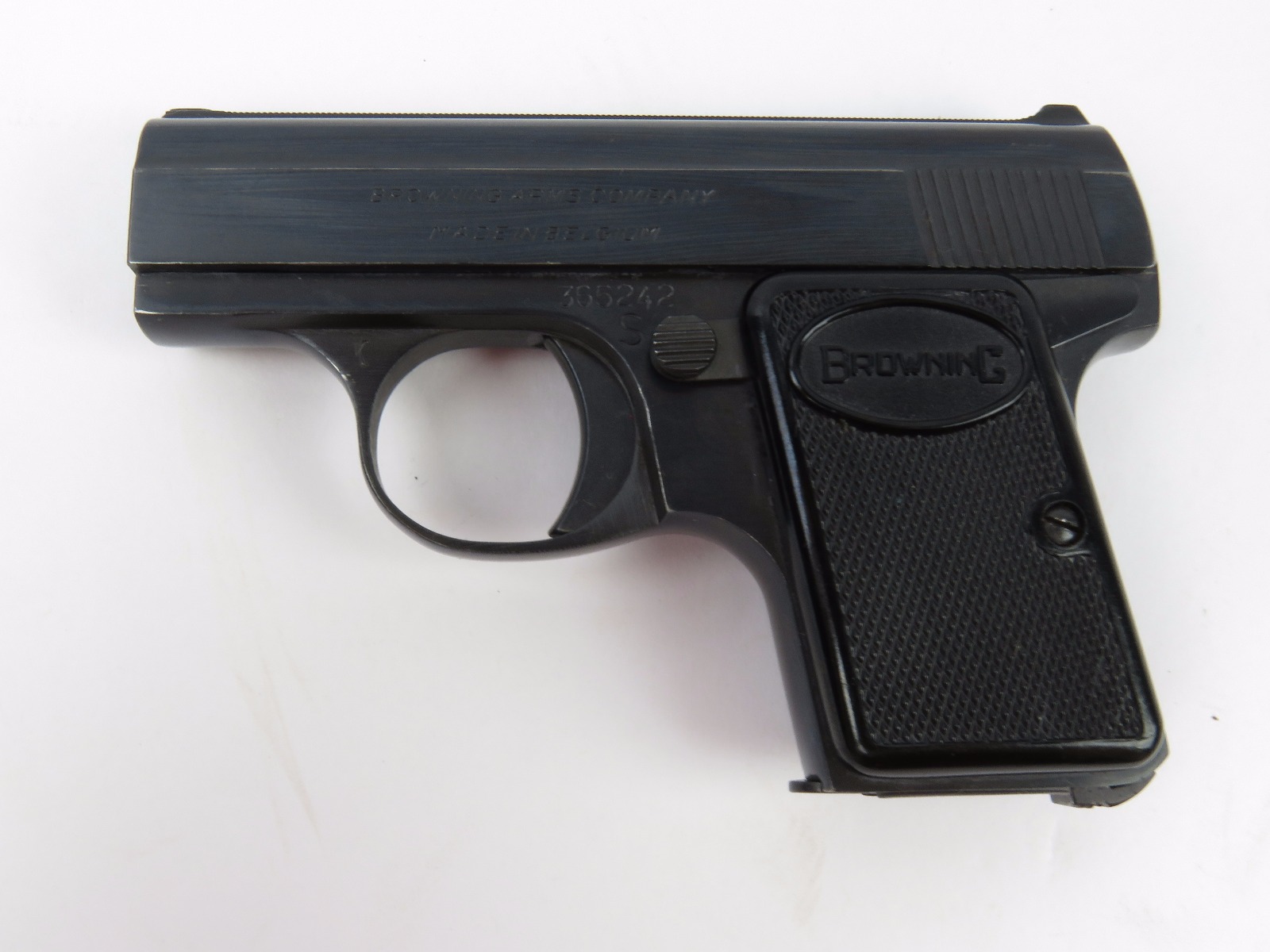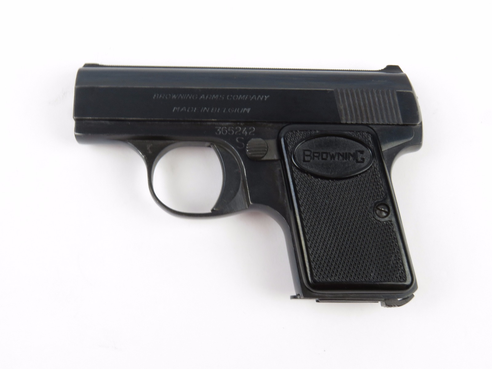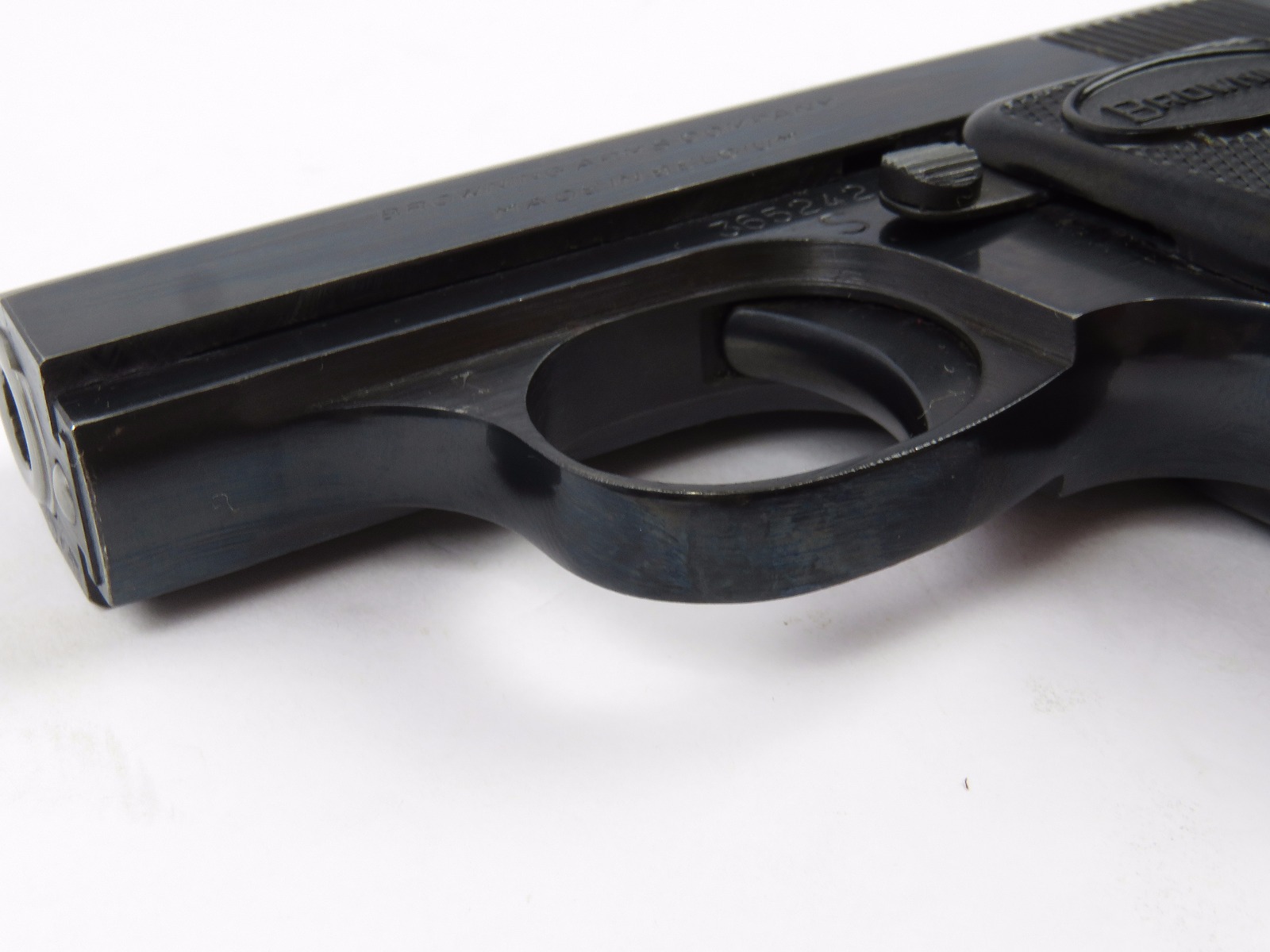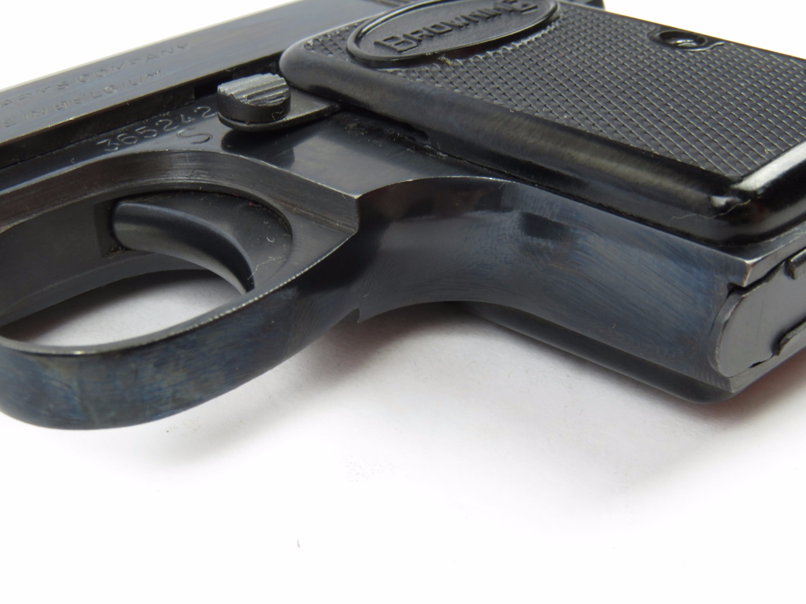 10/12/17 – This is an original Belgian made Baby Browning pistol. The finish is minty, with barely any wear throughout the pistol. The left side of the pistol has some dark spotting under the ejection port – which is shown in one of the photos (at the right angle). Very hard to see even with the naked eye. The pistol is beautiful with original grips in tact and an excellent magazine. The bore is mint as well with a 10/10 rating. Comes with a small holding pouch (shown).