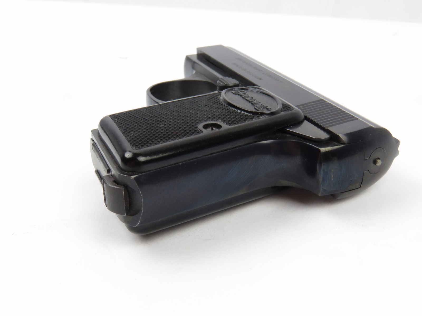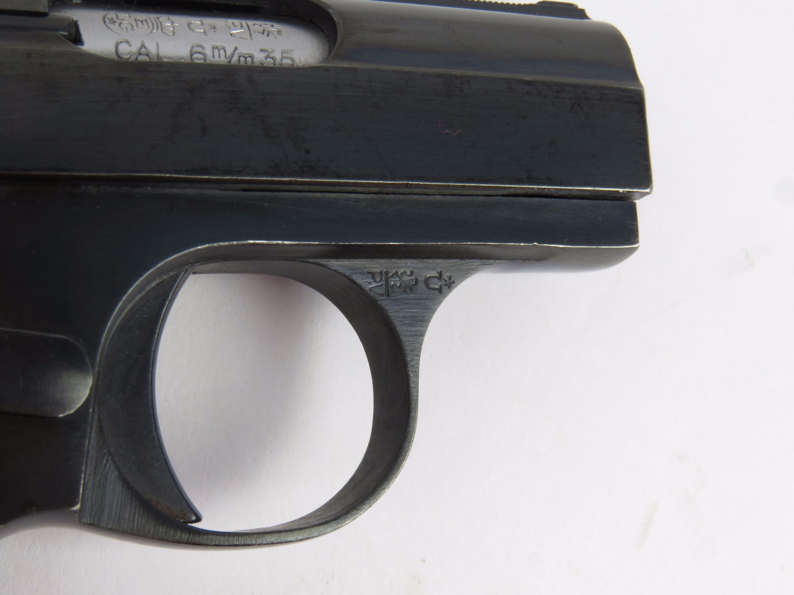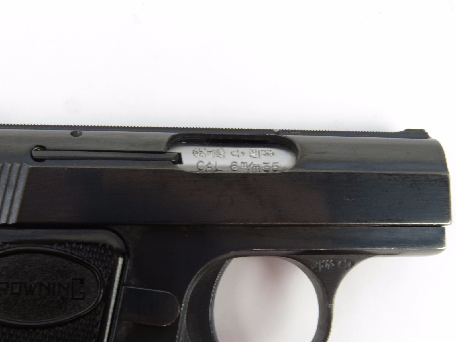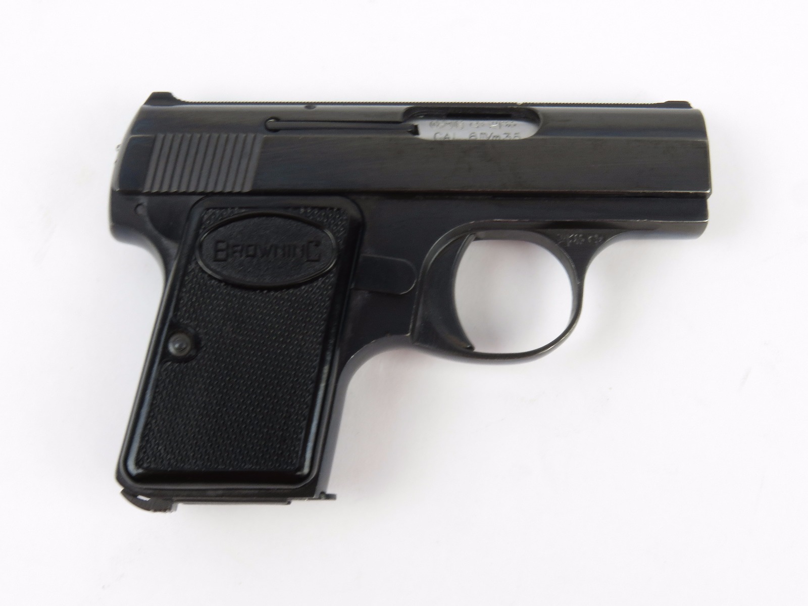 10/12/17 – This is an original Belgian made Baby Browning pistol. The finish is minty, with barely any wear throughout the pistol. The left side of the pistol has some dark spotting under the ejection port – which is shown in one of the photos (at the right angle). Very hard to see even with the naked eye. The pistol is beautiful with original grips in tact and an excellent magazine. The bore is mint as well with a 10/10 rating. Comes with a small holding pouch (shown).