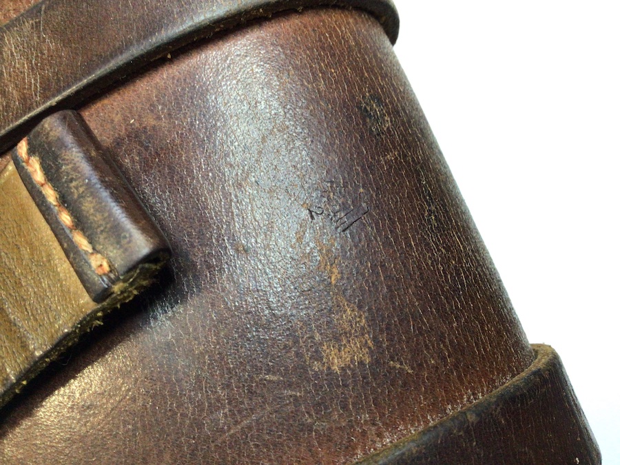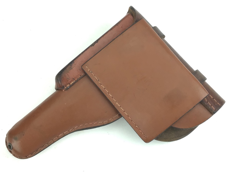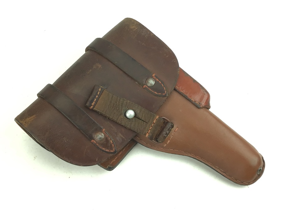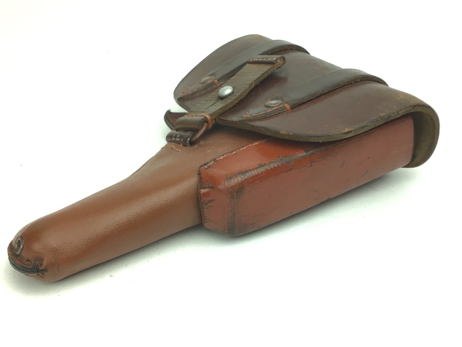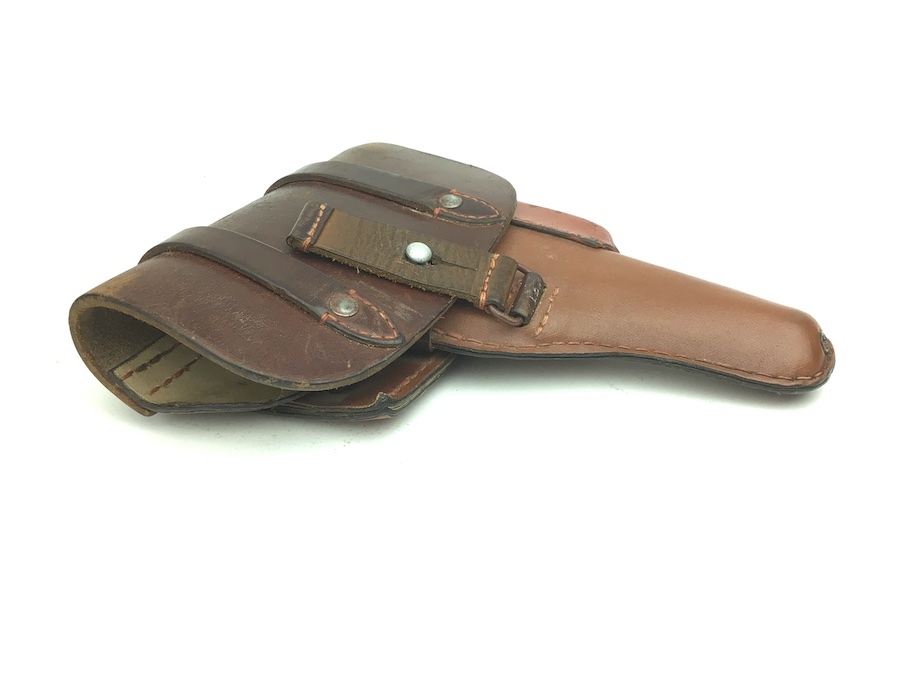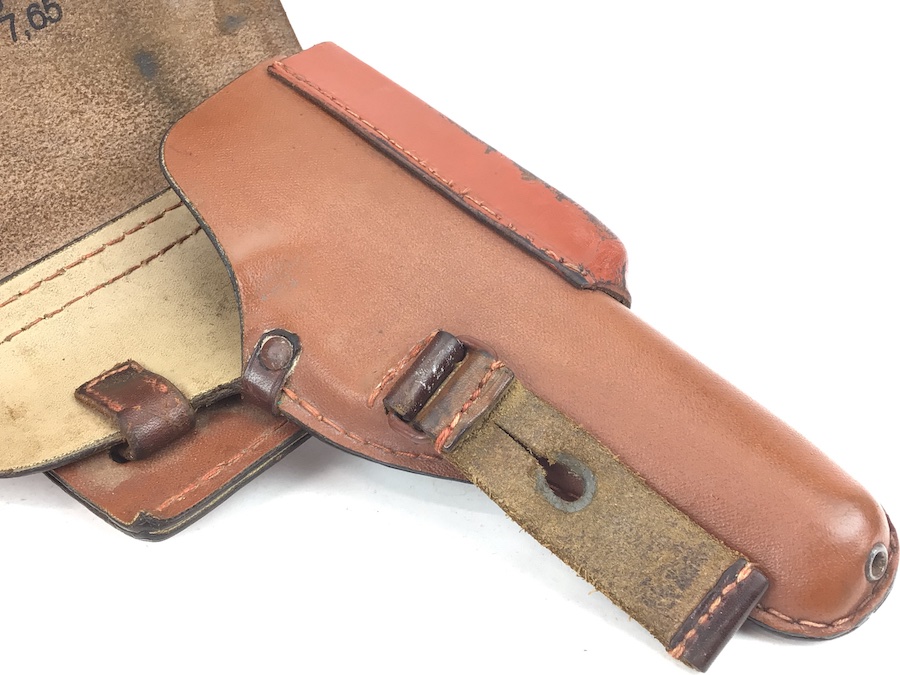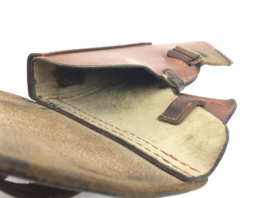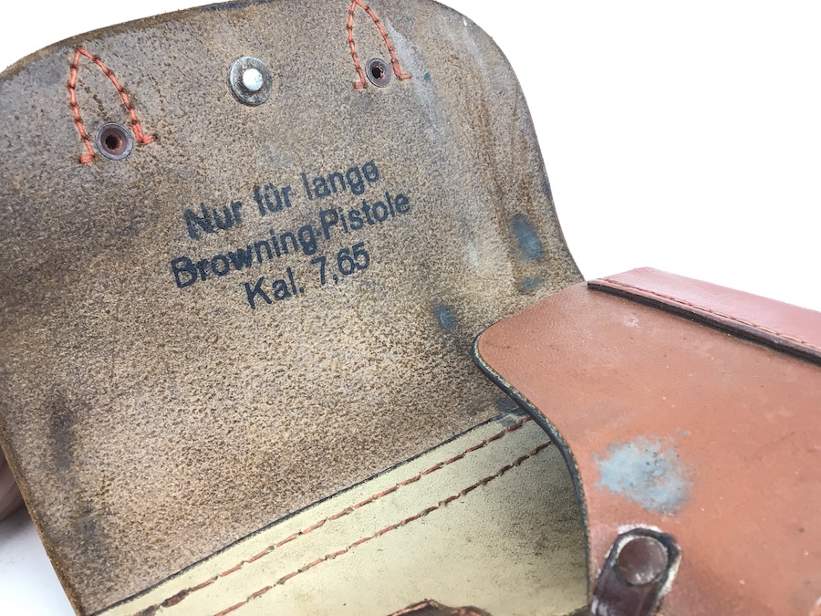 10/18/21 – This is an original WW2 era Luftwaffe Browning model 1922 holster. The front of the holster has a droop eagle/2 proof stamp. “HK Anchor” logo stamped on the belt loop. The top flap and closure strap are leather, but the body of this holster is ersatz material. This probably means late-ww2 manufacture. The interior of this holster is very clean, and ink stamped for a 7.65mm Browning pistol. The stitching is excellent and all original.