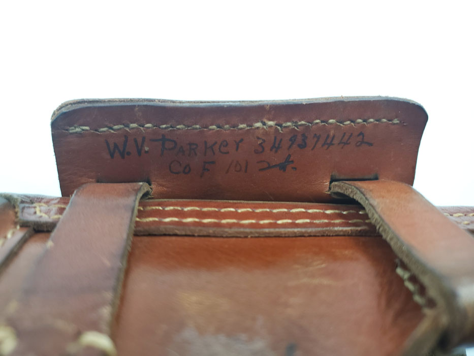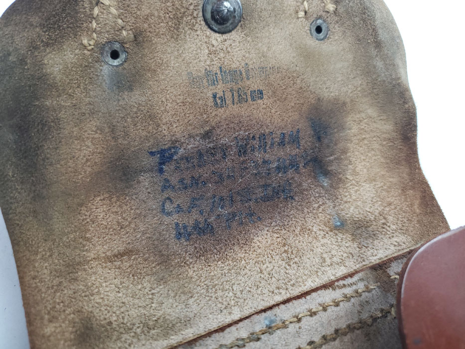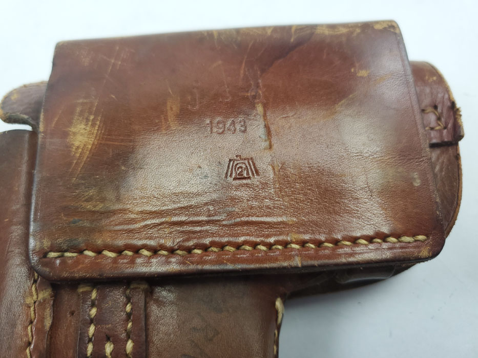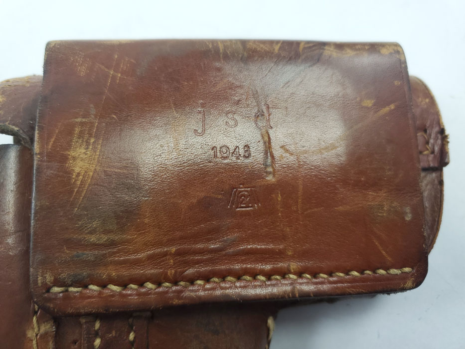 4/3/20 – This is an original 1943 dated holster for a FN Browning model 1922. The back of the holster is dated and maker stamped with a droop winged eagle proof stamp. The holster leather is soft and pliable with some surface scuffing on the exterior. The interior has G.I. writing – see photos. There’s also the original ink stamp from the factory on the interior leather. The stitching is all tight and in tact with no issues.