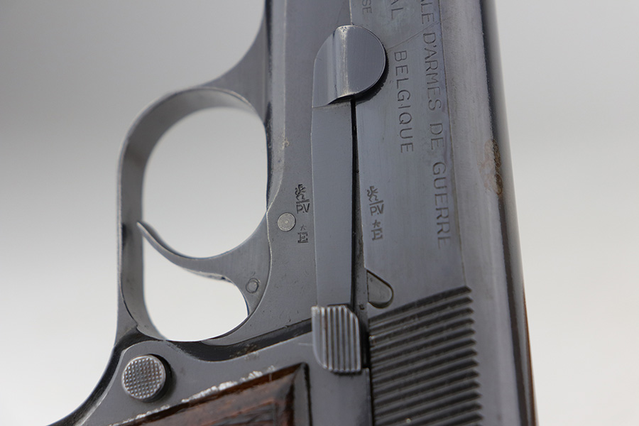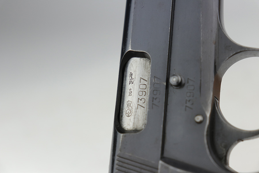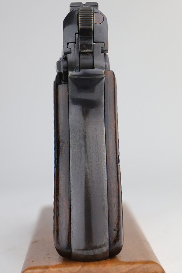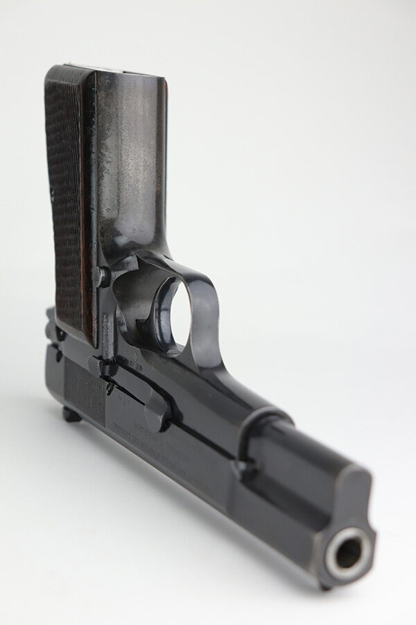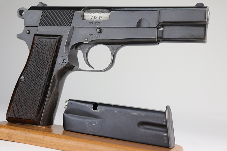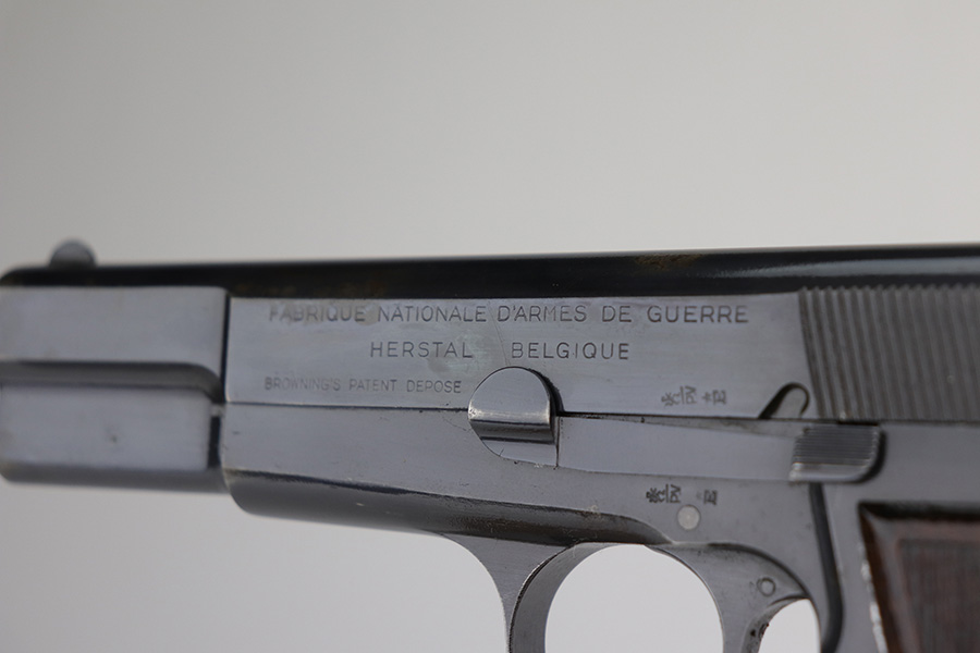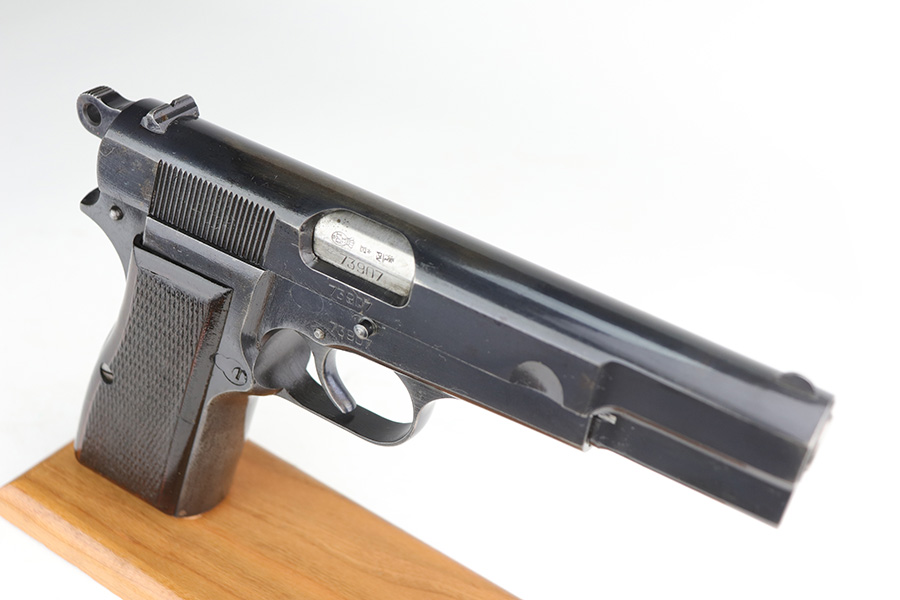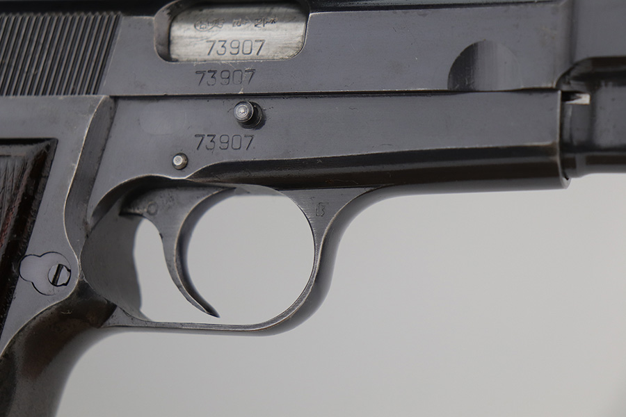 10/11/21 – This is an excellent example of a Belgian Browning Hi Power Pistol manufactured in the 1950’s. The gun is all matching and has the proper Belgian proofs. It has retained roughly 80% of its original finish. Most of the finish loss is on the grip straps, where there is also some splotchy discoloration. Minor wear around the high edges and the muzzle. There are areas of spotty discoloration and oxidation here and there, most noticeable on the whole right side of the slide, on the top of the slide, at the back of the right side of the slide, and on the right side of the frame, around the grip. Comes with very nice wood grips (minor dings and bruises) and a proper magazine. The bore is excellent – shiny with strong rifling. The magazine release button is a little stiff but functional.