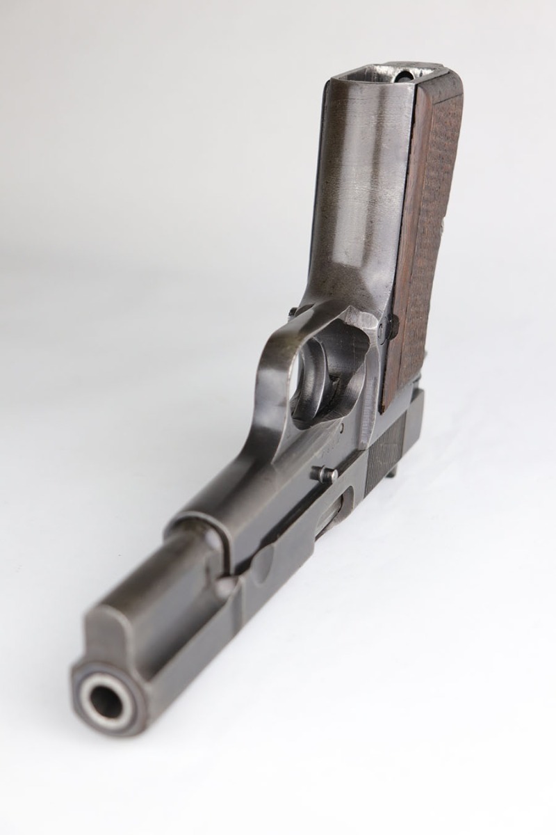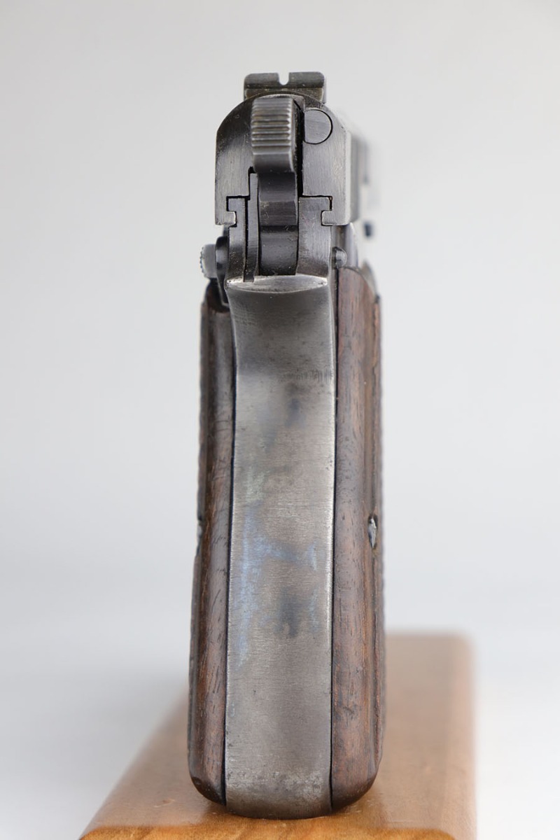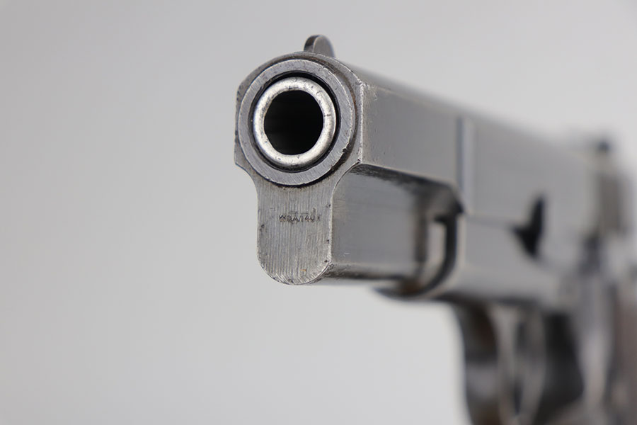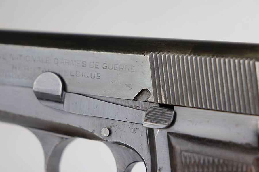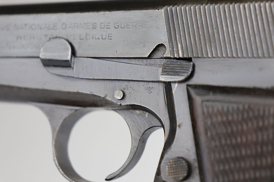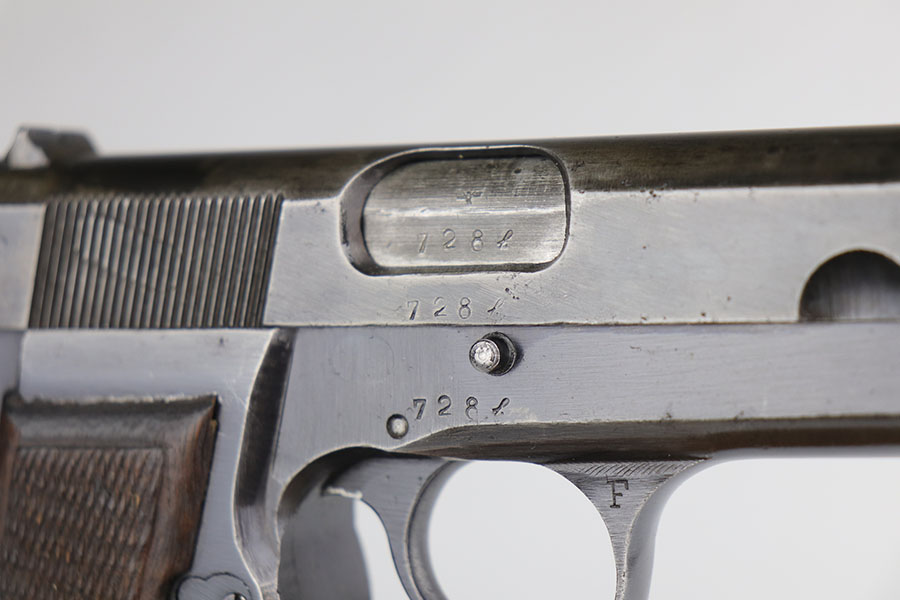 5/6/20 – This is an all matching and original FN Browning High Power that was sent to the German Army during WW2. The pistol shows some obvious bluing loss, mostly on the straps and right side of the slide. There’s also a couple of small areas with surface freckling on the slide. WaA140 proofs on slide and frame. No waffenamt on mag. Bore has strong rifling but some frost and freckling in the grooves. Nice wood grips.
