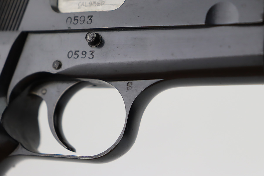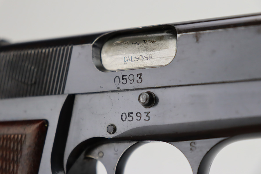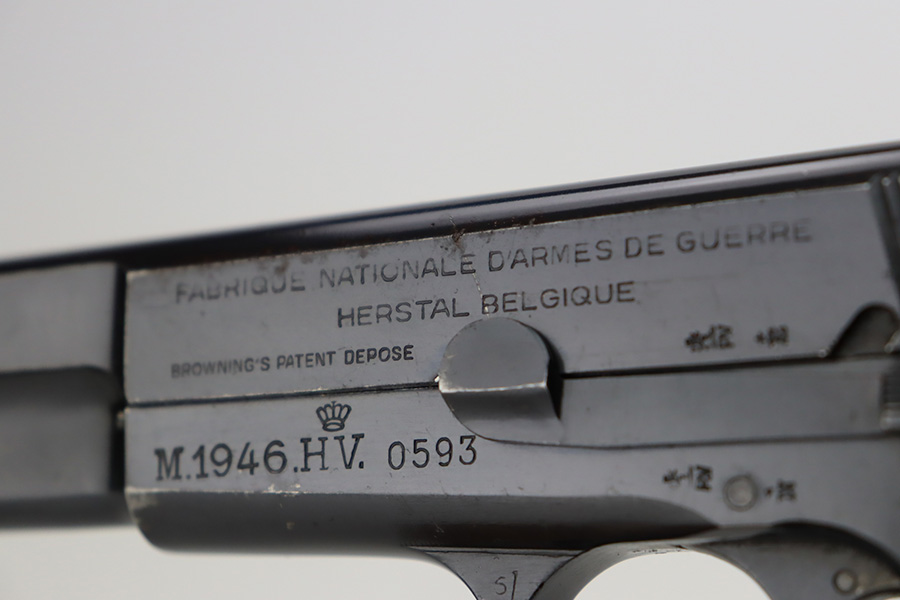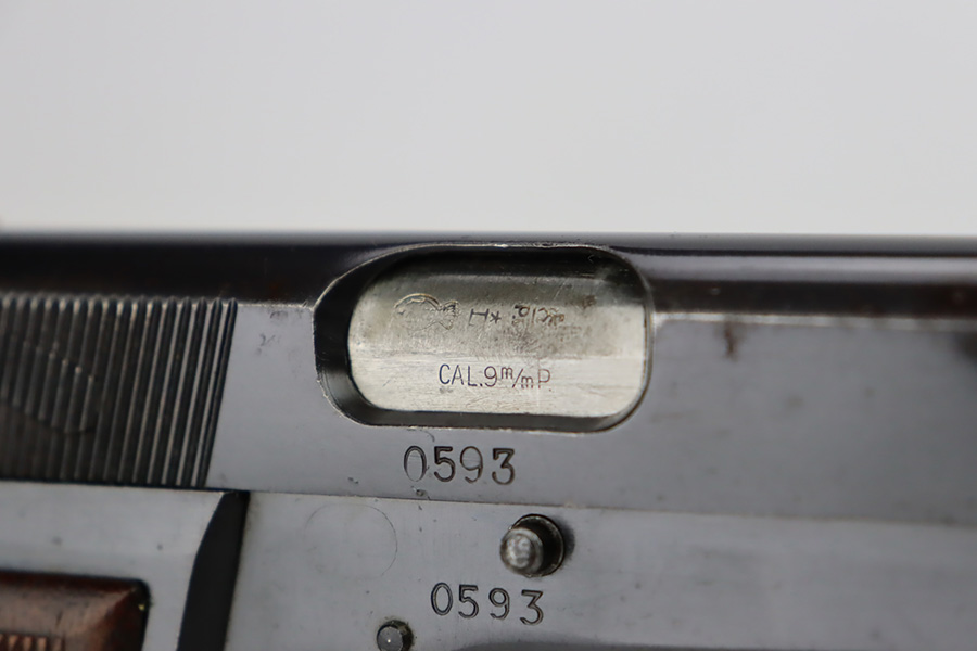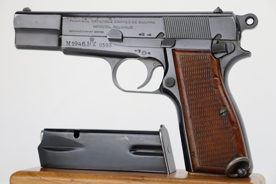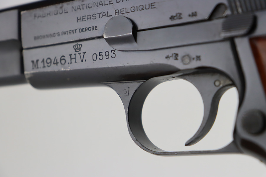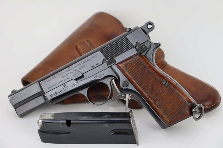 9/27/23 – This is an excellent example of an FN Browning High Power rig issued to the Danish military in 1946. It is all matching and has the proper “Crown HV” Danish military proof as well as Belgian manufacturing proofs. It also has a Danish lanyard ring. The rig comes with a rare Danish military holster that has the proper “Crown HV” proof, one magazine, and a cleaning rod. The gun has retained about 96-97% of its original finish with minor wear around the high edges. While there is very little actual finish loss, there are small spots of oxidation and tiny pits here and there. Fitted with period-correct wood grips – there is a crack on the right side. Mint bore.