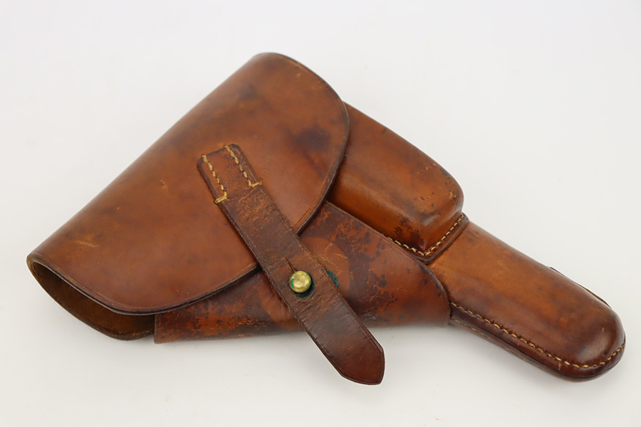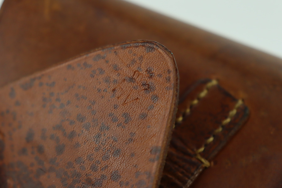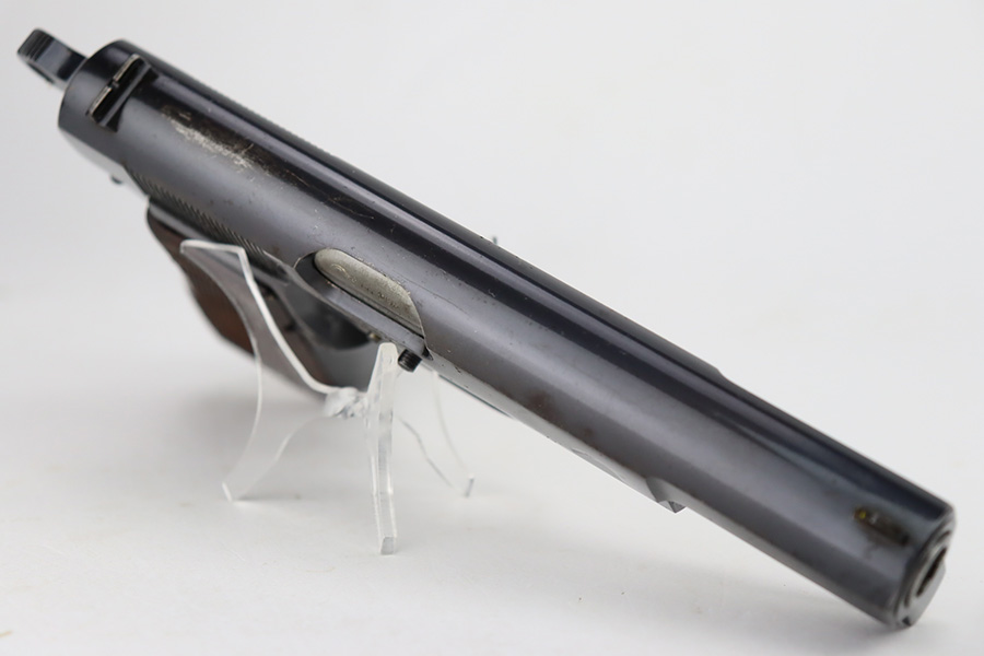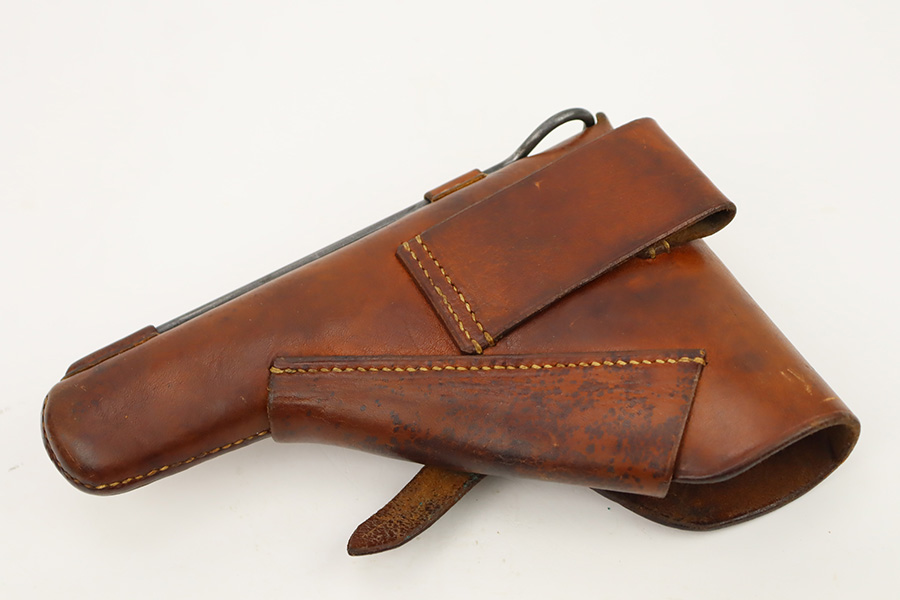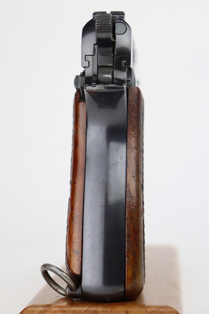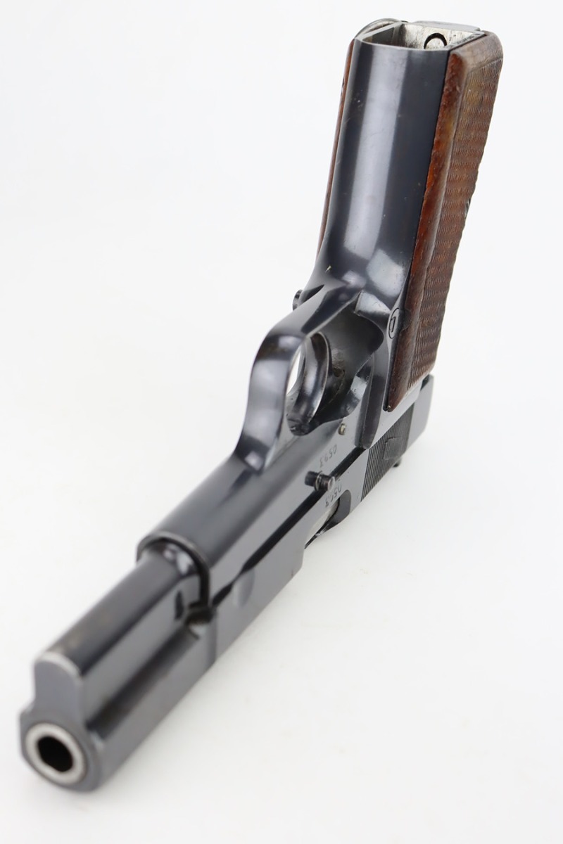 9/27/23 – This is an excellent example of an FN Browning High Power rig issued to the Danish military in 1946. It is all matching and has the proper “Crown HV” Danish military proof as well as Belgian manufacturing proofs. It also has a Danish lanyard ring. The rig comes with a rare Danish military holster that has the proper “Crown HV” proof, one magazine, and a cleaning rod. The gun has retained about 96-97% of its original finish with minor wear around the high edges. While there is very little actual finish loss, there are small spots of oxidation and tiny pits here and there. Fitted with period-correct wood grips – there is a crack on the right side. Mint bore.