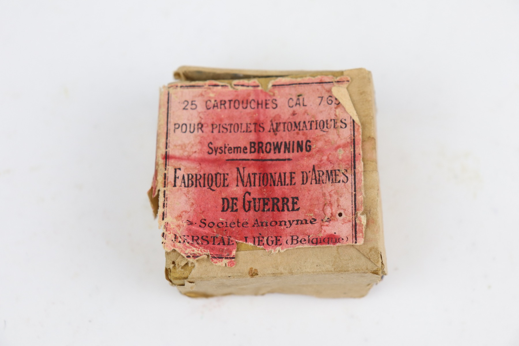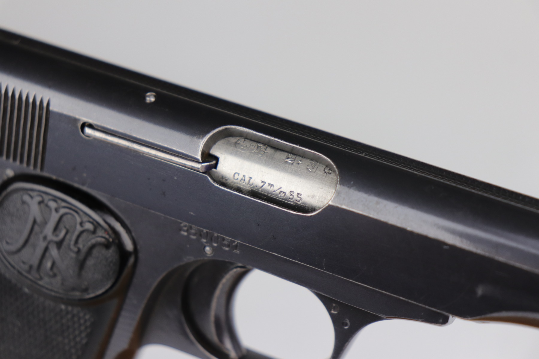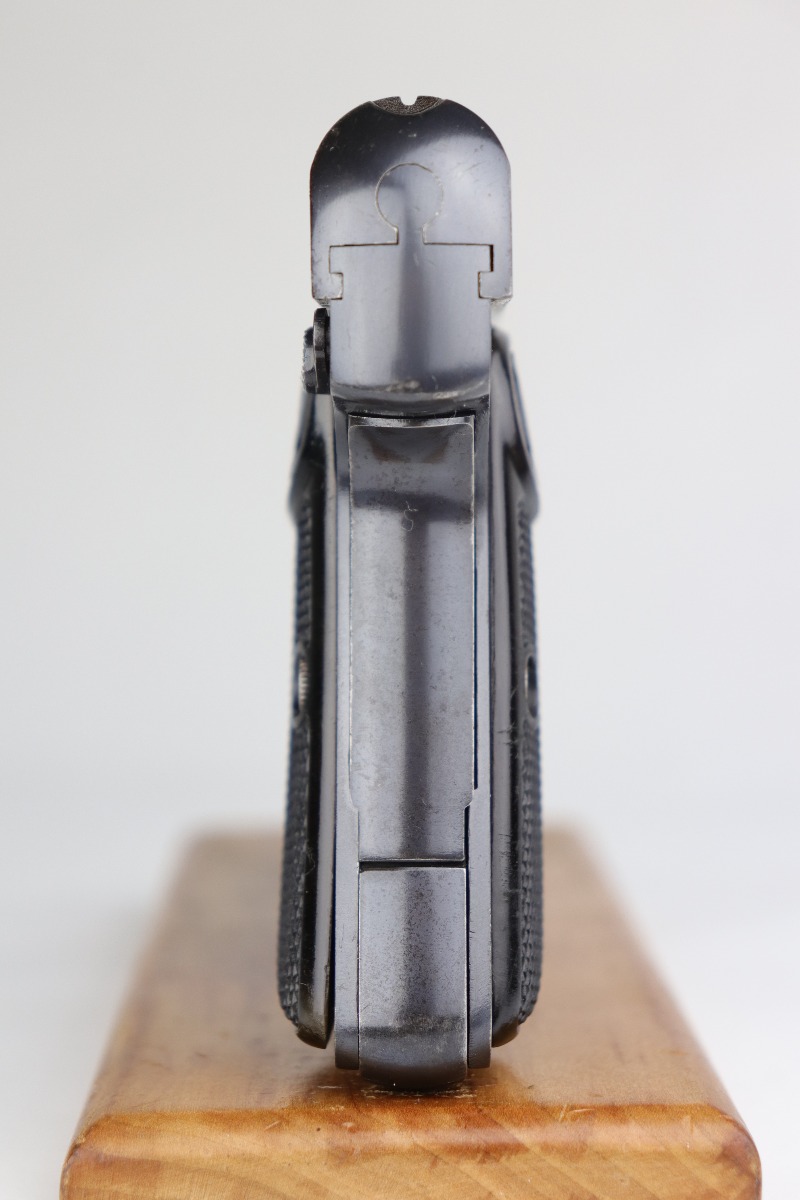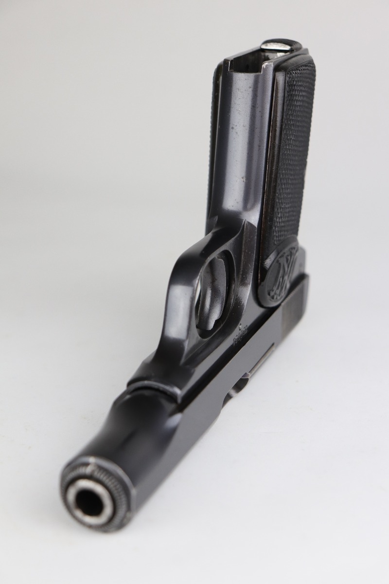 7/10/20 – This is an excellent, original example of an FN Browning M1910 rig. The gun has retained about 98% of its original bluing – very little actual finish loss. There is very minor high edge and muzzle wear and very light freckling on the straps. The grips are excellent. The bore is shiny with strong rifling. The rig comes with two proper magazines and a holster. The holster has kanji markings but can not be certain if this was part of the rare Japanese contract. This listing also includes a rare box of original ammo.