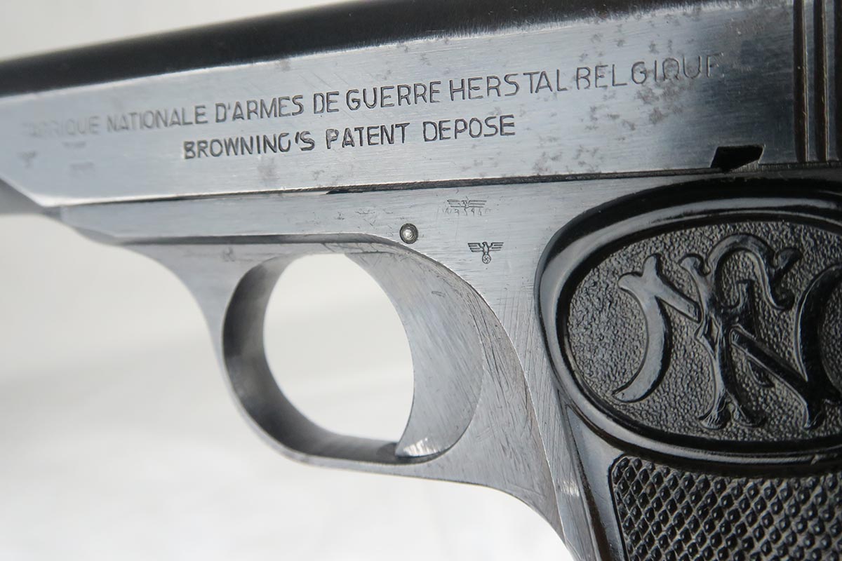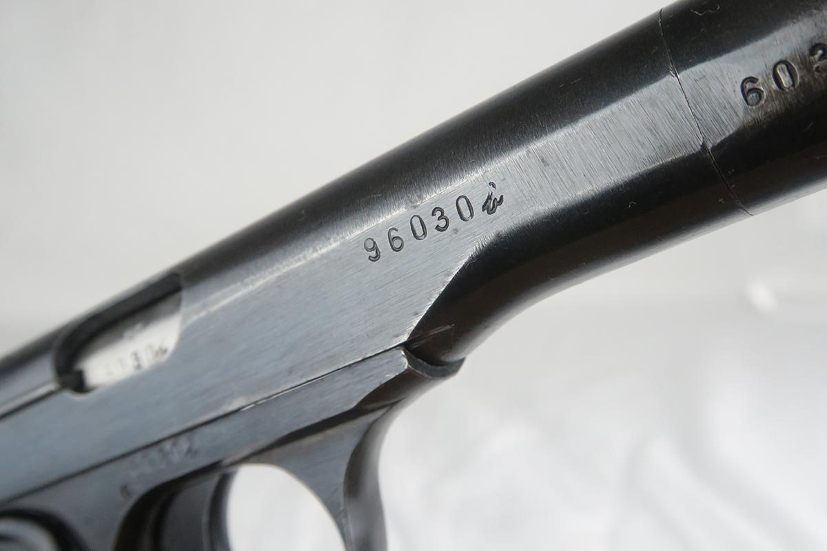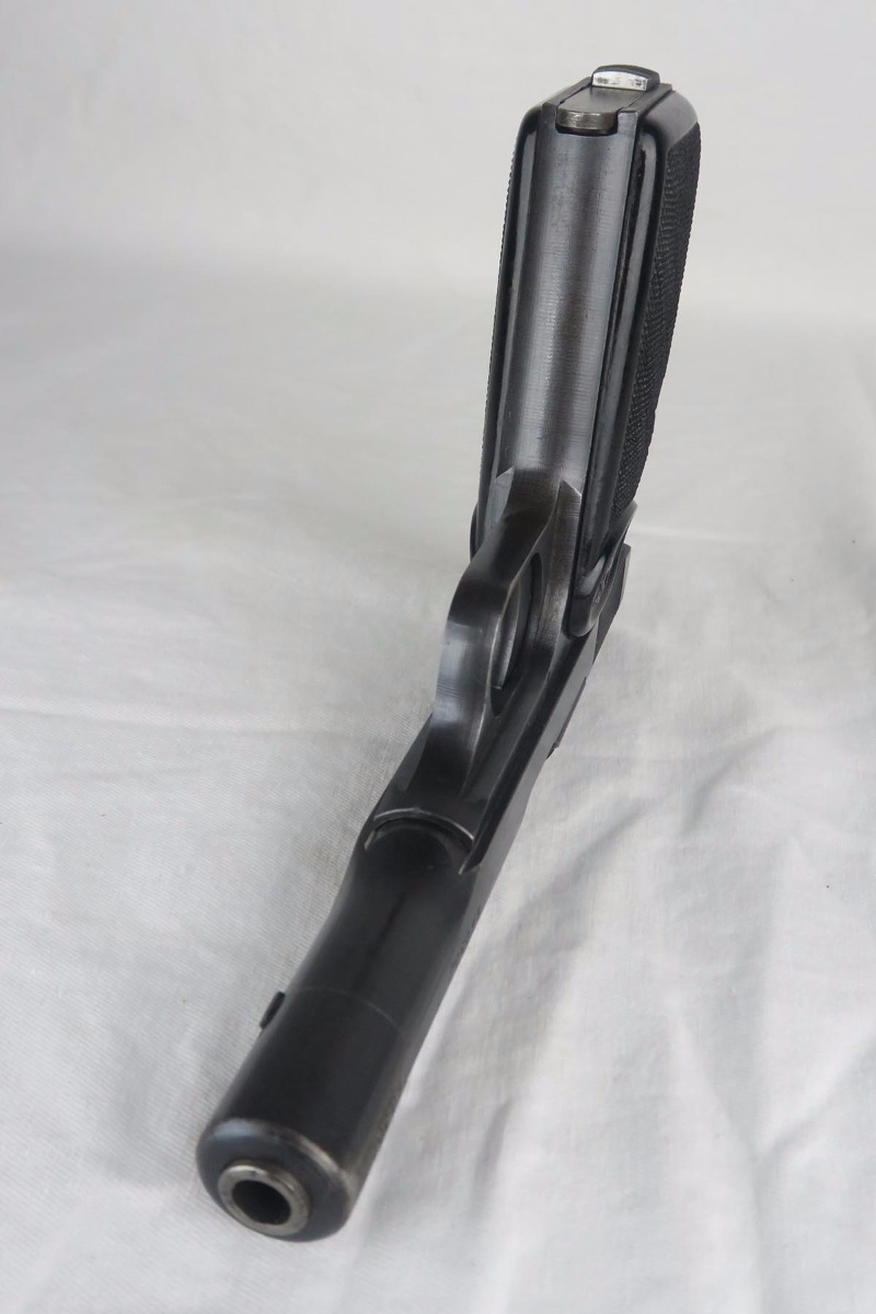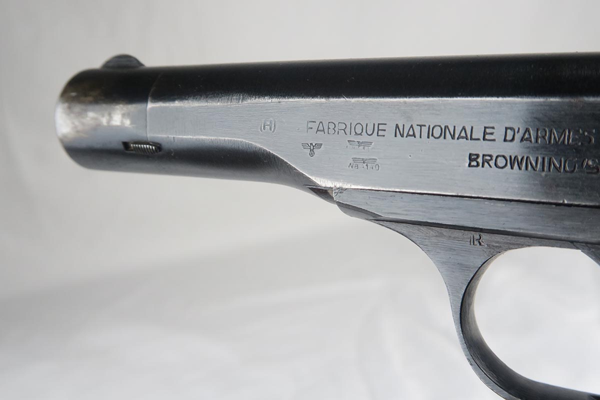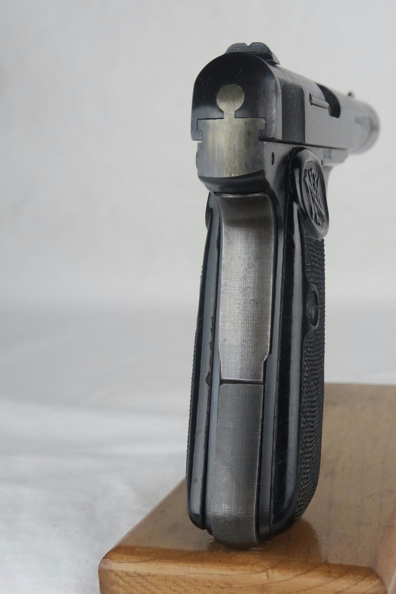 11/29/17 – This is a Nazi Browning M1922 from late in World War 2.  All original and matching with finish in the low 90’s.  The back strap is thin and there is finish loss on both sides of the muzzle.  WaA140 proofed on frame and slide.  Plastic grips are unusual on a 1944 gun but not totally uncommon.  Comes with excellent holster which looks German made and period correct but not positive.  Pistol bore is excellent.