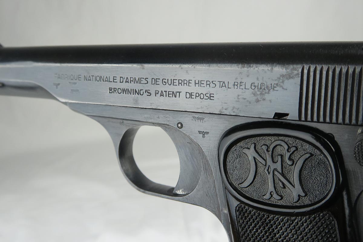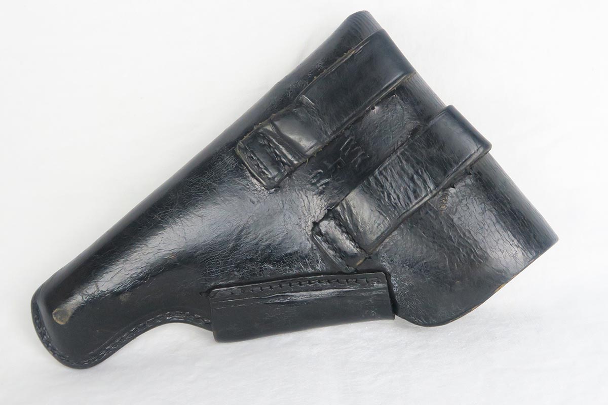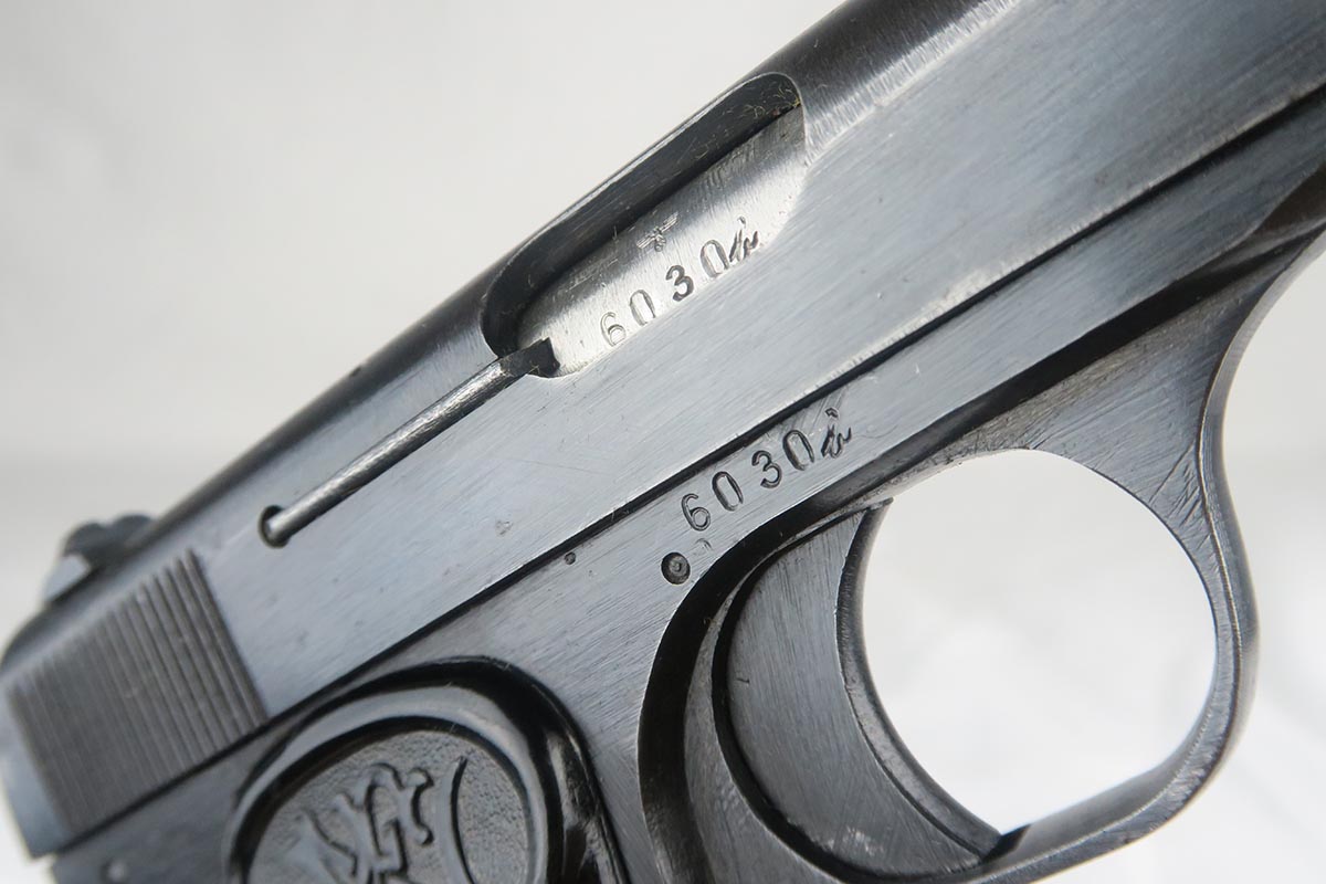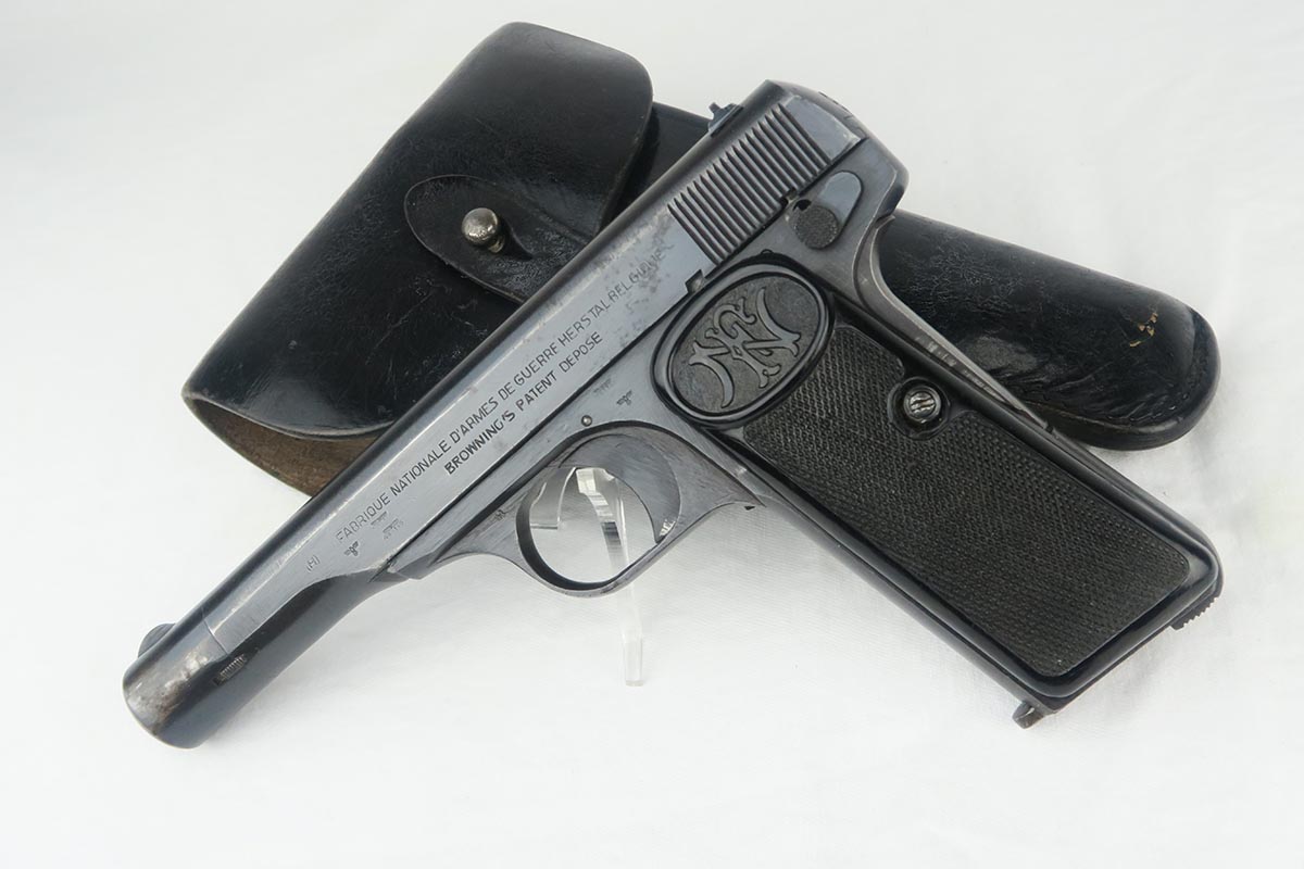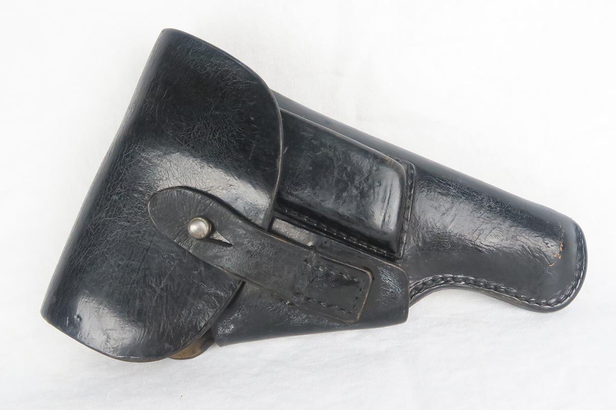 11/29/17 – This is a Nazi Browning M1922 from late in World War 2.  All original and matching with finish in the low 90’s.  The back strap is thin and there is finish loss on both sides of the muzzle.  WaA140 proofed on frame and slide.  Plastic grips are unusual on a 1944 gun but not totally uncommon.  Comes with excellent holster which looks German made and period correct but not positive.  Pistol bore is excellent.
